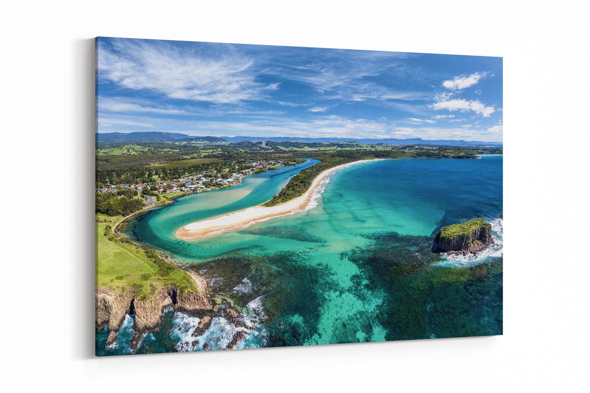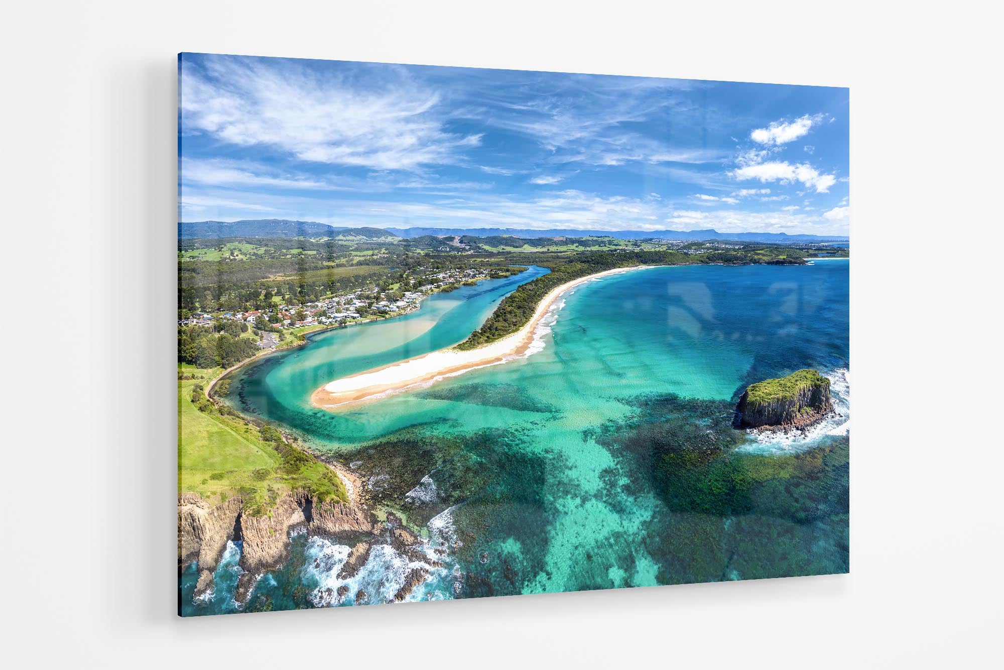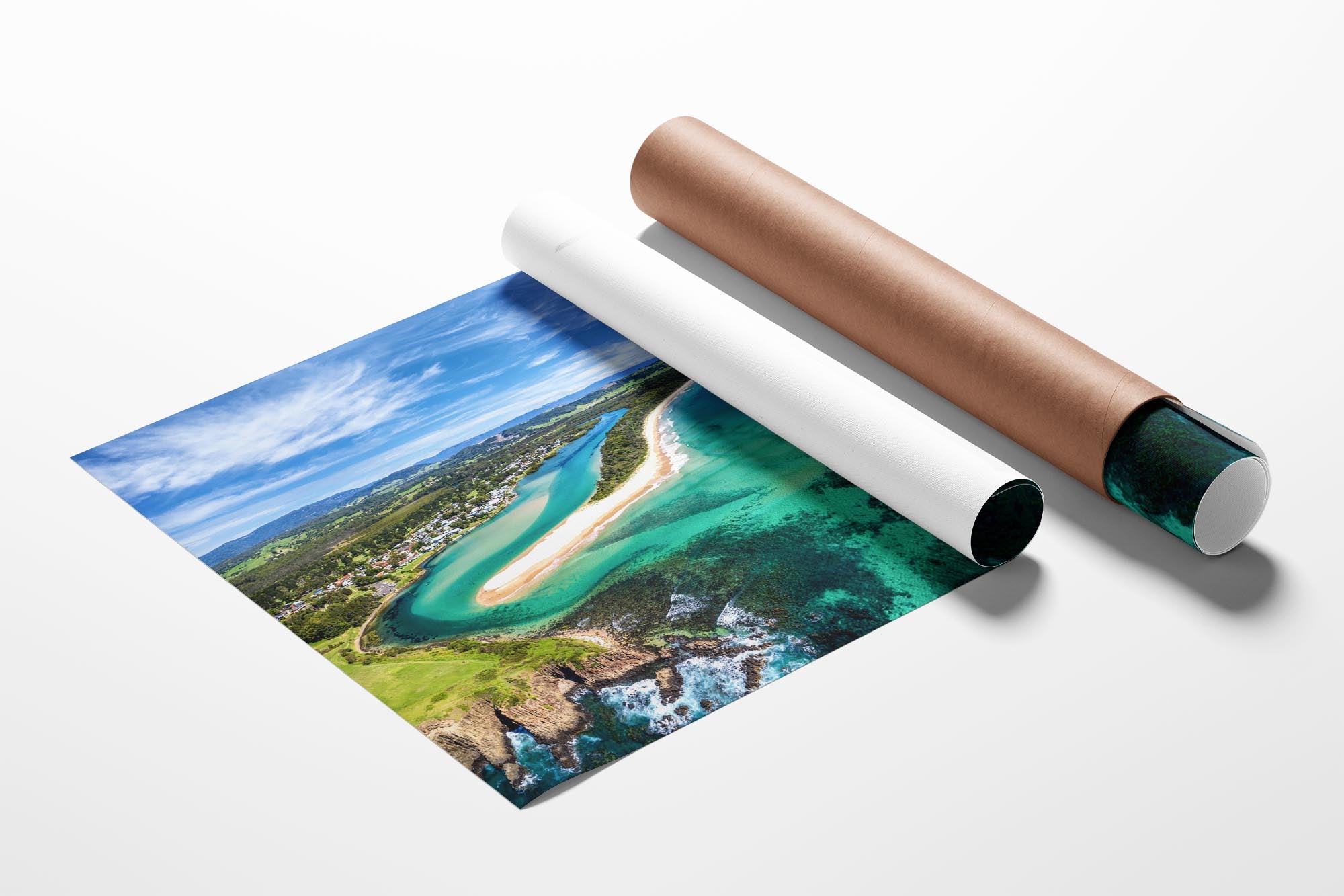 Soar above the Illawarra region with this fine art aerial photo print, capturing the crystal-clear waters of Minnamurra River at high tide as they embrace Mystics Beach and the rugged beauty of Rangoon Island. Shot from a drone, this mesmerising perspective reveals the river’s shimmering channels, the beach’s golden sands, and the island’s lush greenery—a breathtaking showcase of one of New South Wales’ most picturesque coastal landscapes. Its coastal elegance elevates modern interiors, beach houses, or offices with serene sophistication, while serving as a timeless gift for kayakers, ocean lovers, nature enthusiasts, or admirers of Australia’s unspoiled waterways.