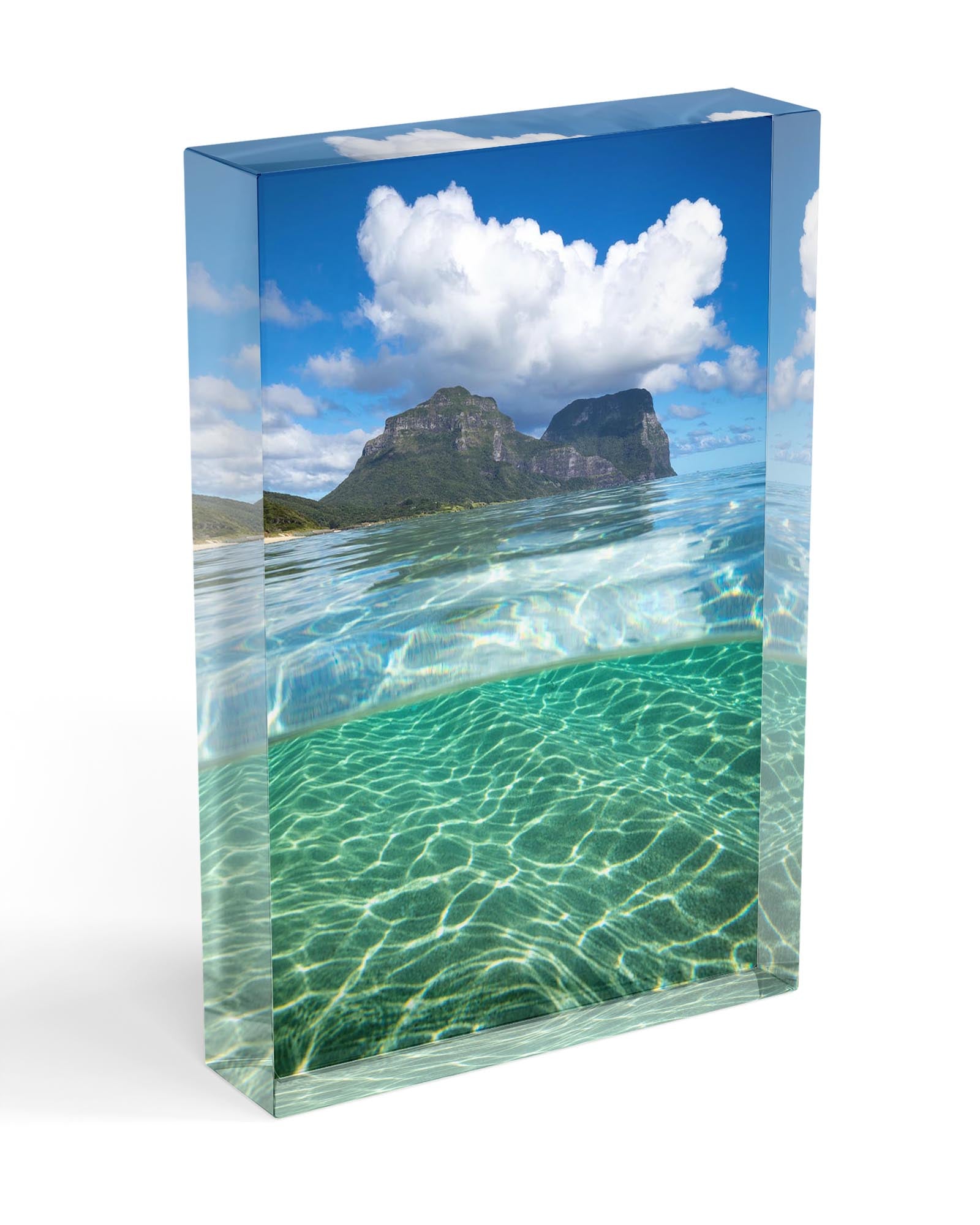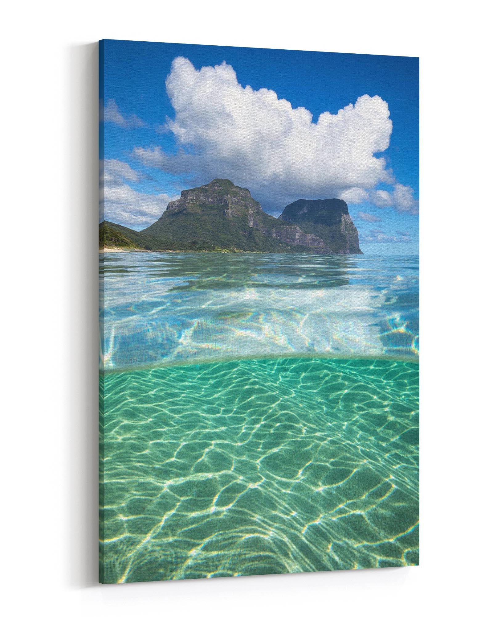 Immerse yourself in the beauty of Lord Howe Island’s UNESCO-listed lagoon with this fine art over-under photo print, capturing the crystal-clear waters of the lagoon and the towering majesty of Mount Gower and Mount Lidgbird in the distance. This unique perspective merges vibrant marine world beneath the surface with the dramatic volcanic peaks above. Expertly captured to elevate modern interiors, coastal homes, or offices with UNESCO-inspired elegance, it doubles as a meaningful gift for divers, eco-travellers, ocean enthusiasts or admirers of Australia’s World Heritage-listed natural treasures.