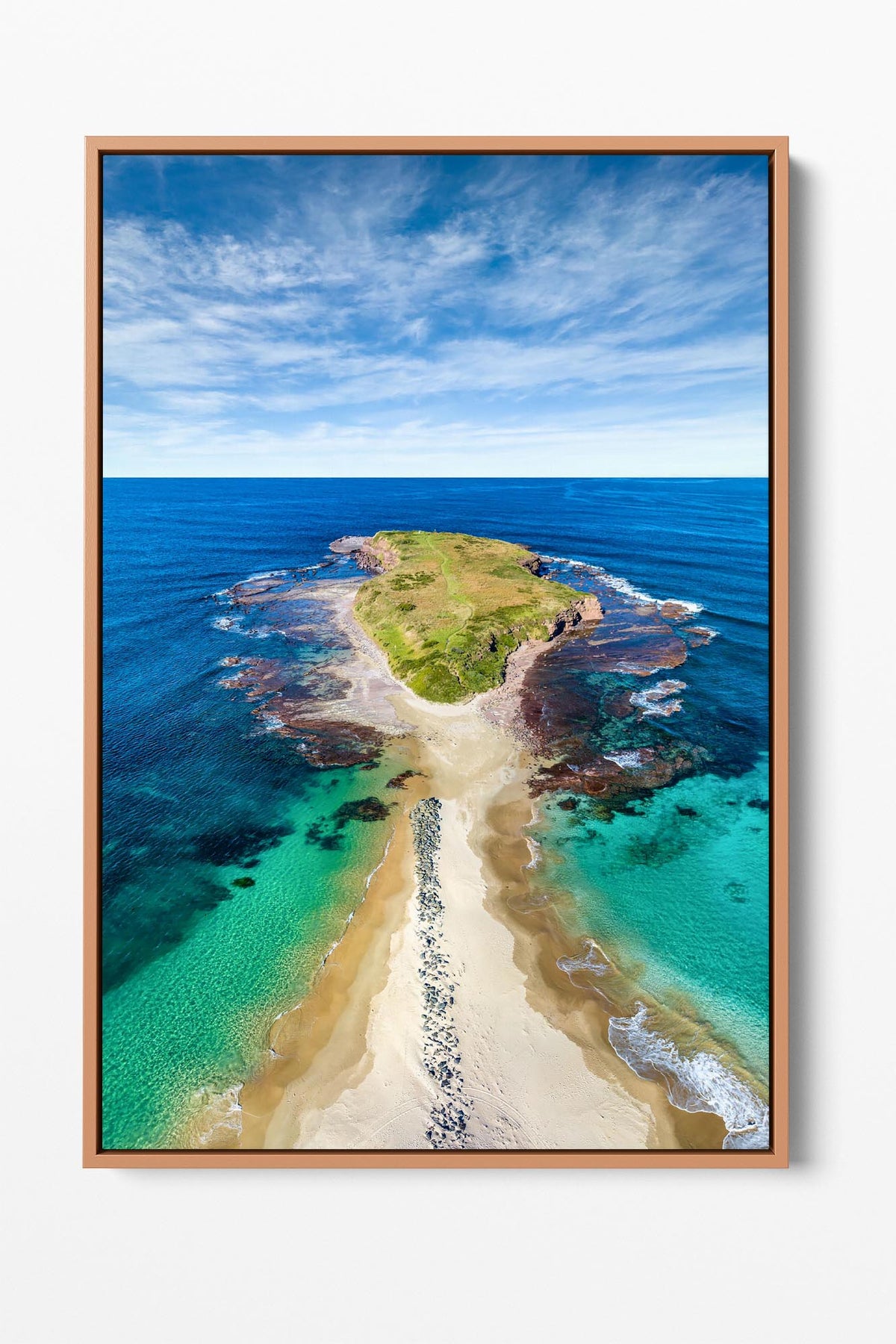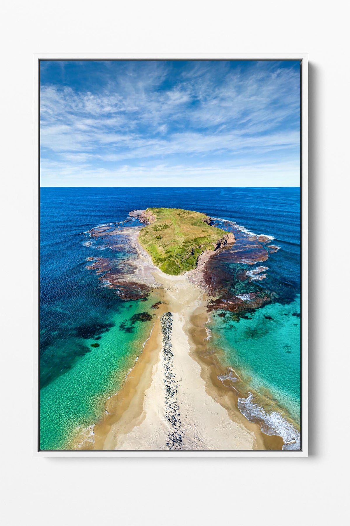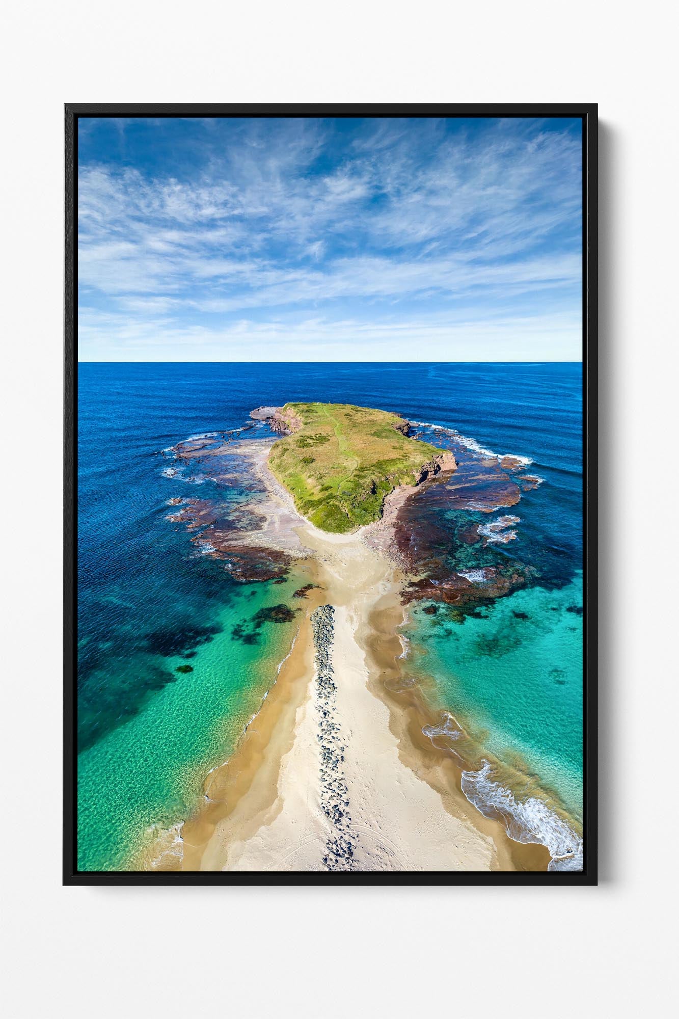 Soar above the Illawarra region with this fine art aerial photo print, capturing the serene beauty of Windang Island and its golden shores at Windang Beach. Shot from a drone, this breathtaking perspective reveals the island’s rugged charm and the endless stretch of turquoise waters that define this iconic coastal landscape. Its coastal elegance elevates modern interiors, beach houses, or offices with timeless tranquility, while serving as a thoughtful gift for surfers, ocean enthusiasts or admirers of the Illawarra’s unspoiled beauty.