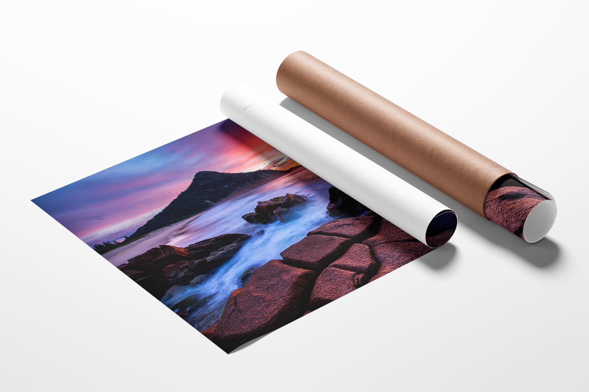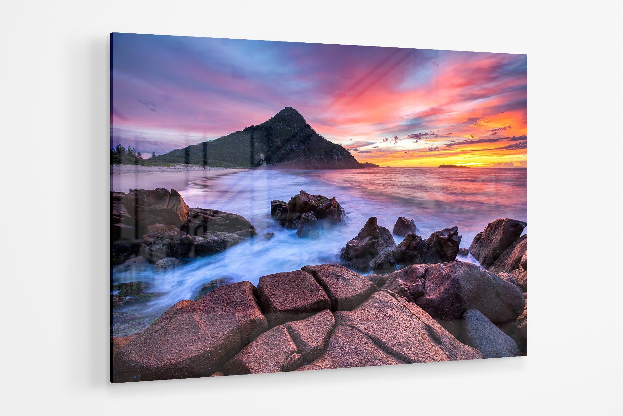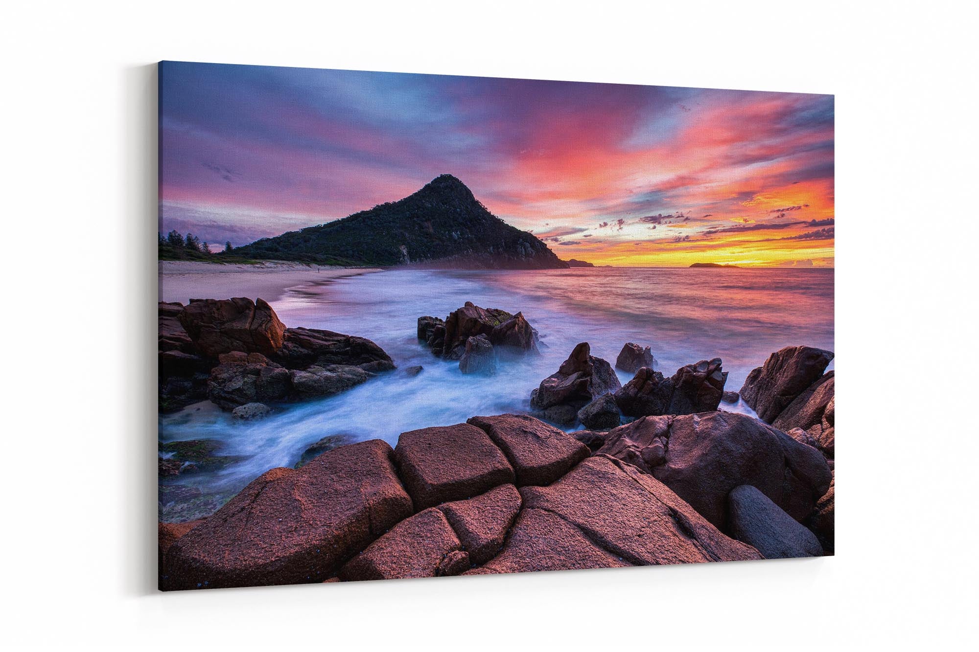 Awaken to the untouched beauty of the NSW Mid North Coast with this vivid sunrise photo print, capturing dawn’s golden light spilling over Zenith Beach’s rocky shores and the majestic silhouette of Tomaree Mountain. Framed by the turquoise waves of Port Stephens, this mesmerising artwork immortalises the rugged coastline, pristine beach, and tranquil energy of one of Australia’s most iconic coastal landscapes