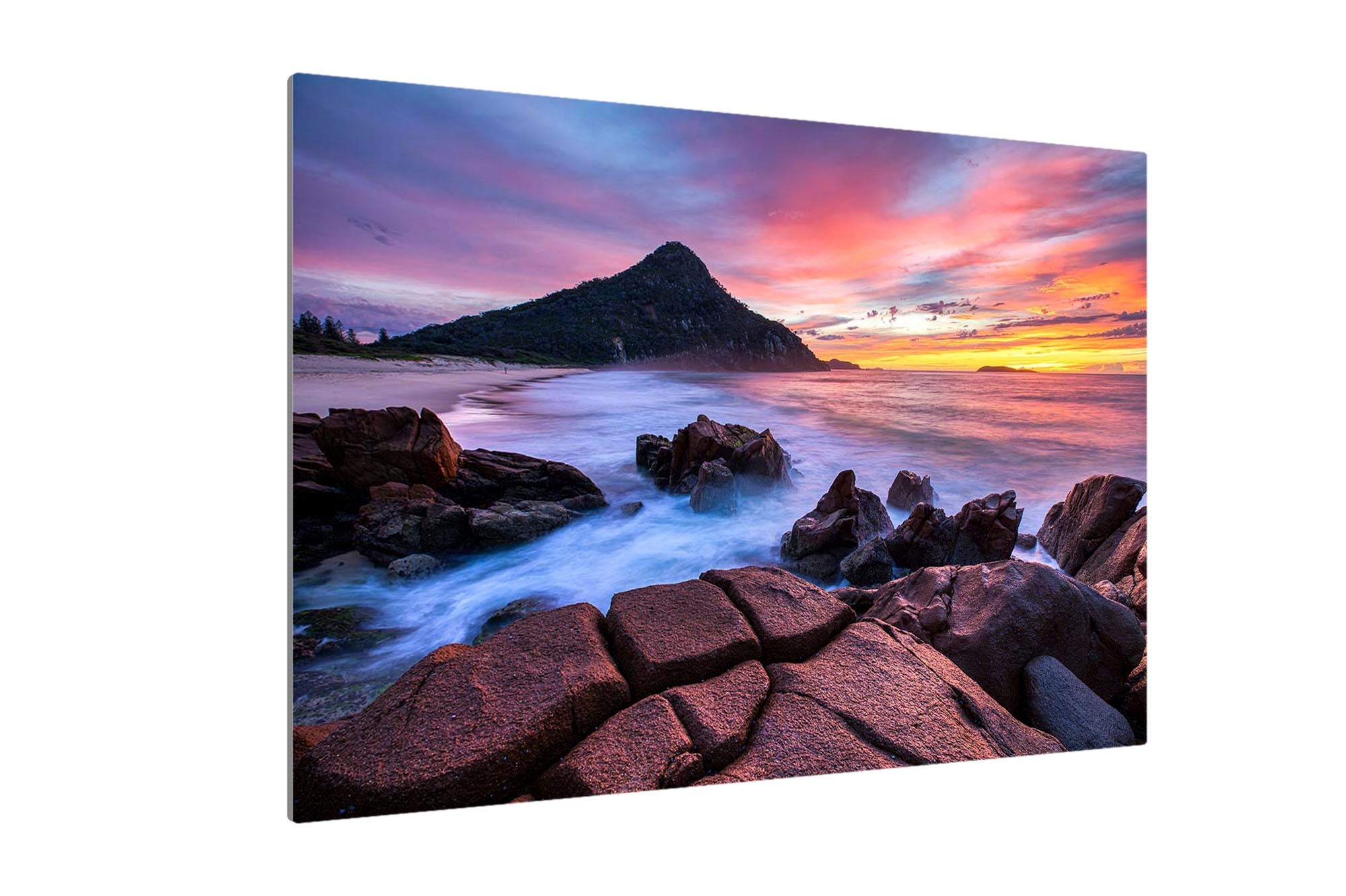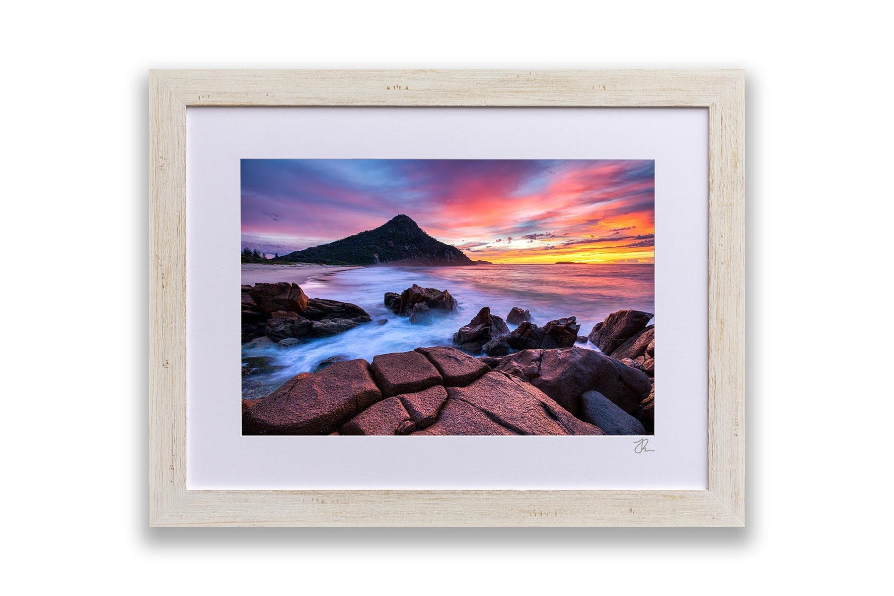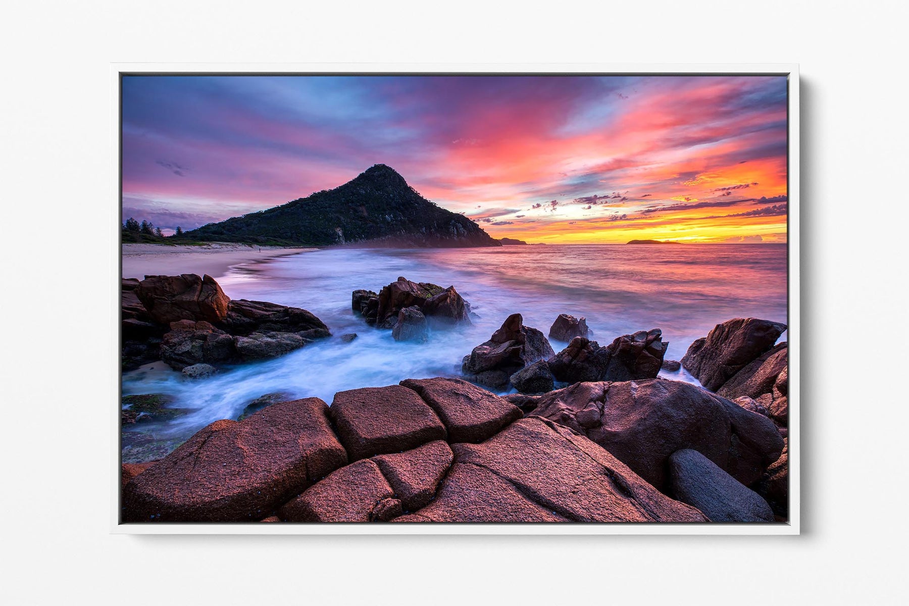 Awaken to the untouched beauty of the NSW Mid North Coast with this vivid sunrise photo print, capturing dawn’s golden light spilling over Zenith Beach’s rocky shores and the majestic silhouette of Tomaree Mountain. Framed by the turquoise waves of Port Stephens, this mesmerising artwork immortalises the rugged coastline, pristine beach, and tranquil energy of one of Australia’s most iconic coastal landscapes