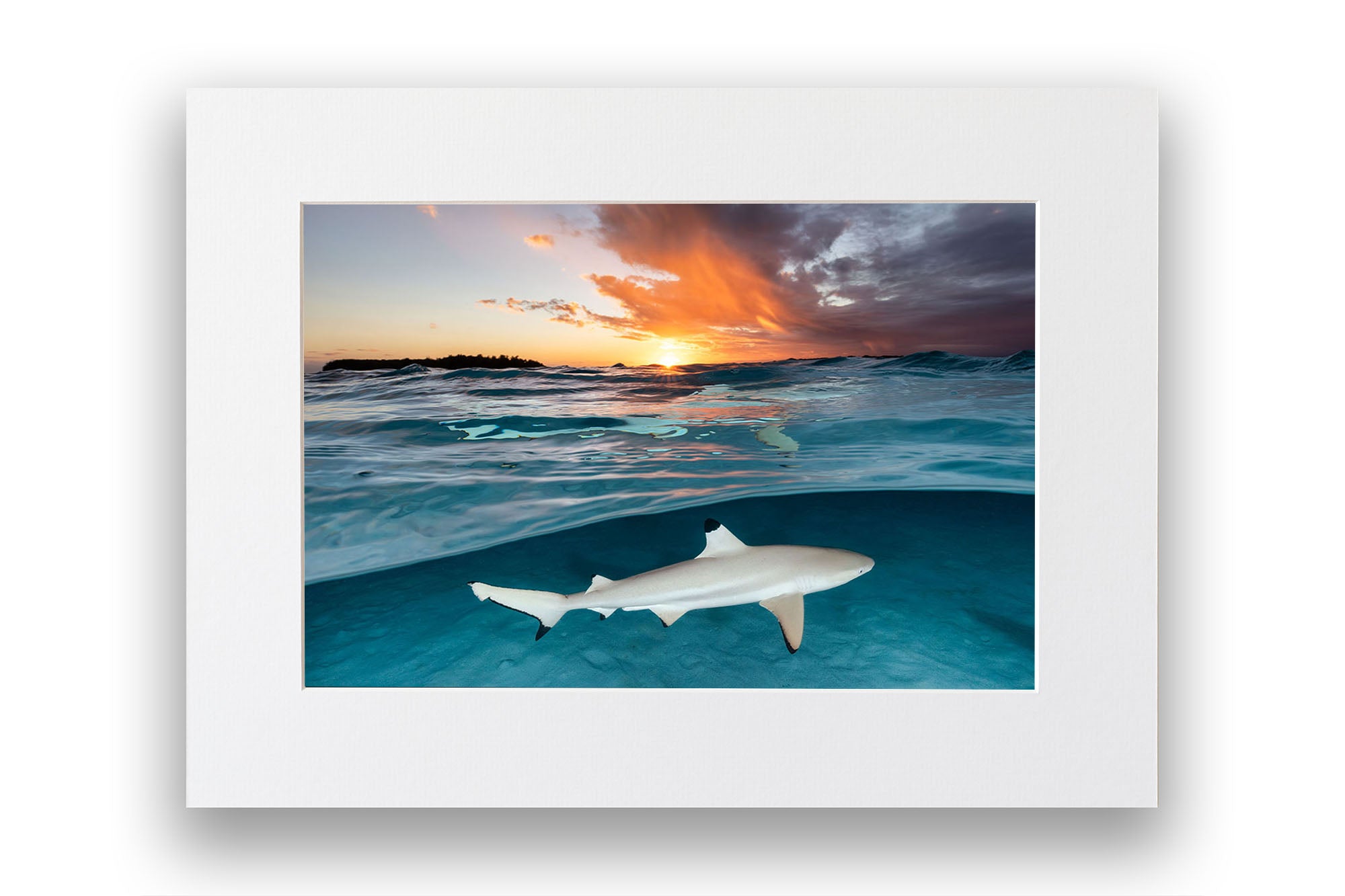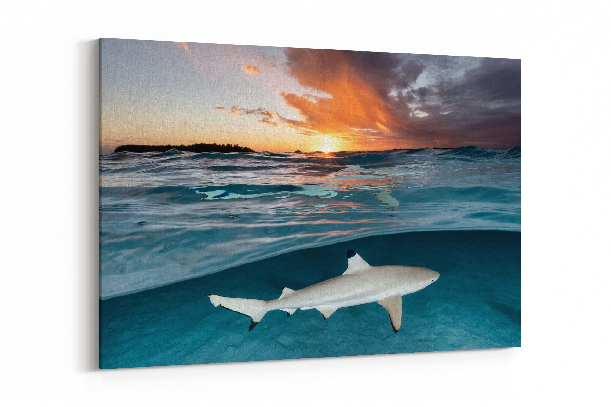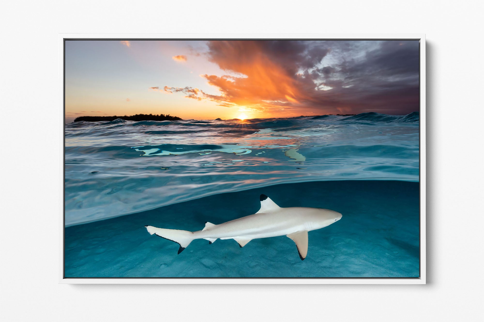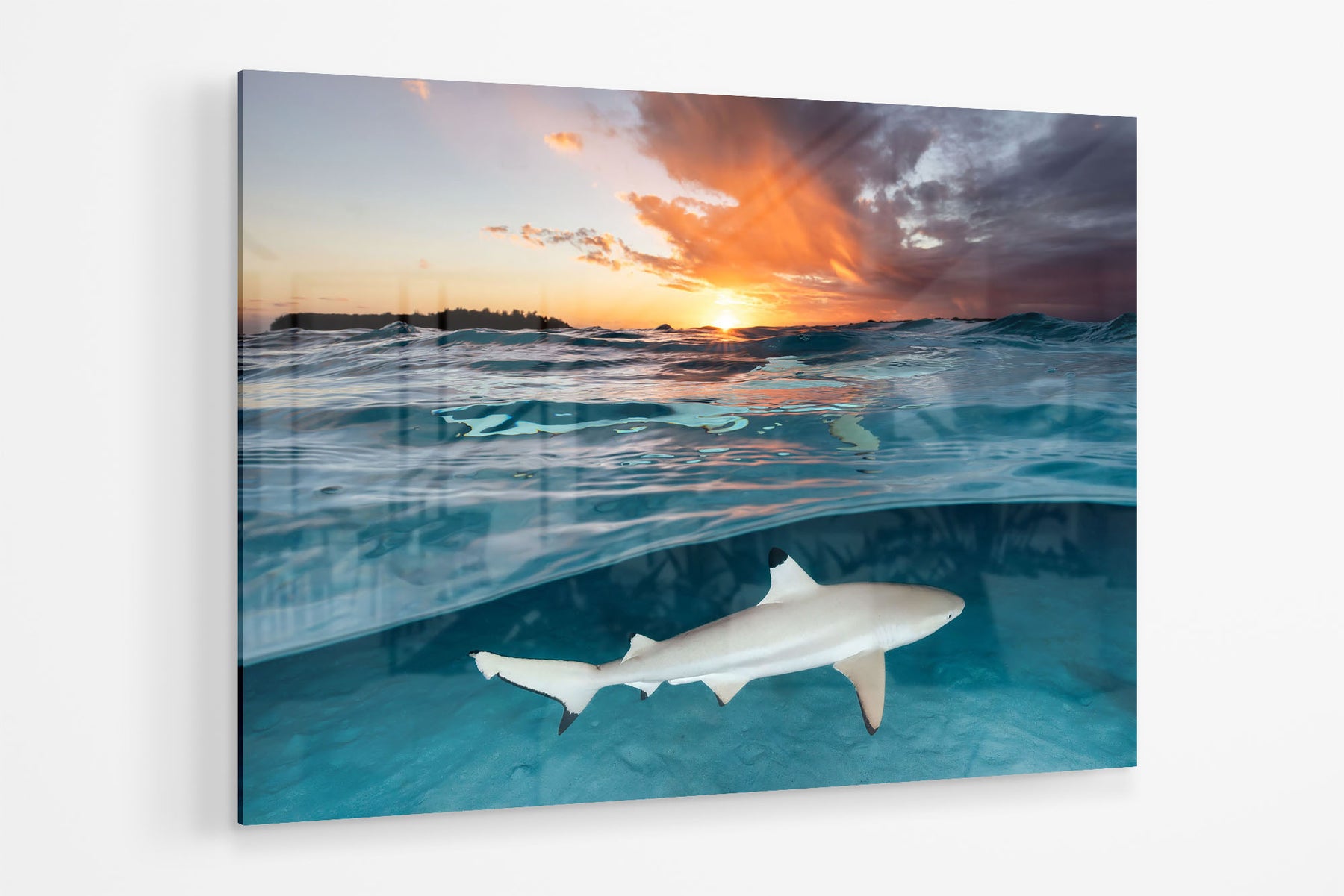 Blacktip Reef Shark Photo Print – Over-Under Image in Moorea Lagoon at Sunset, French Polynesia