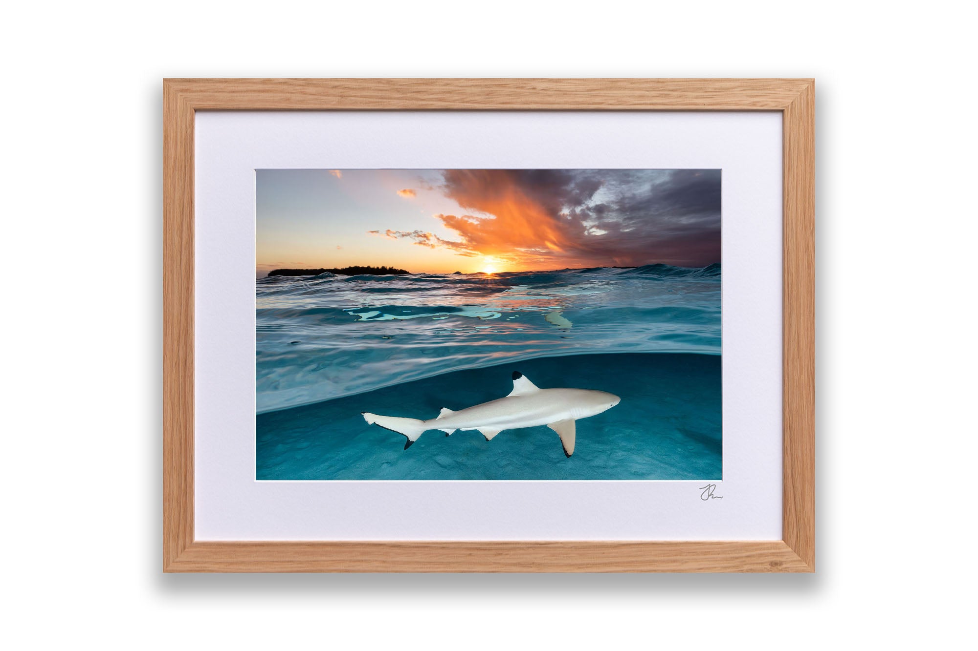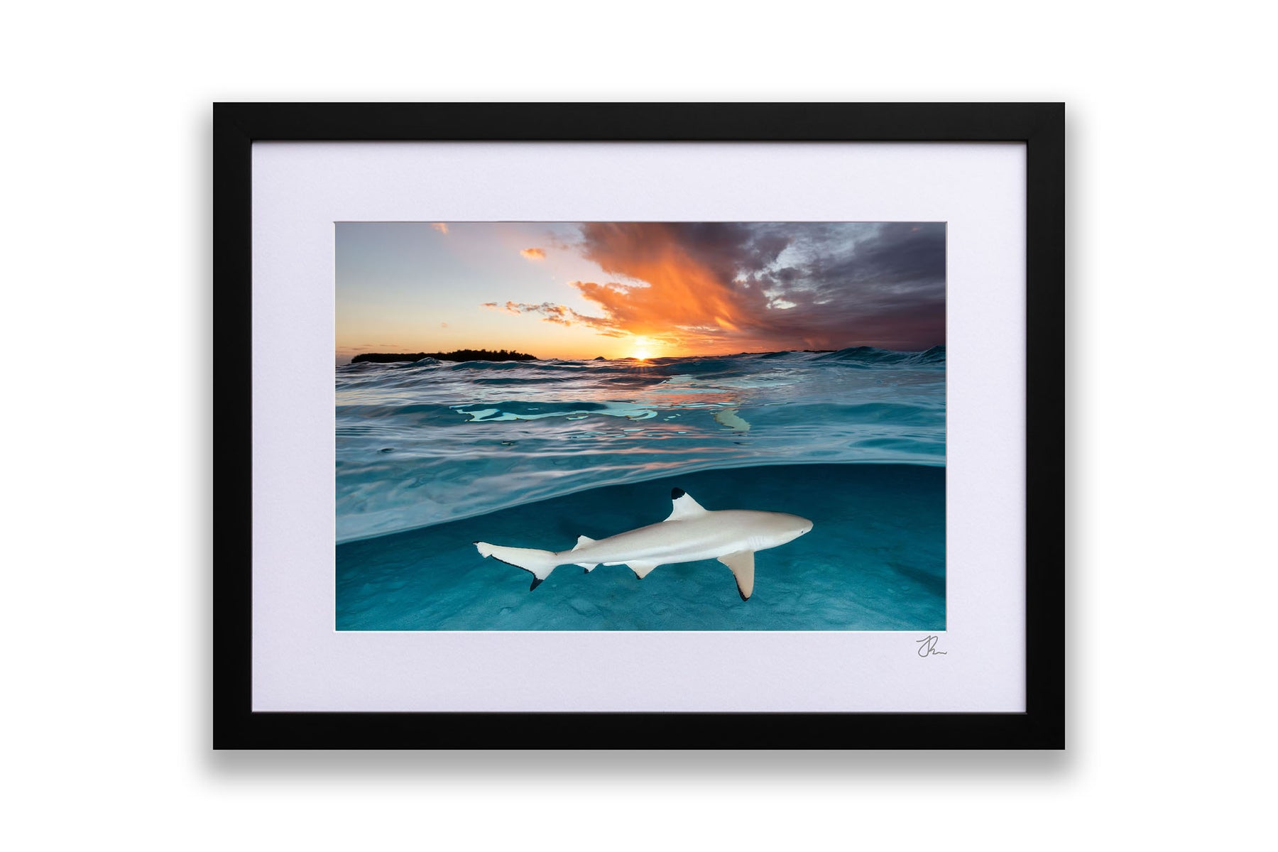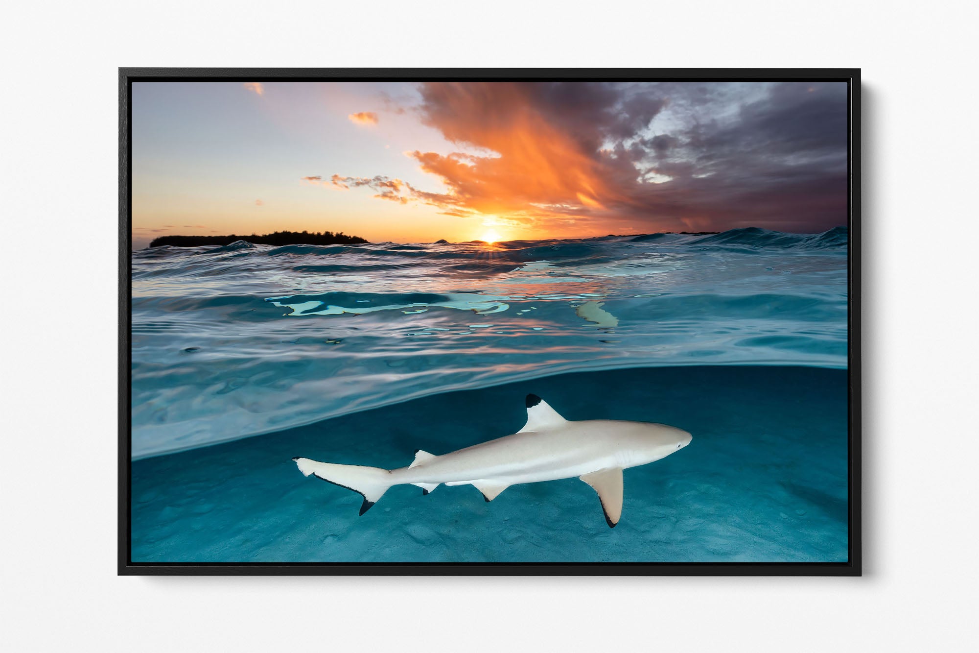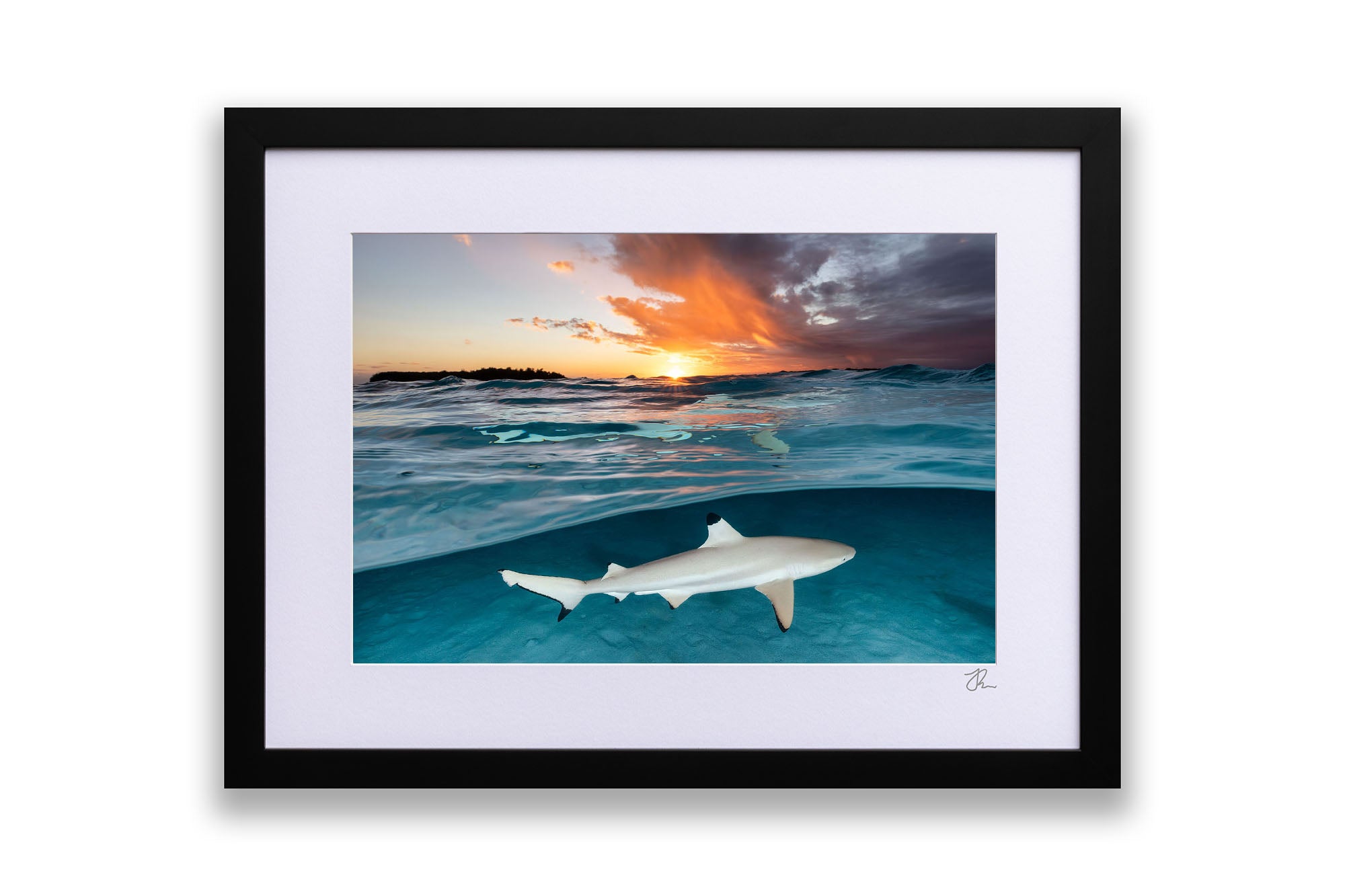 Blacktip Reef Shark Photo Print – Over-Under Image in Moorea Lagoon at Sunset, French Polynesia