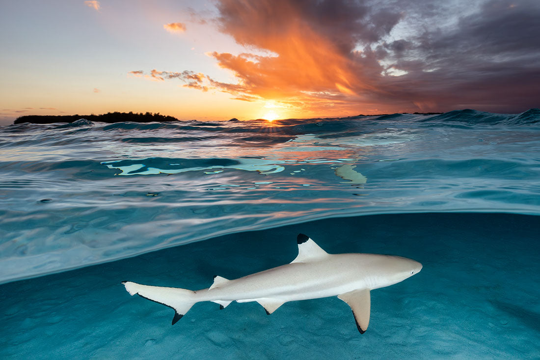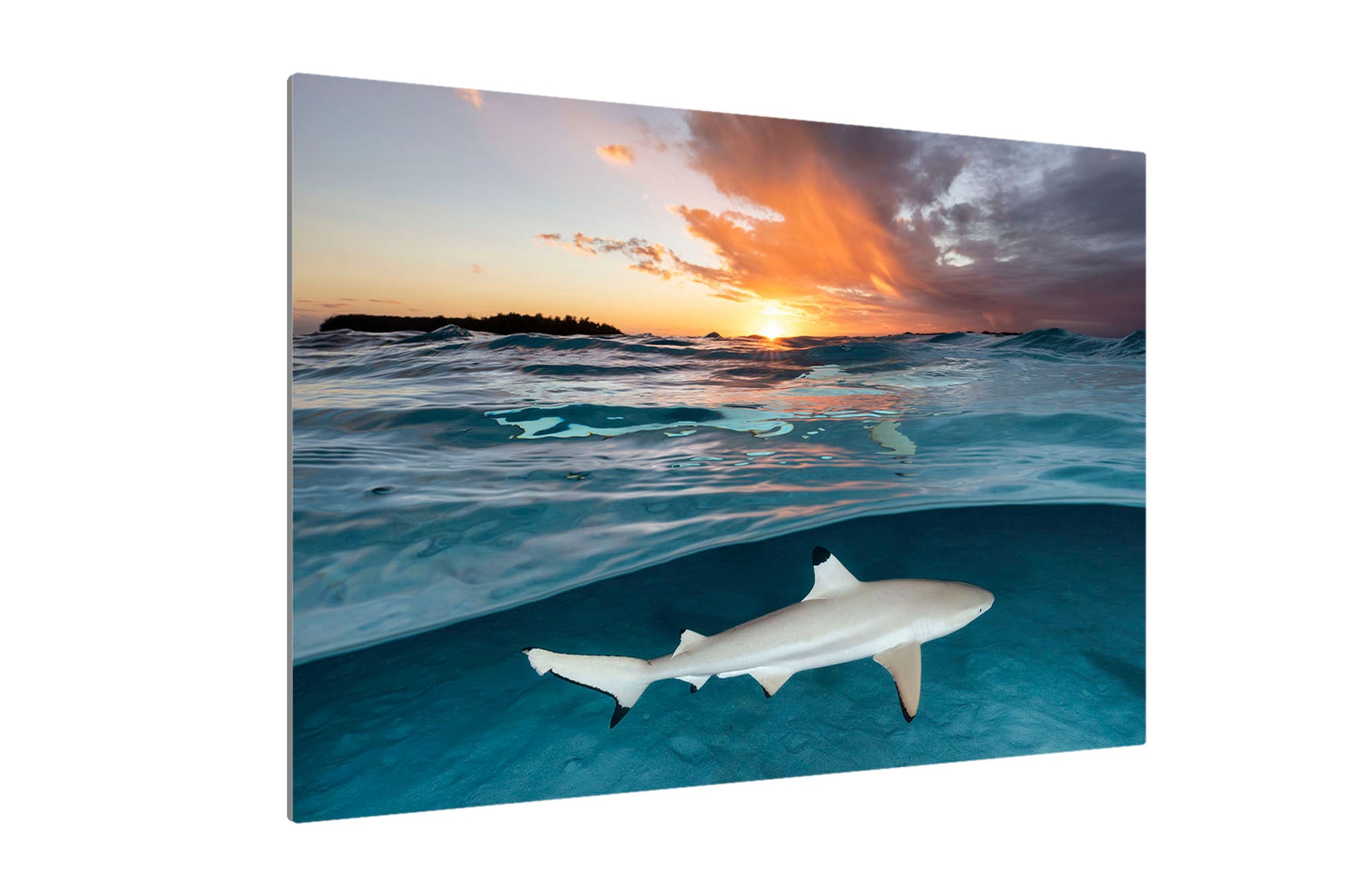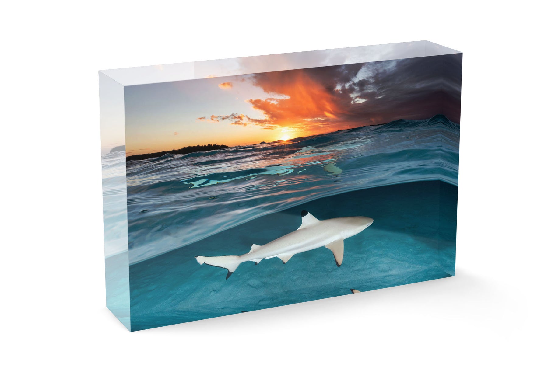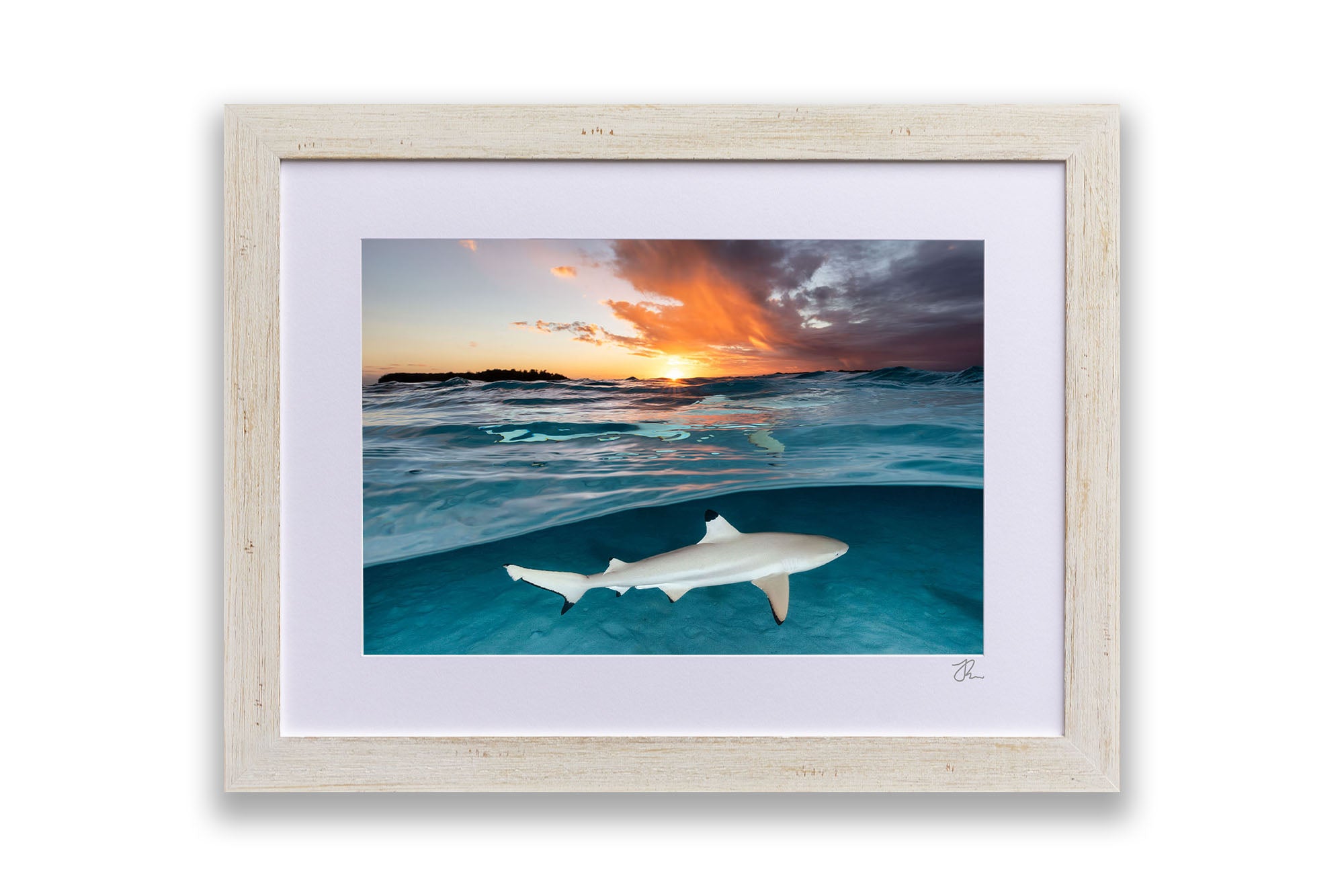 Blacktip Reef Shark Photo Print – Over-Under Image in Moorea Lagoon at Sunset, French Polynesia