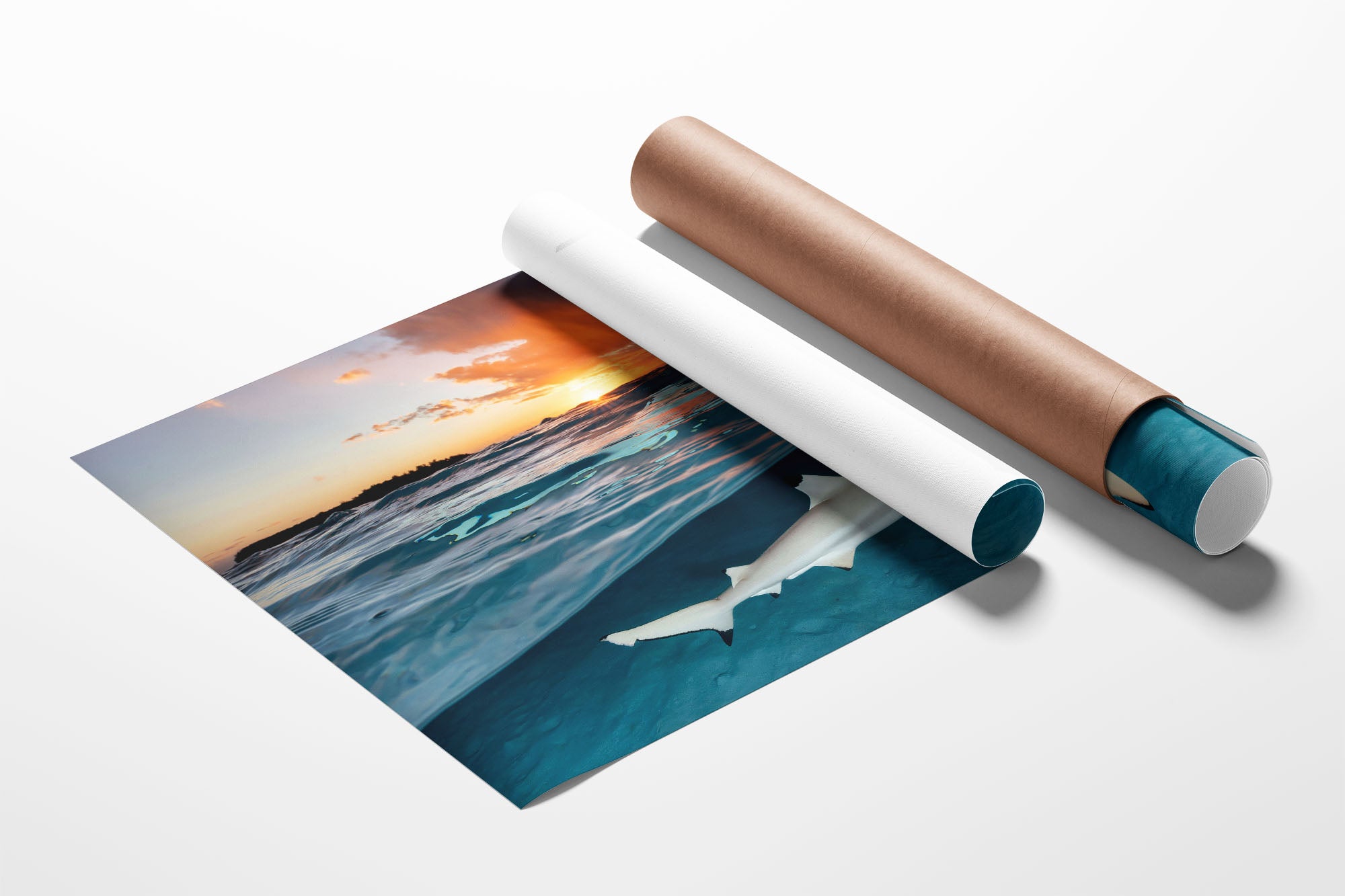 Experience the beauty of a Blacktip Reef Shark in this stunning over-under photo print, captured as the shark swims gracefully through the crystal-clear waters of Moorea’s lagoon at sunset. This breathtaking image showcases the serene marine wildlife of French Polynesia, highlighting the dynamic contrast between the underwater world and the glowing golden sunset above. Perfect for ocean enthusiasts, shark lovers and anyone captivated by the wonders of the South Pacific.