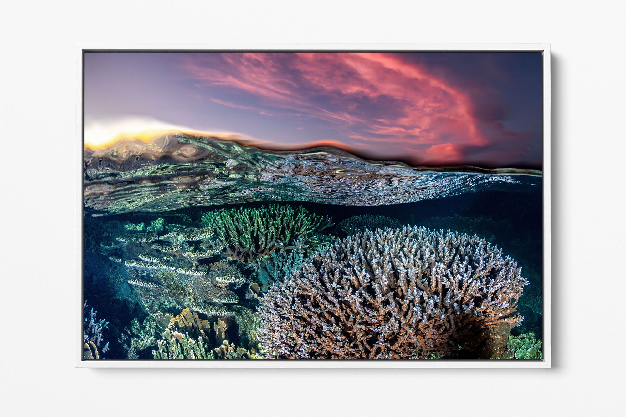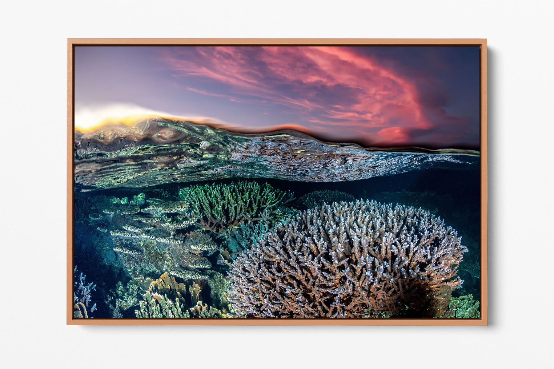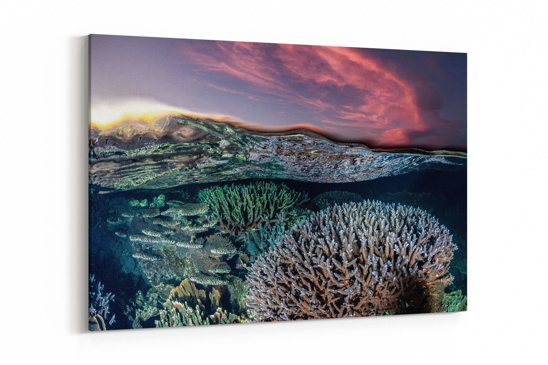 This breathtaking over-under photography print captures the fiery hues of a vivid sunset melting into the turquoise shallows above Ningaloo Reef’s thriving coral gardens near Coral Bay, Western Australia. The split-shot composition masterfully contrasts the golden-pink skies and mirrored surface reflections with the reef’s kaleidoscopic textures.