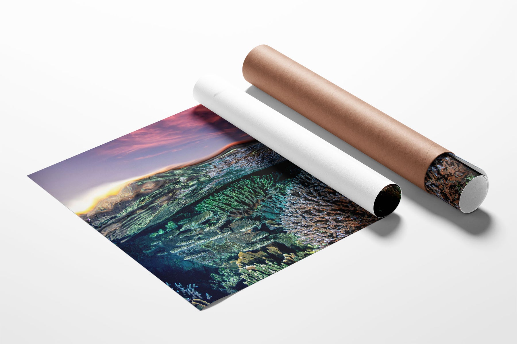 Shop now—this archival-quality print merges golden-hour skies with underwater wonder, transforming walls into windows of coastal magic, perfect for homes or offices.