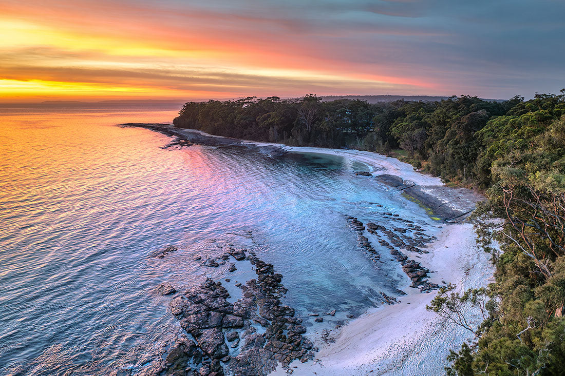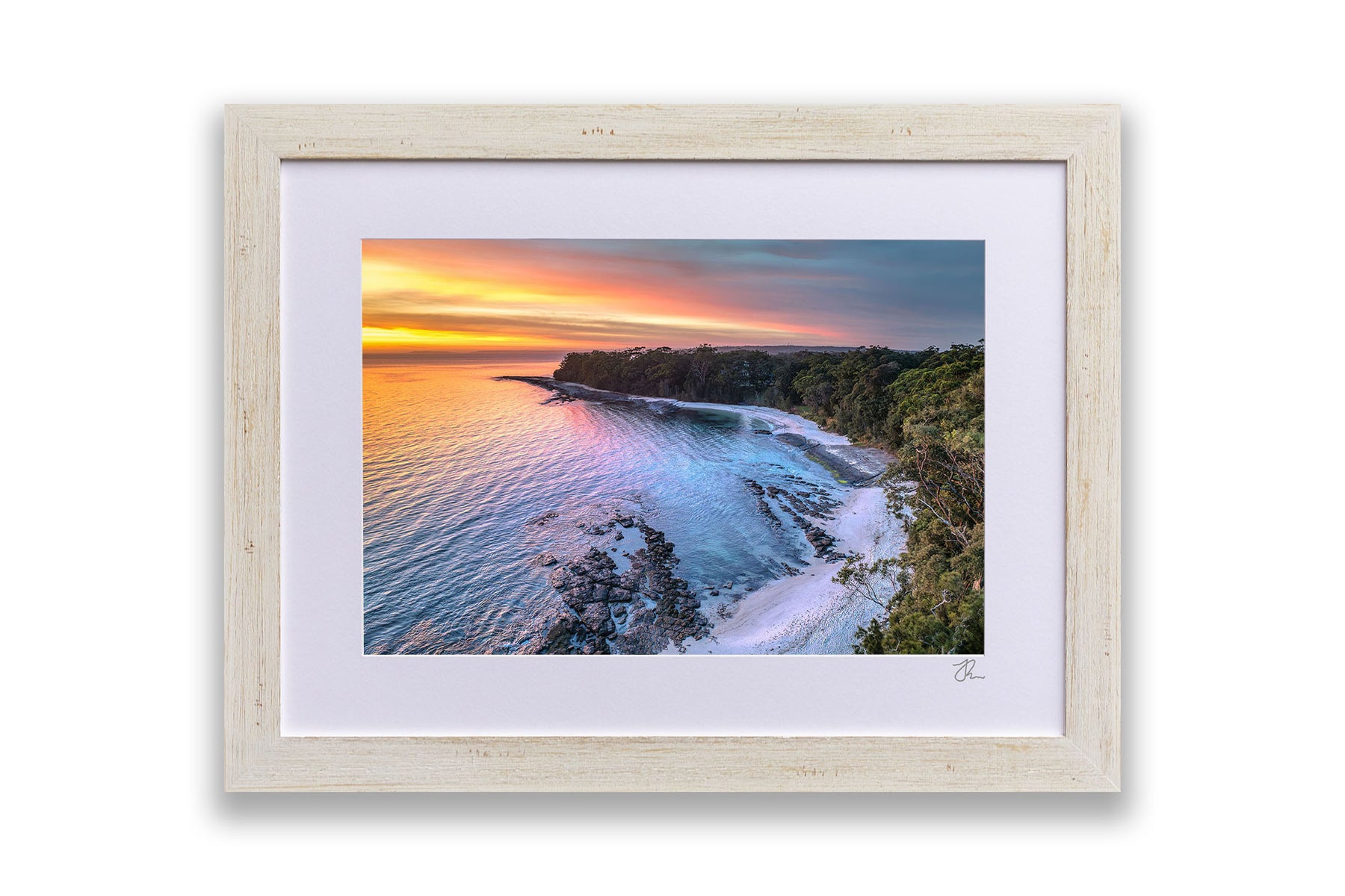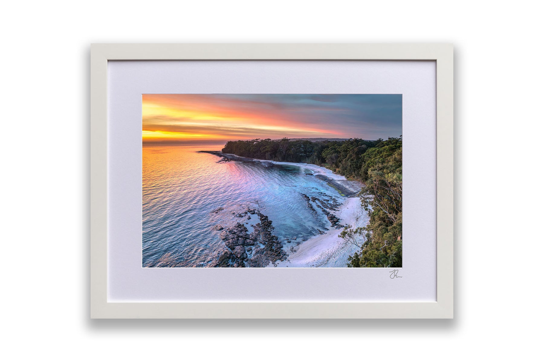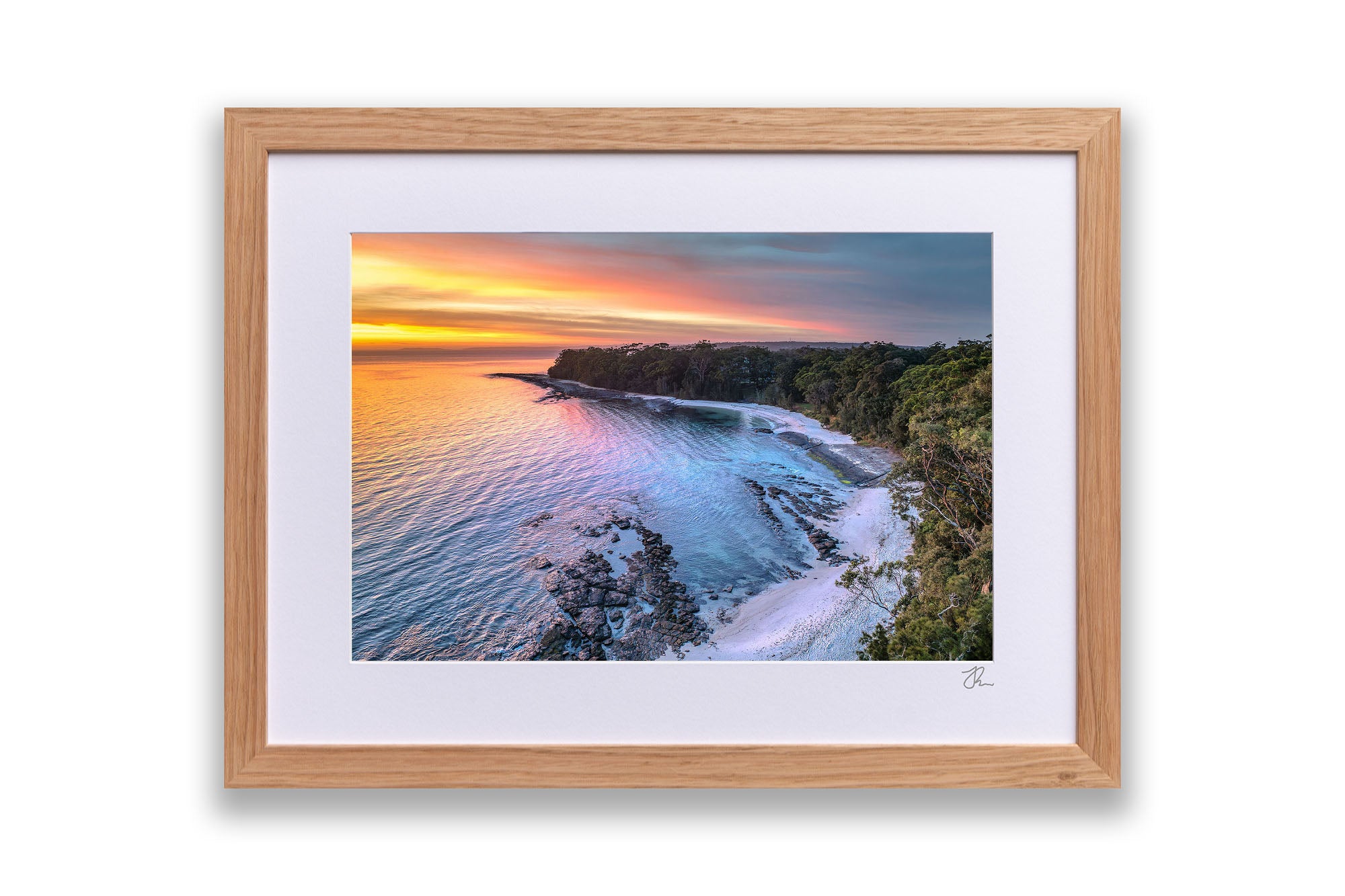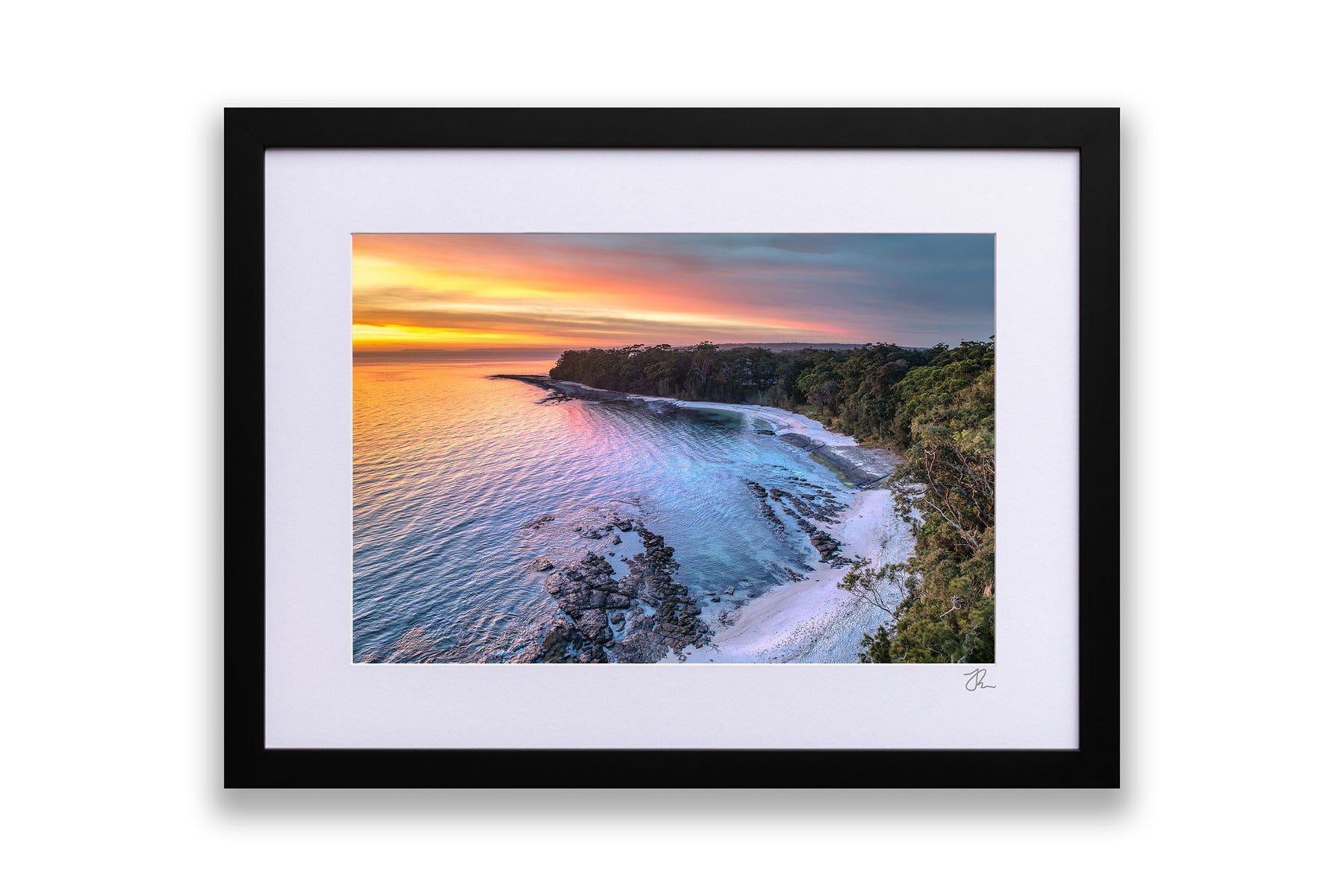 Soar above the sparkling waters of Jervis Bay with this breathtaking aerial photo print, capturing a vivid sunrise at Shark Net Beach, Huskisson This exclusive artwork reveals the mesmerising contrast between Huskisson's iconic shoreline and the first light dancing across the bay.