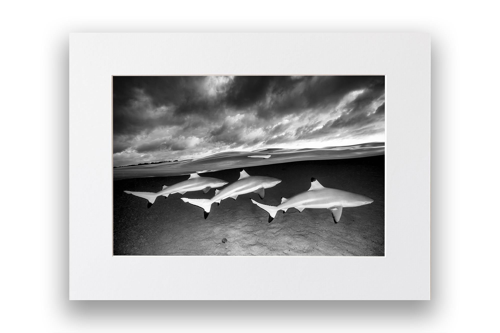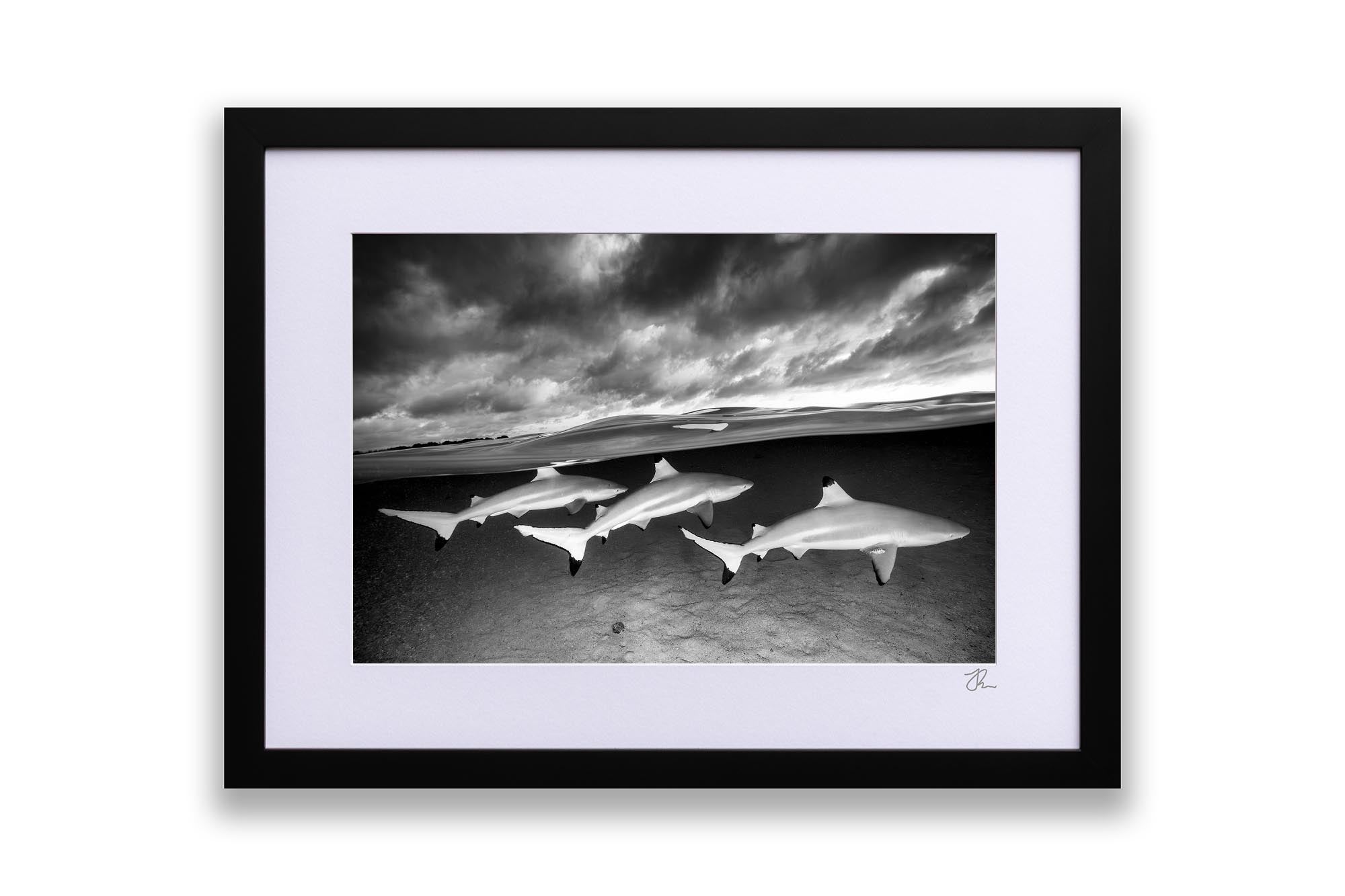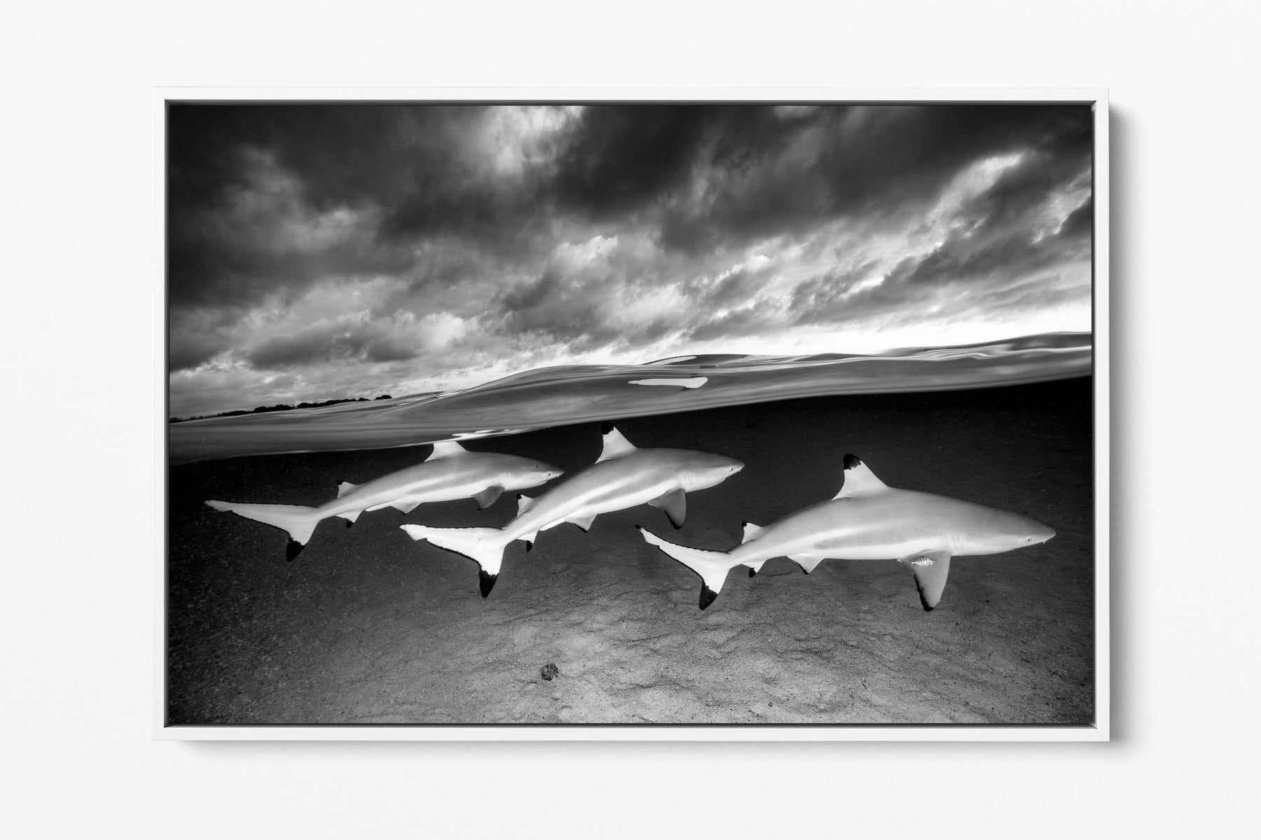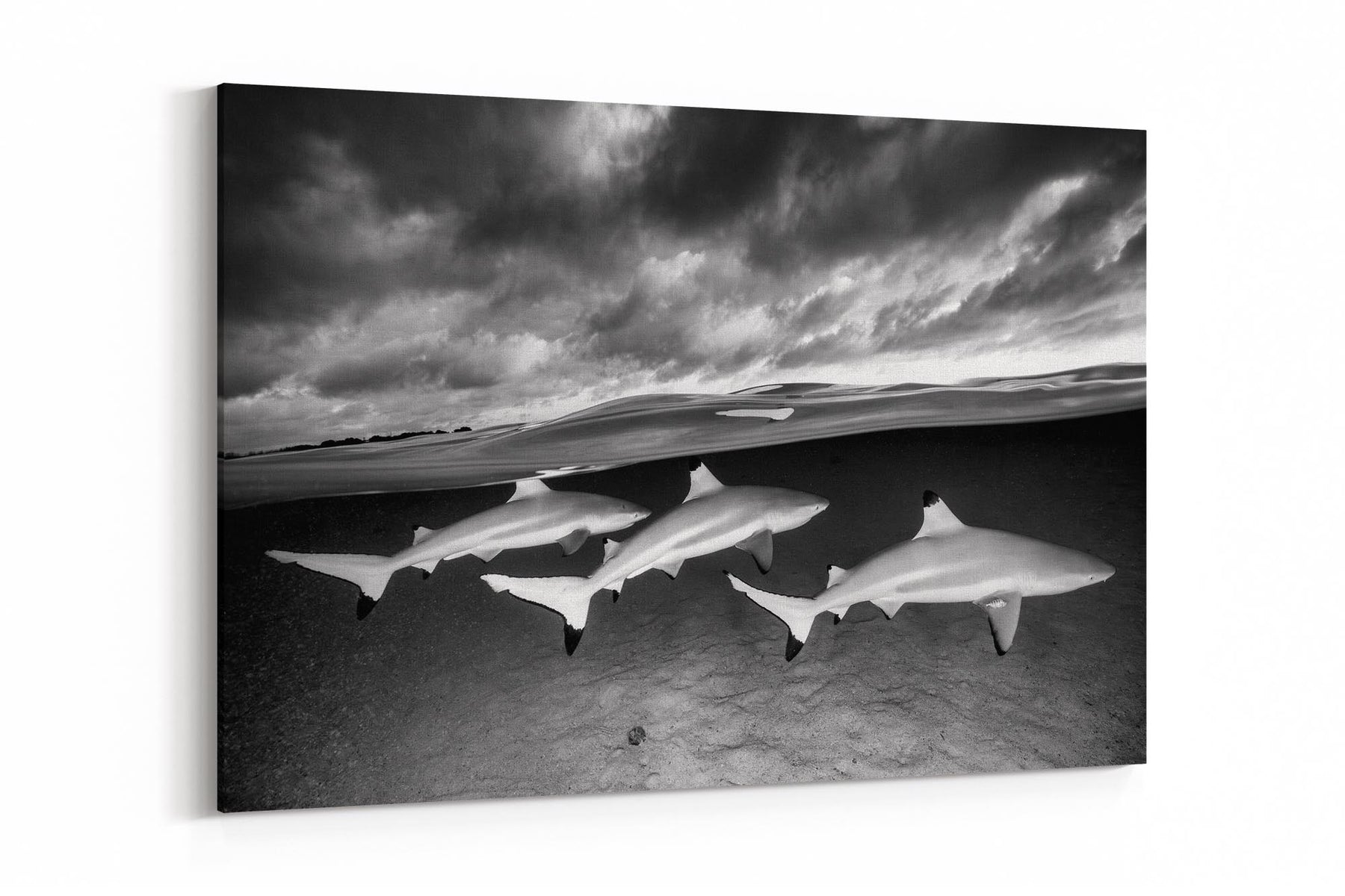 This striking black and white split-shot photography print captures Blacktip Reef Sharks (Carcharhinus melanopterus) patrolling the glass-calm lagoon of Moorea, French Polynesia. The over-under composition contrasts the sharks’ sleek silhouettes gliding through inky waters with the atmospheric morning skies above. Monochrome tones amplify the raw elegance of predator and paradise, transforming the scene into a timeless study of texture, light, and primal symmetry.