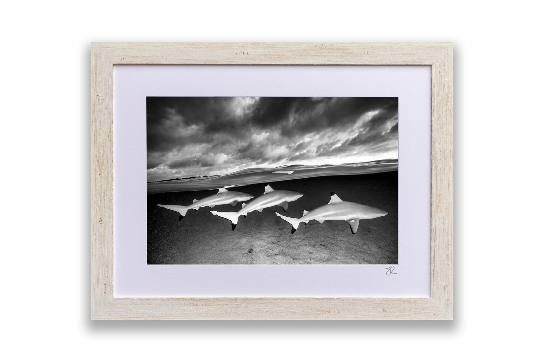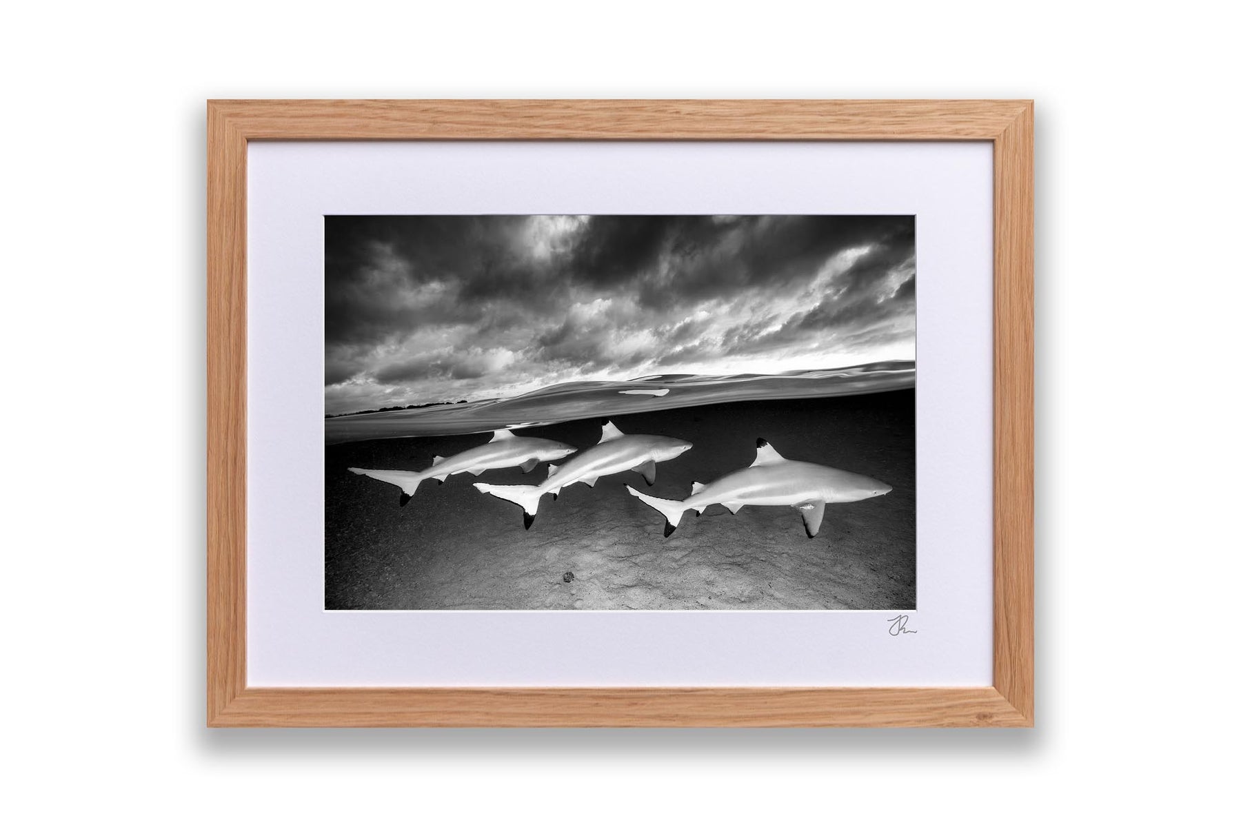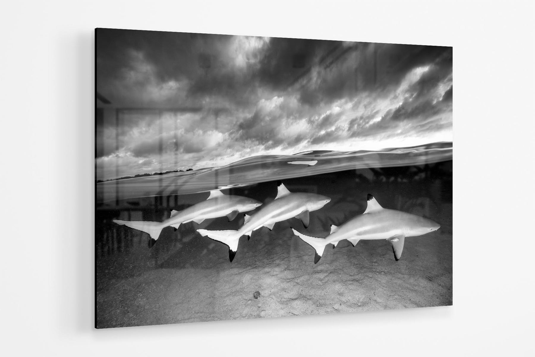 This striking black and white split-shot photography print captures Blacktip Reef Sharks (Carcharhinus melanopterus) patrolling the glass-calm lagoon of Moorea, French Polynesia. The over-under composition contrasts the sharks’ sleek silhouettes gliding through inky waters with the atmospheric morning skies above. Monochrome tones amplify the raw elegance of predator and paradise, transforming the scene into a timeless study of texture, light, and primal symmetry.