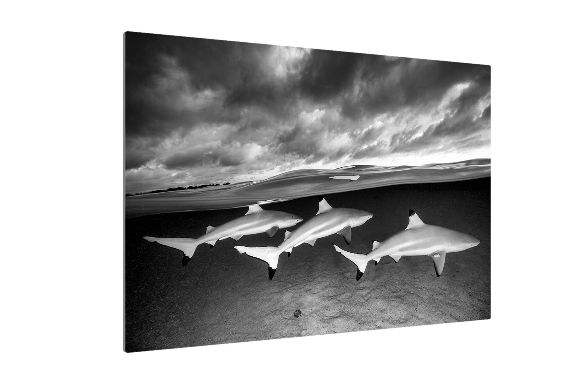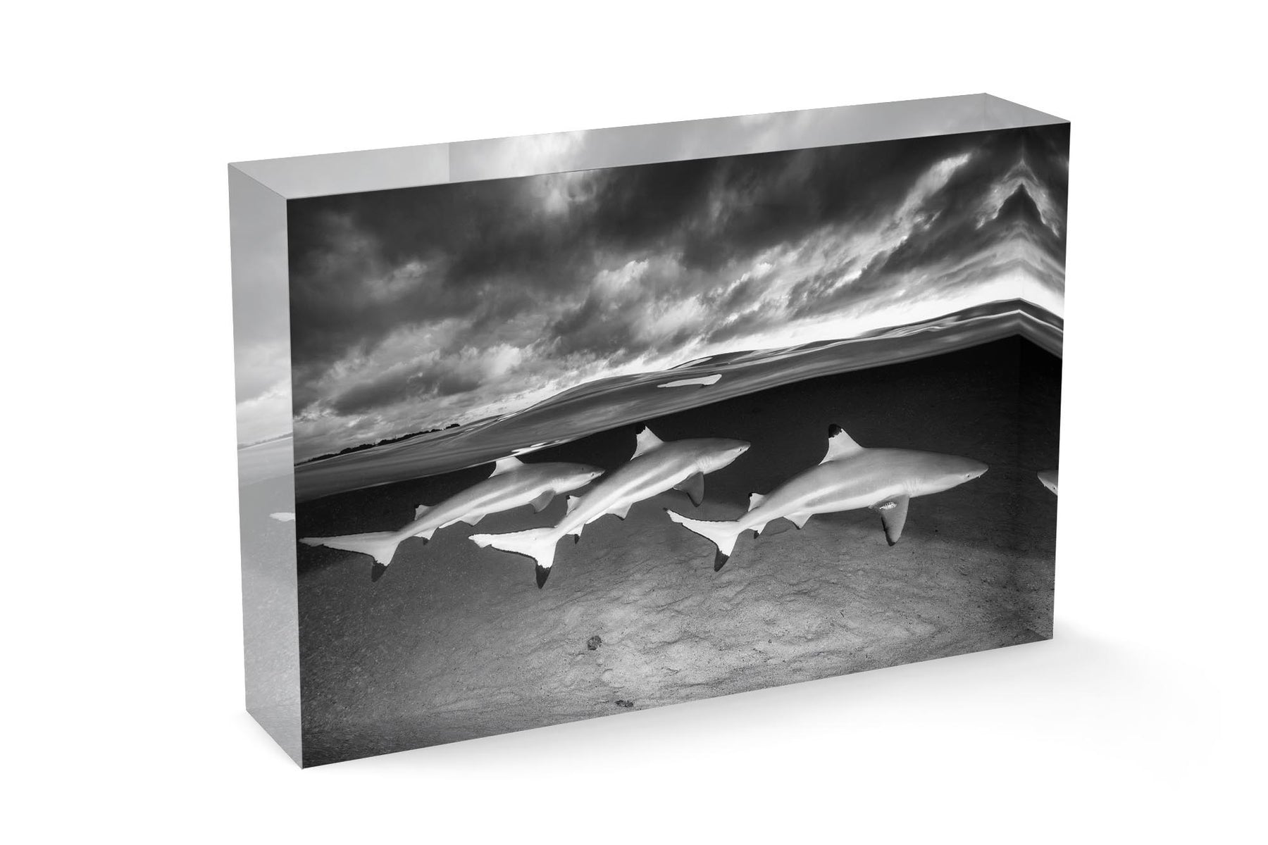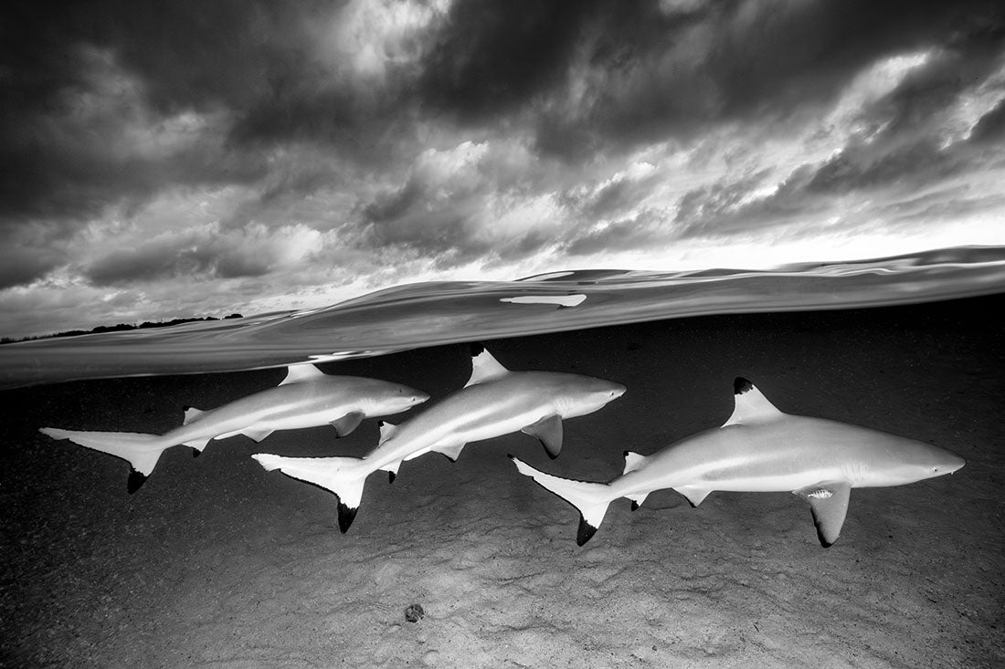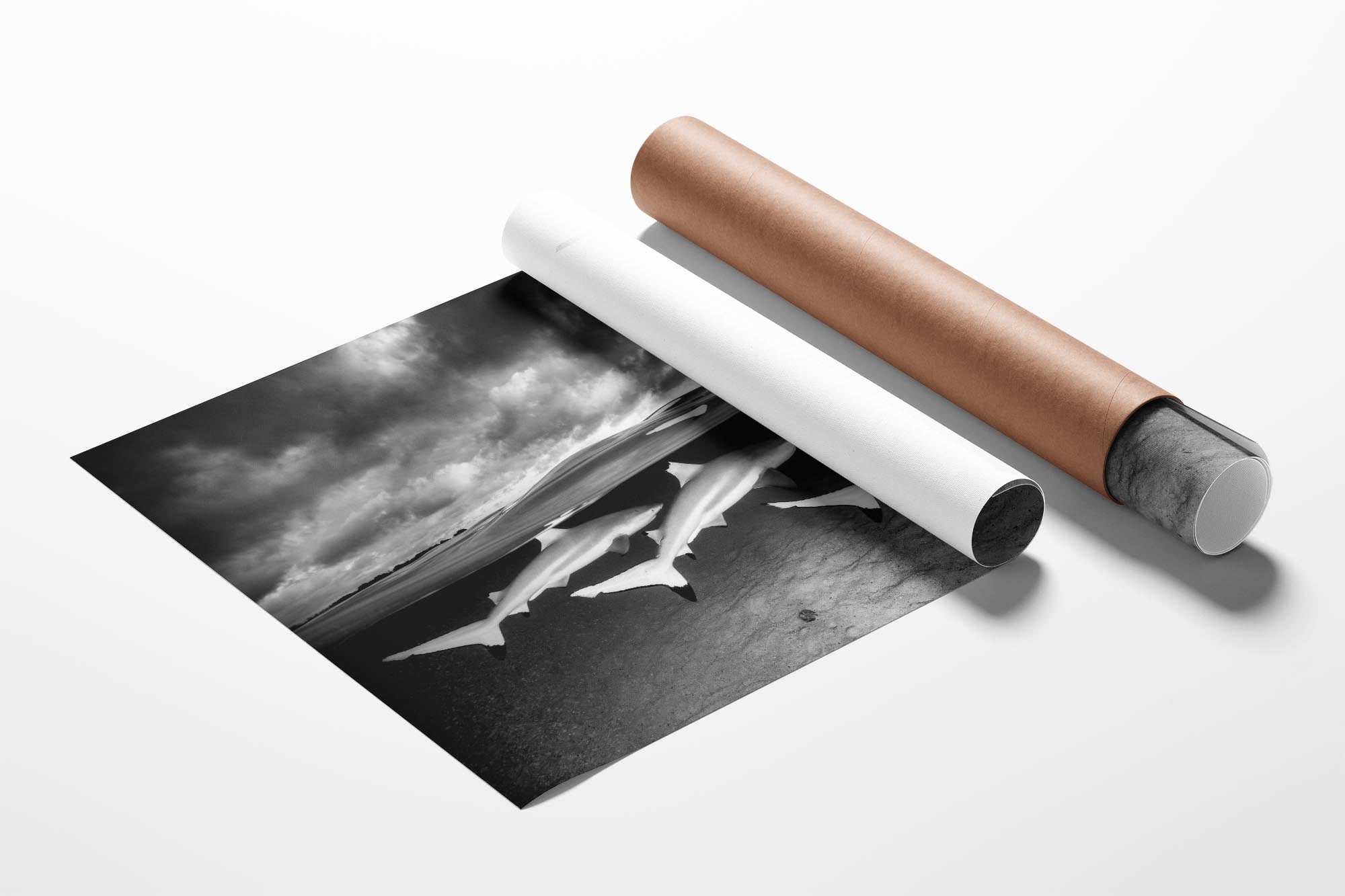 This striking black and white split-shot photography print captures Blacktip Reef Sharks (Carcharhinus melanopterus) patrolling the glass-calm lagoon of Moorea, French Polynesia. The over-under composition contrasts the sharks’ sleek silhouettes gliding through inky waters with the atmospheric morning skies above. Monochrome tones amplify the raw elegance of predator and paradise, transforming the scene into a timeless study of texture, light, and primal symmetry.