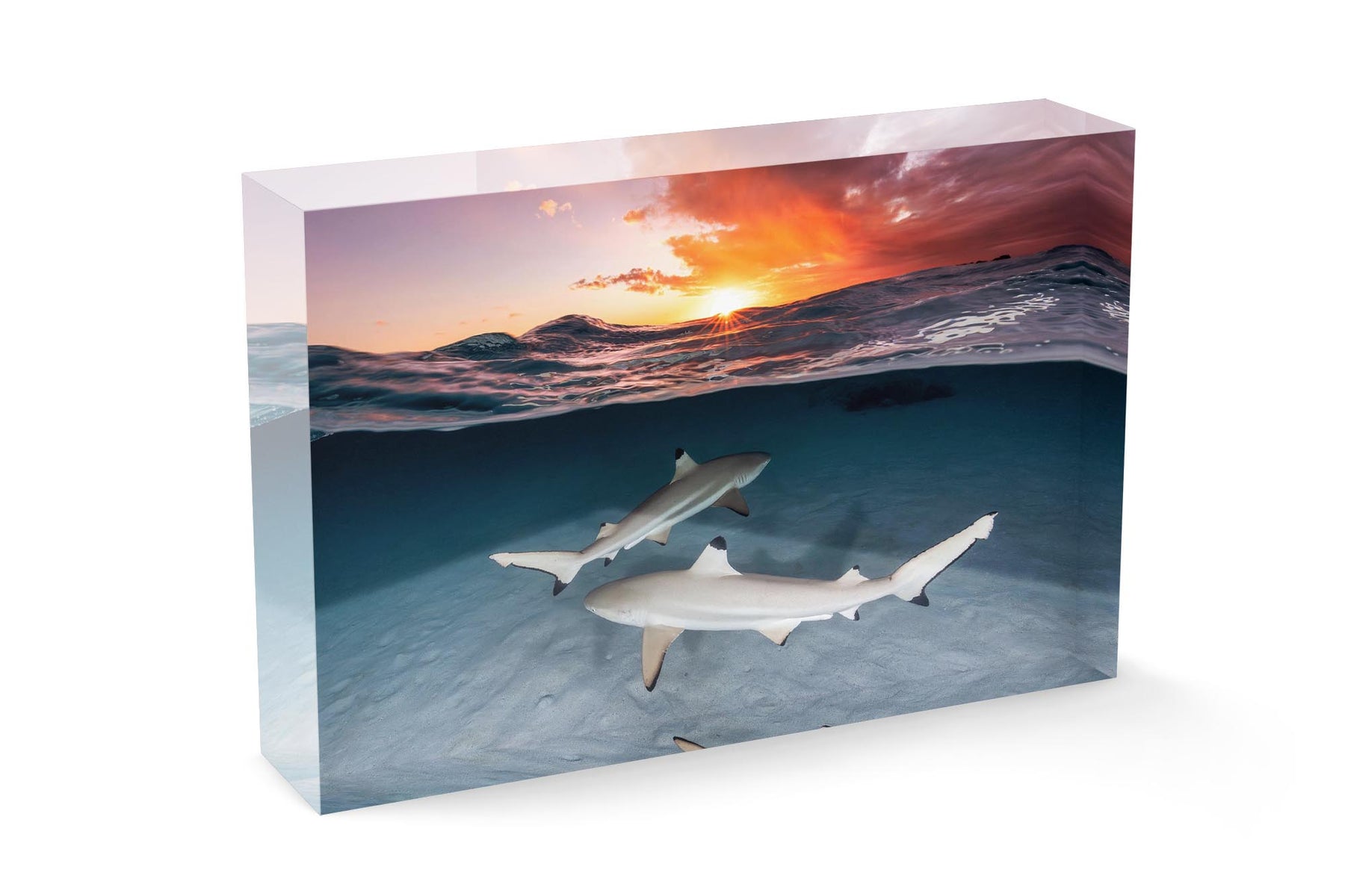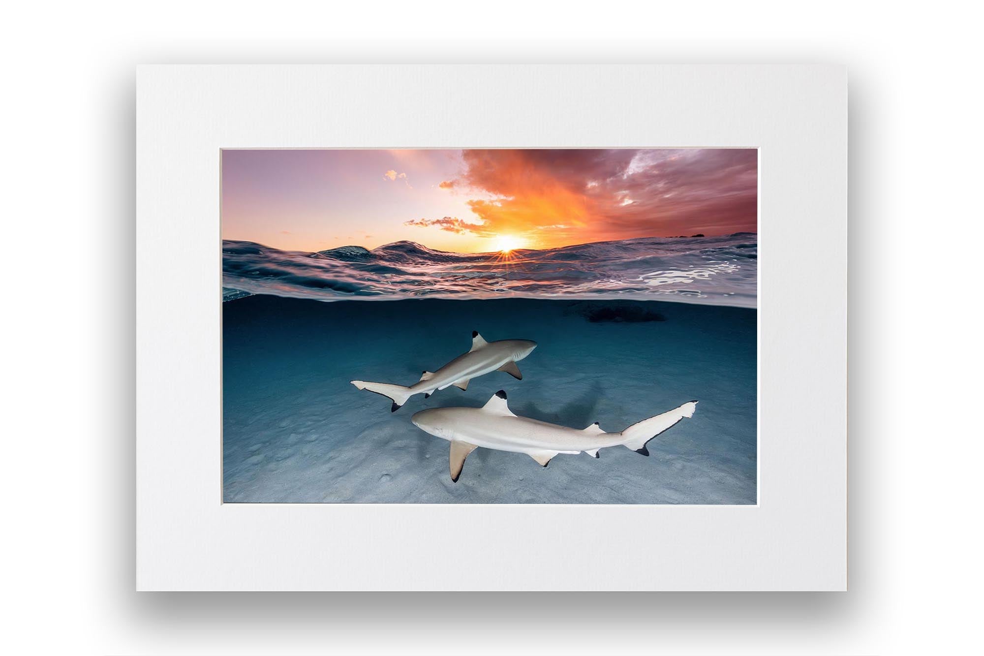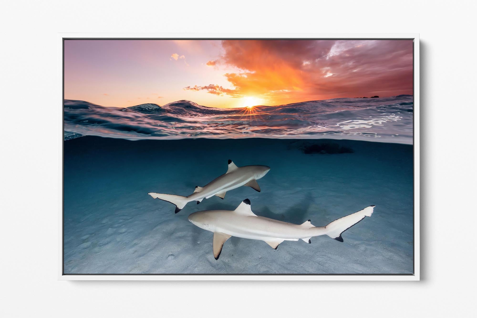 Blacktip Reef Sharks Over Under Photo Print – Sunset in Moorea, French Polynesia