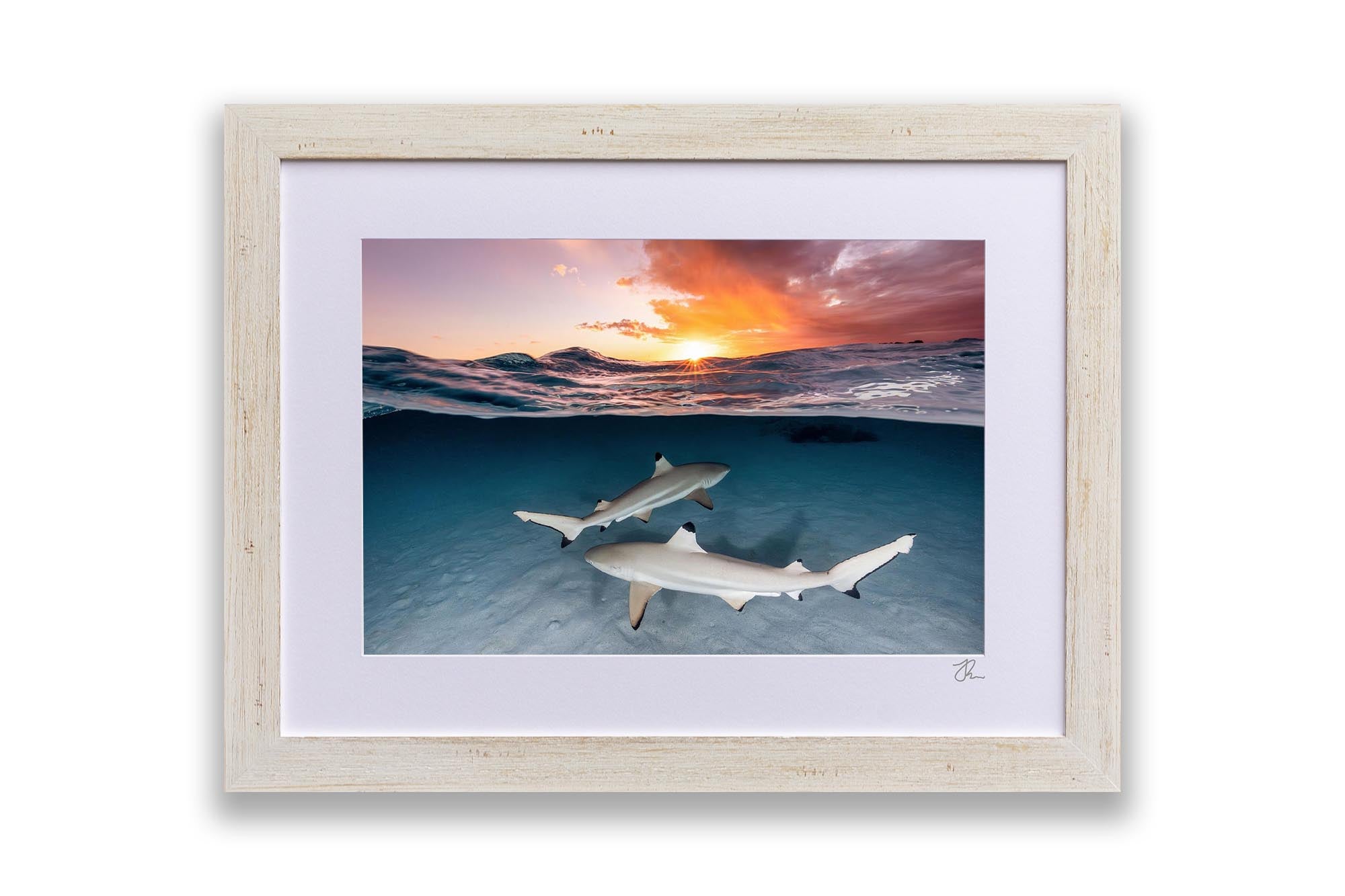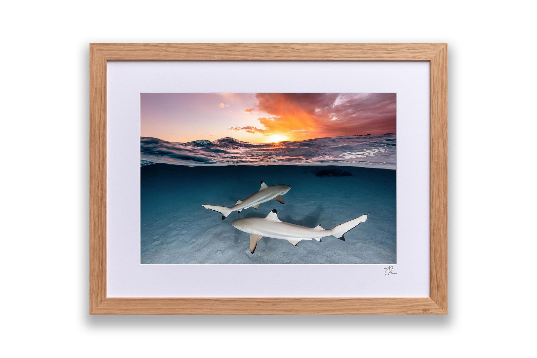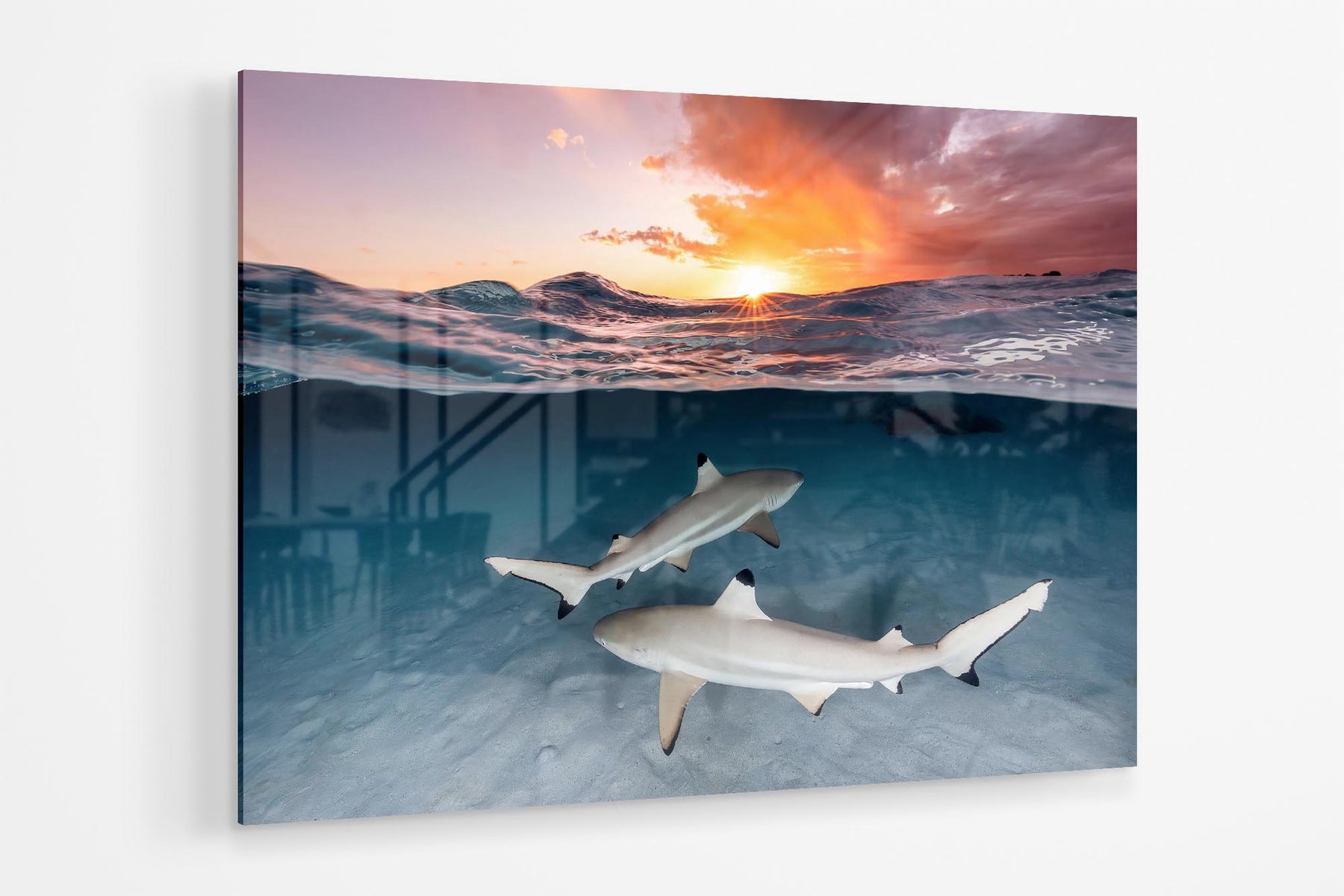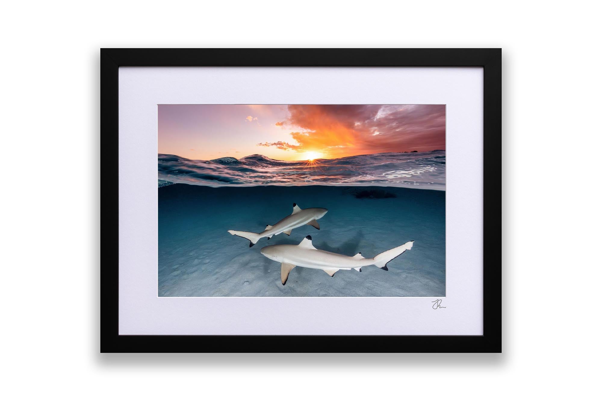 This stunning photo print captures an over-under image of Blacktip Reef Sharks gliding effortlessly over the sand flats in the lagoon at sunset in Moorea, French Polynesia. The unique over-under photography style beautifully combines the vibrant colours of the sunset above the water with the serene underwater world below, creating a mesmerising visual experience.