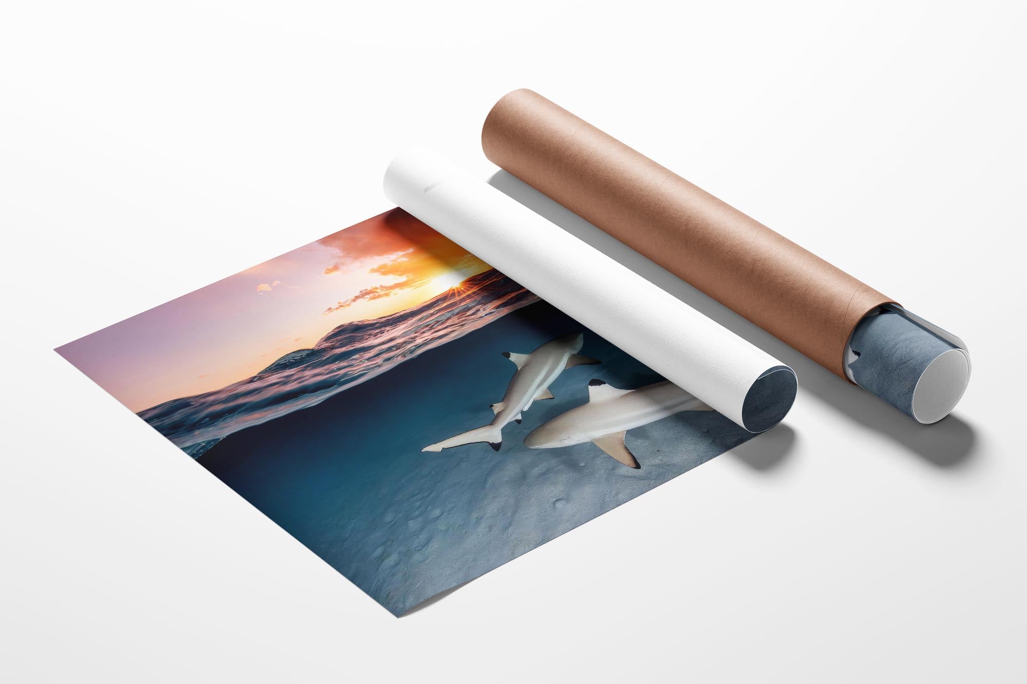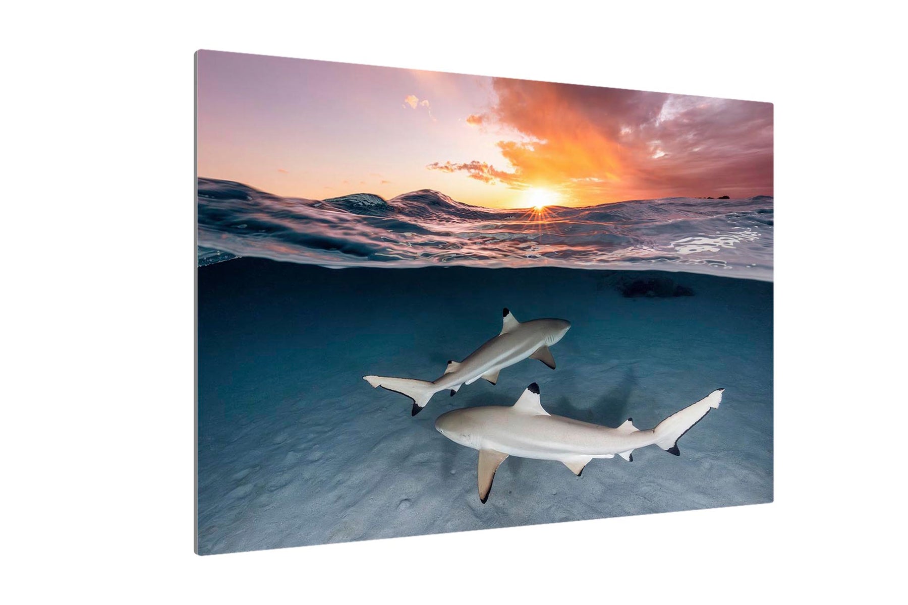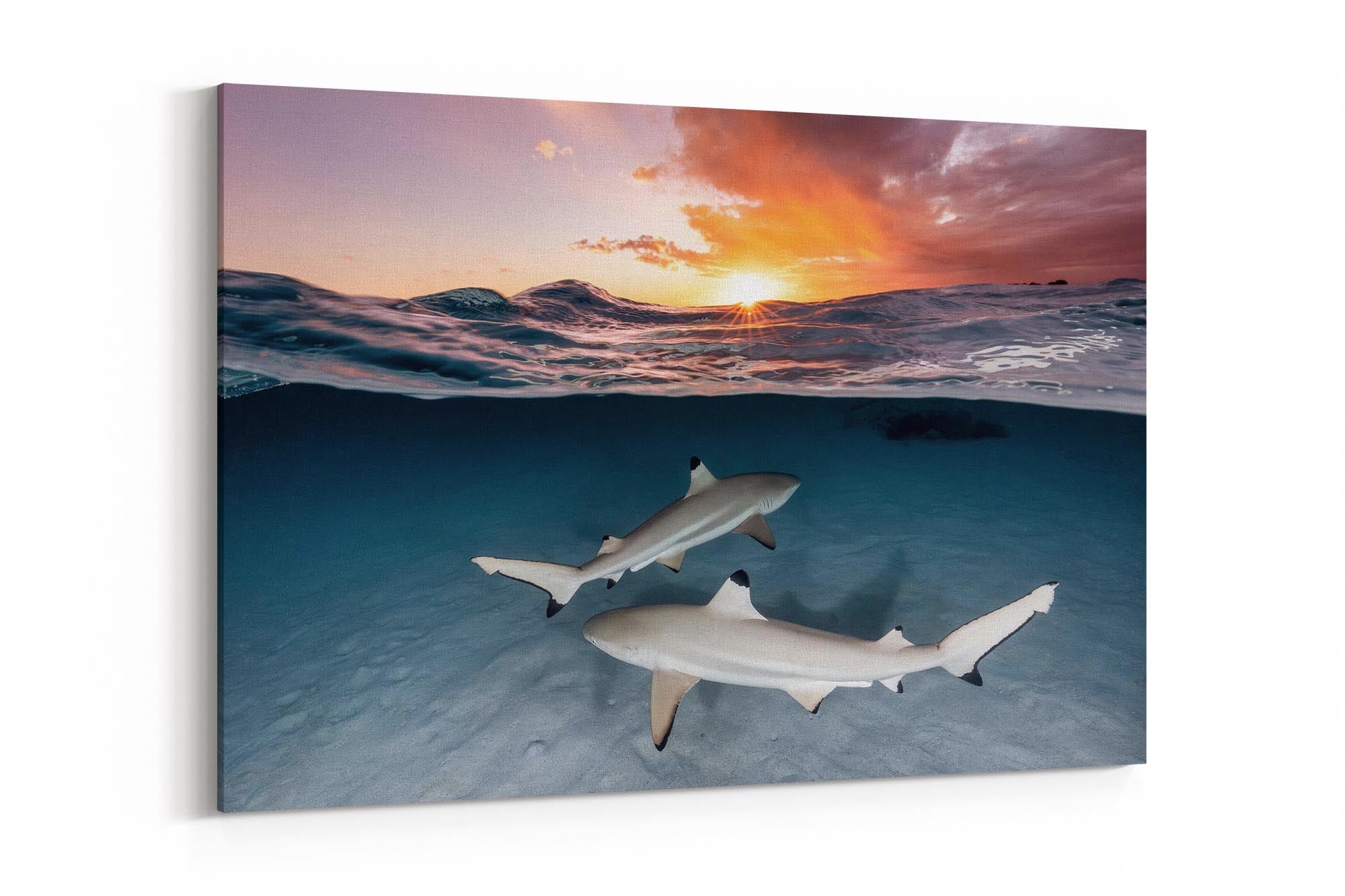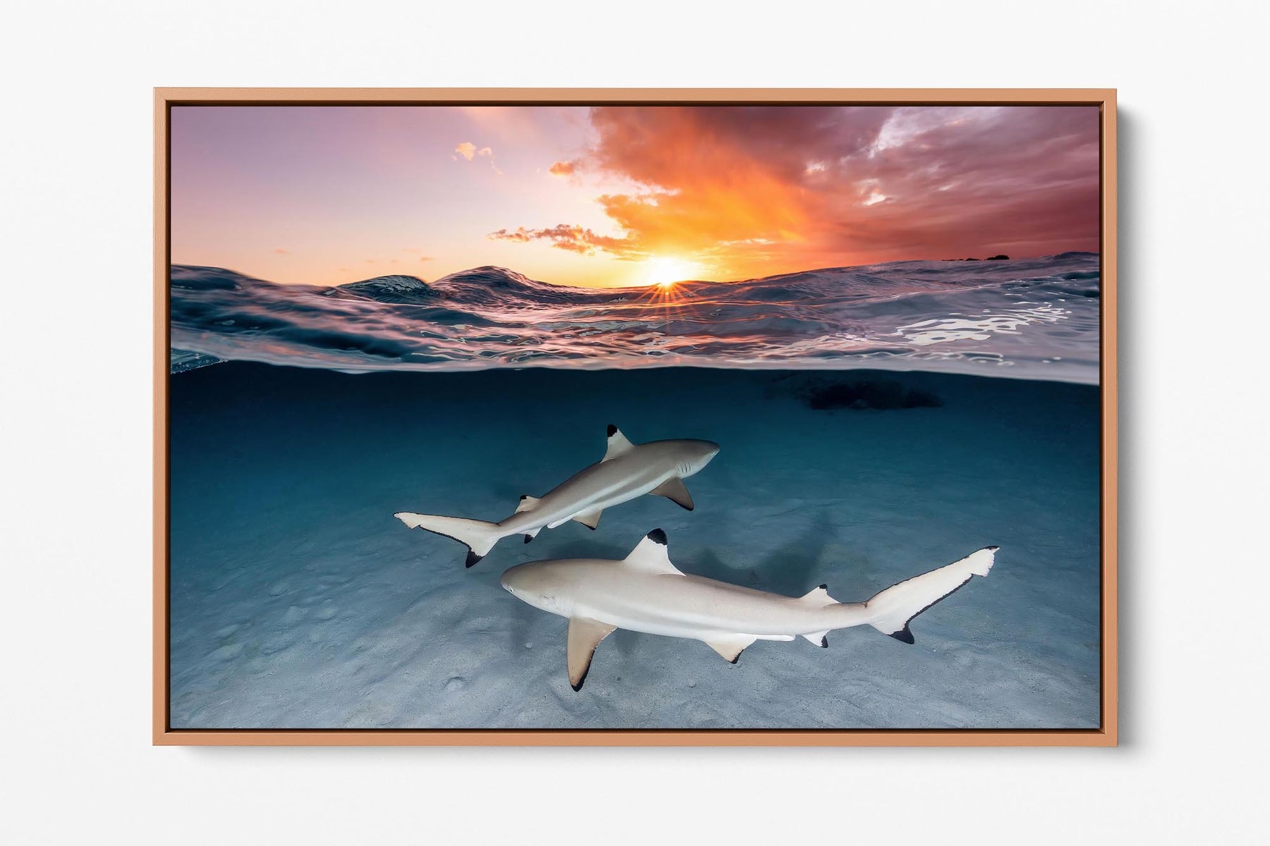 This stunning photo print captures an over-under image of Blacktip Reef Sharks gliding effortlessly over the sand flats in the lagoon at sunset in Moorea, French Polynesia. The unique over-under photography style beautifully combines the vibrant colours of the sunset above the water with the serene underwater world below, creating a mesmerising visual experience.