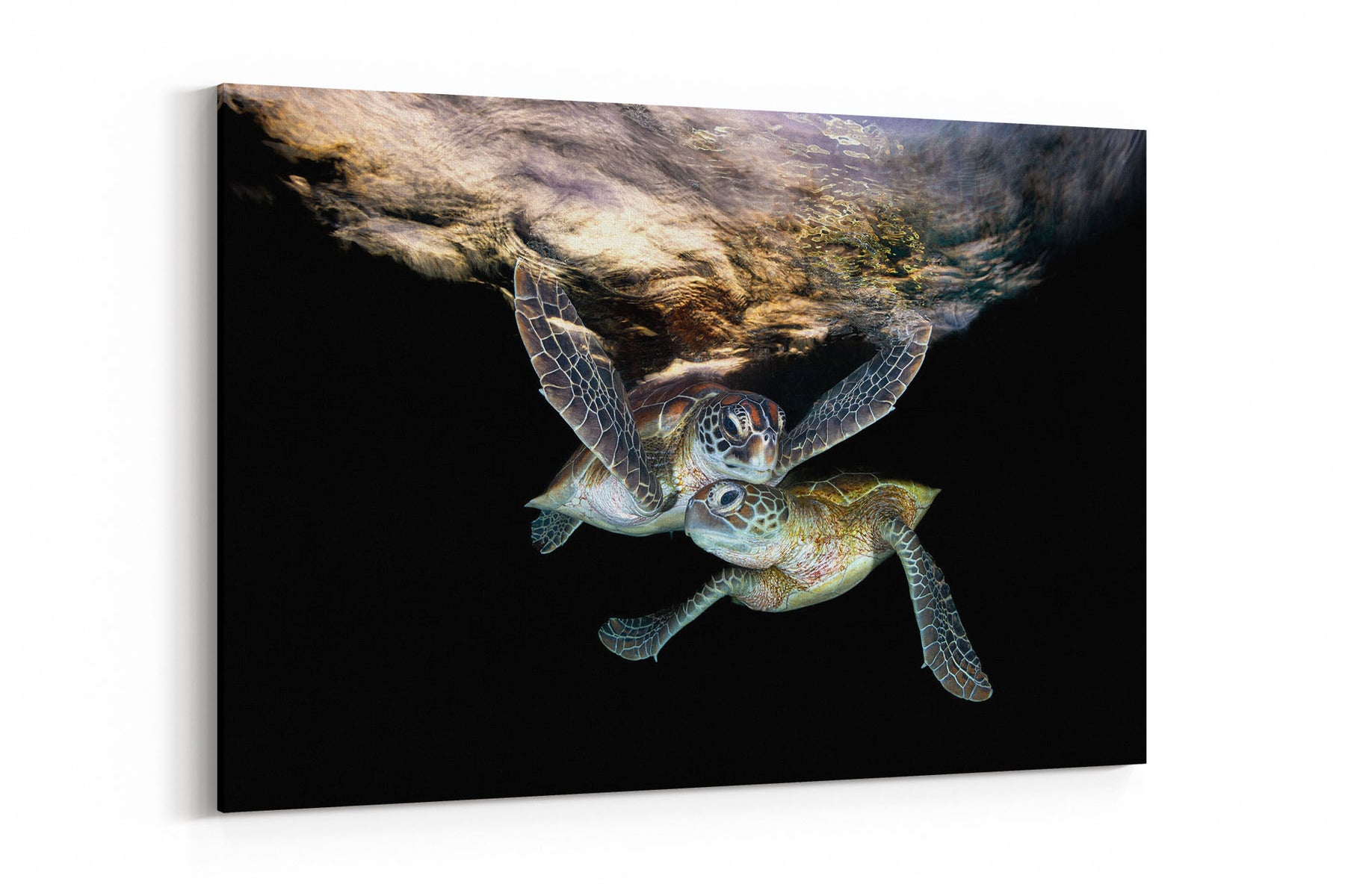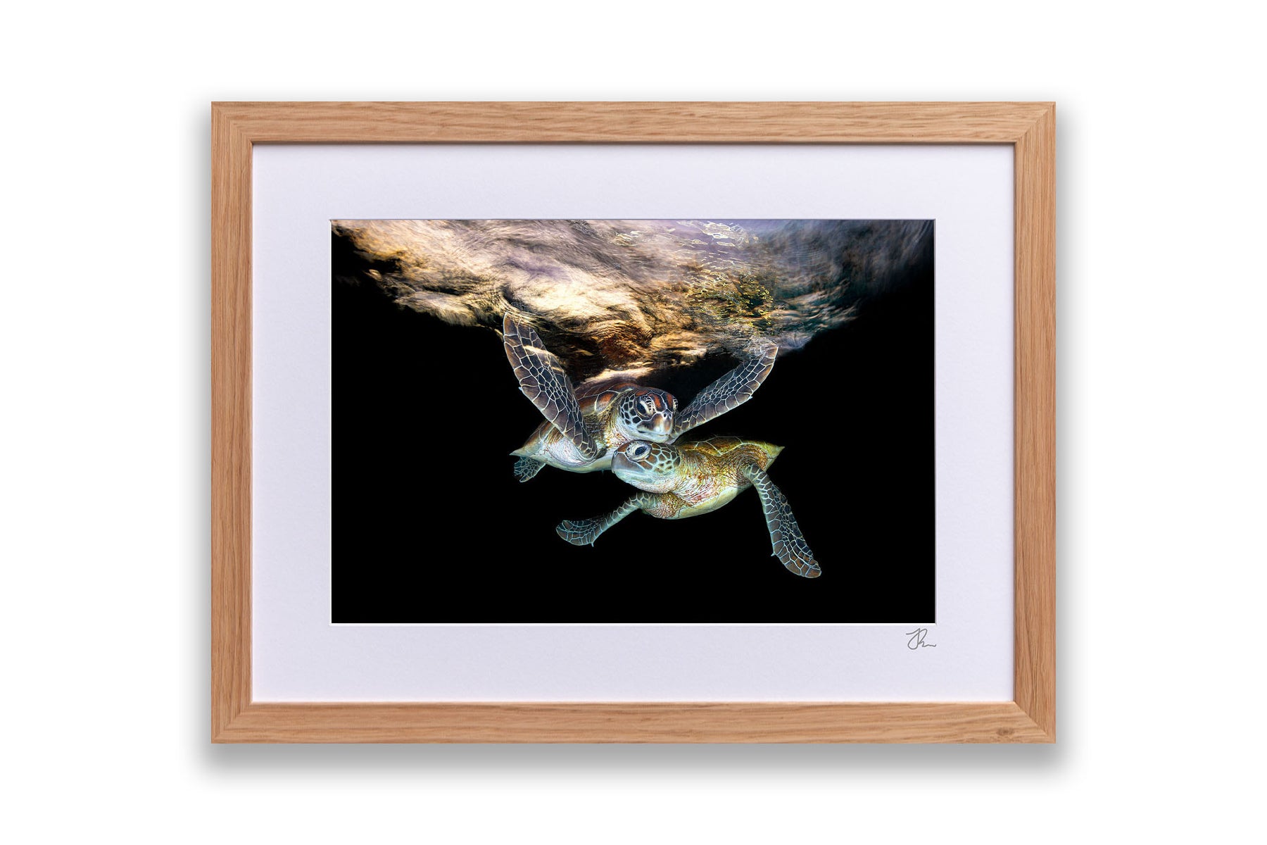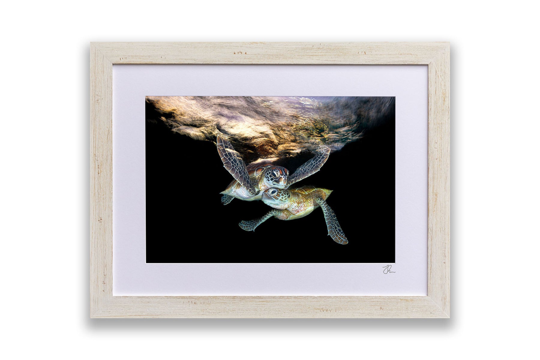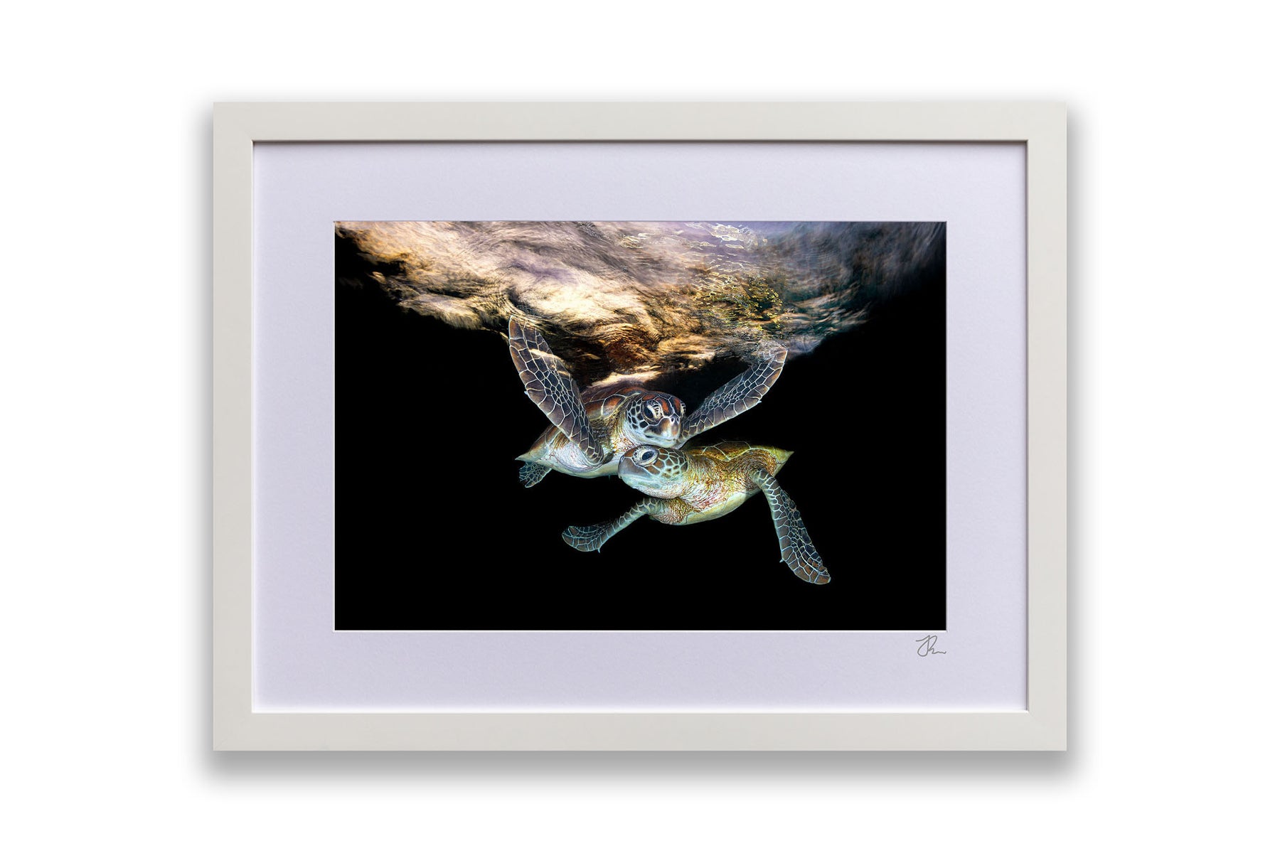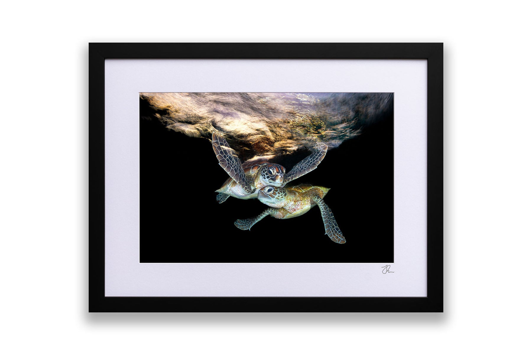 This captivating underwater photography print captures two endangered Green Sea Turtles gliding gracefully over the reef in the lagoon of Lady Elliot Island, part of the UNESCO World Heritage-listed Southern Great Barrier Reef.