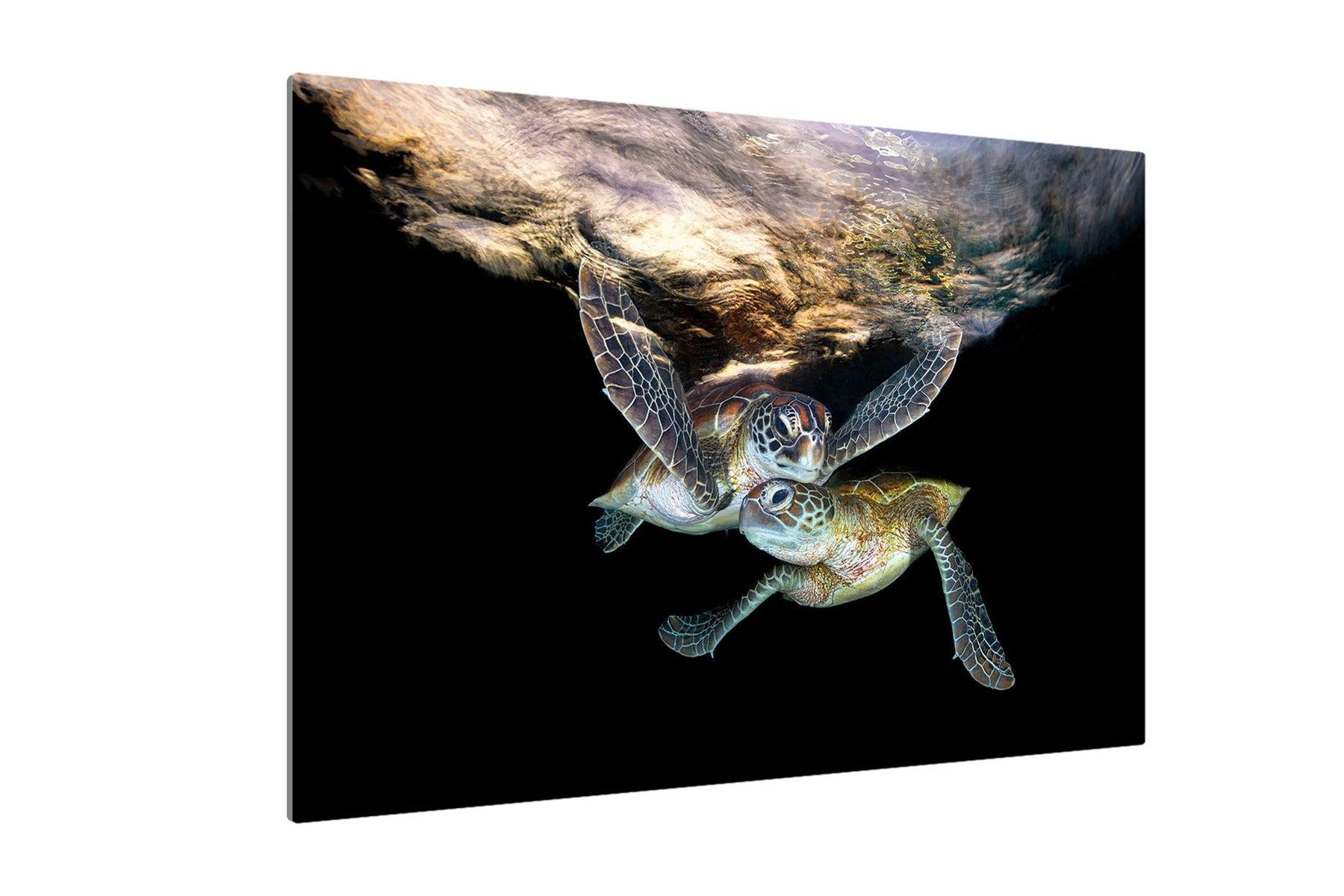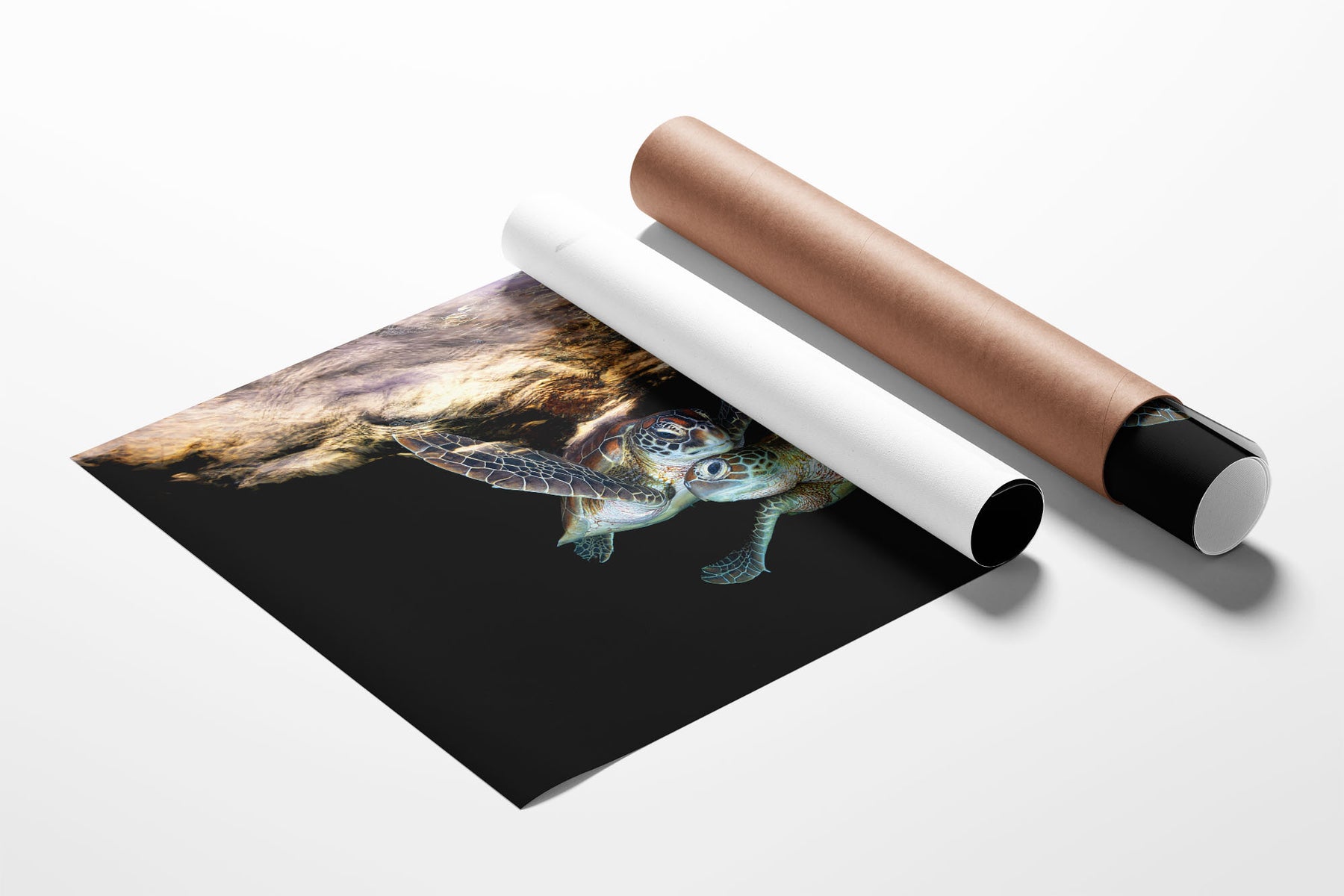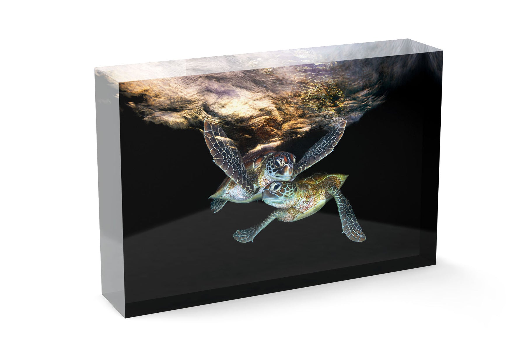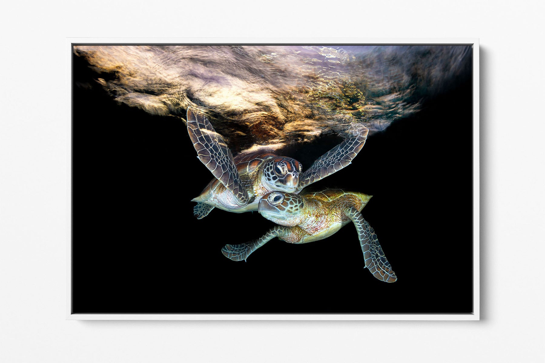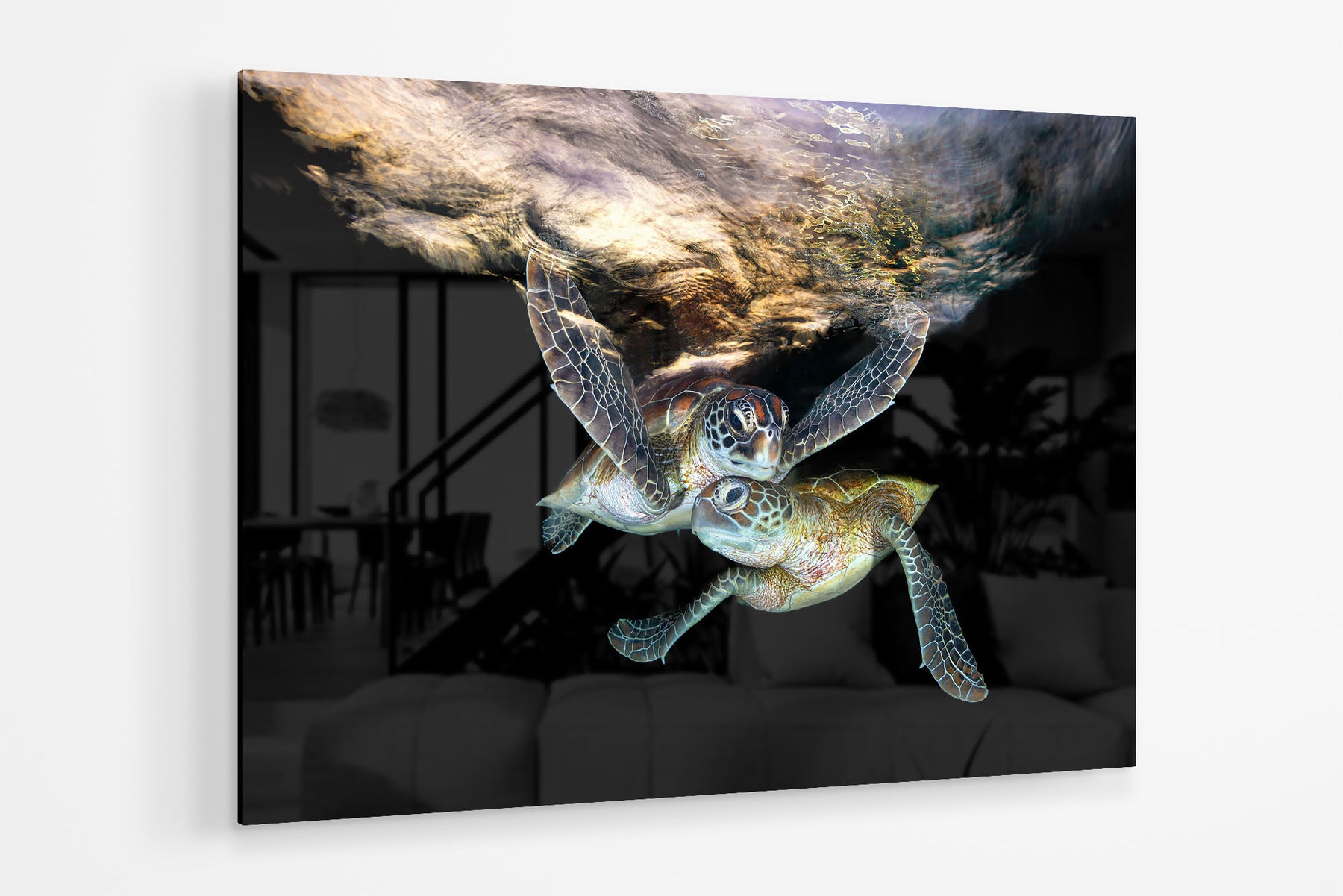 This captivating underwater photography print captures two endangered Green Sea Turtles gliding gracefully over the reef in the lagoon of Lady Elliot Island, part of the UNESCO World Heritage-listed Southern Great Barrier Reef.