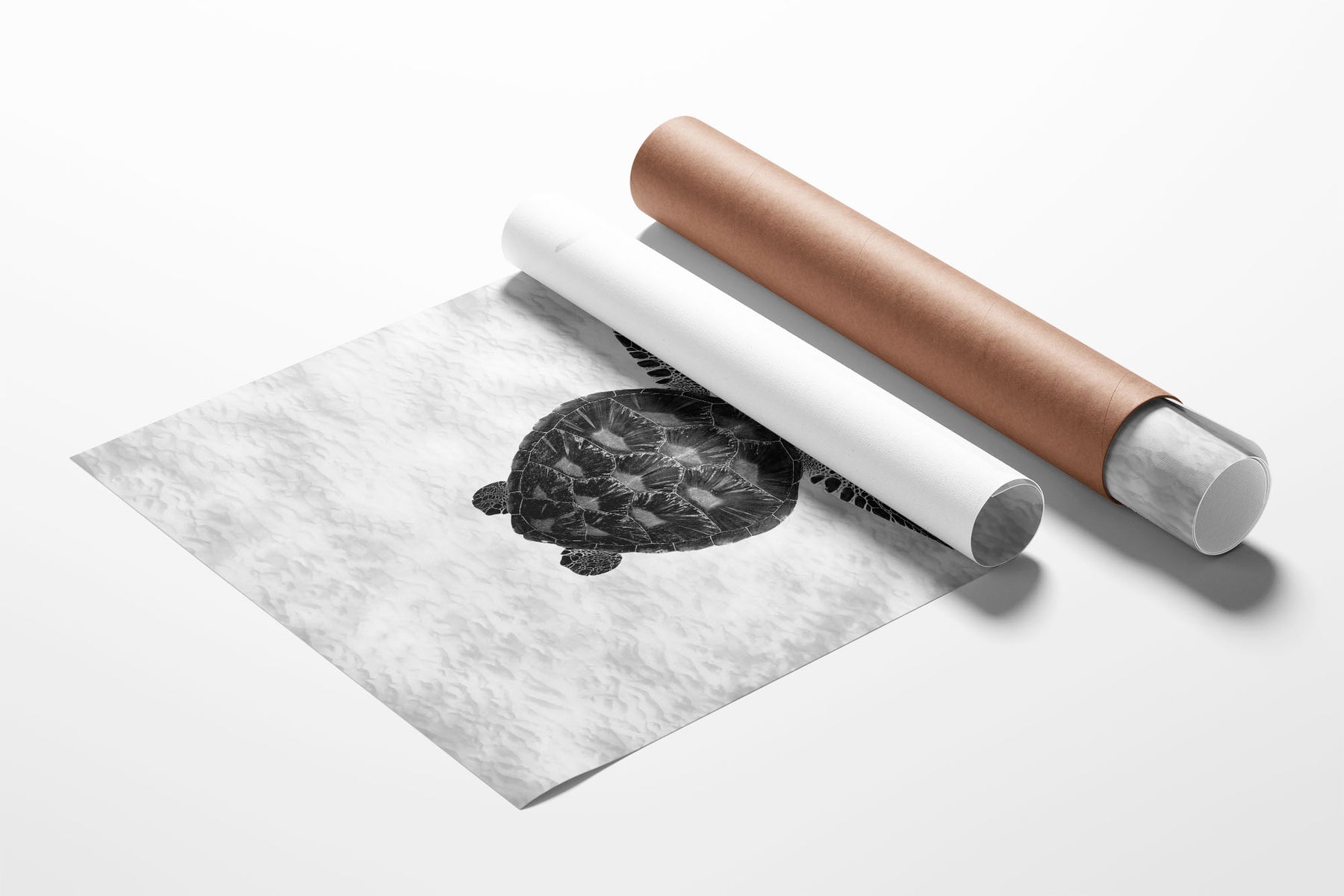 Witness the timeless elegance of marine wildlife in this striking black and white photograph, featuring an endangered Green Sea Turtle gliding gracefully over the sandy sea floor of Lady Elliot Island. Captured in the pristine waters of Queensland's Great Barrier Reef.