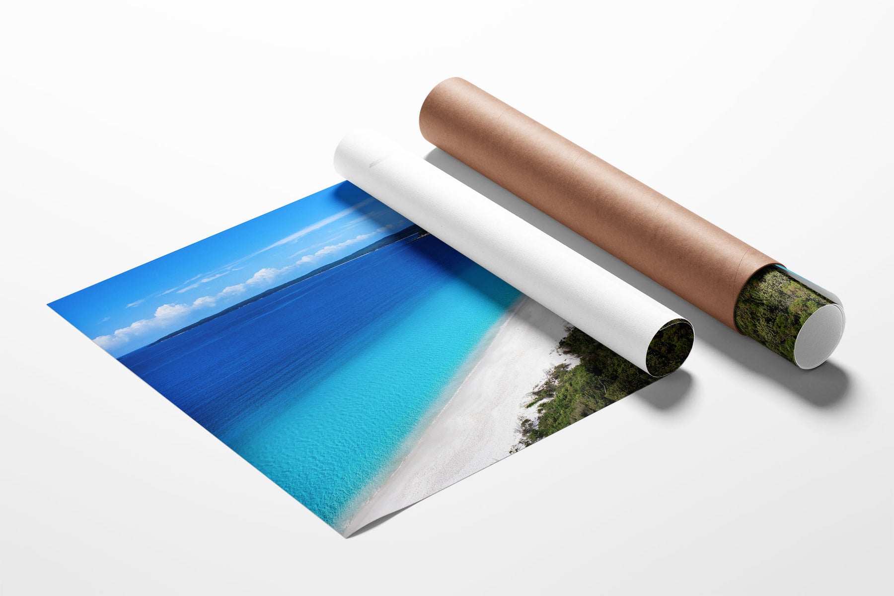 Experience the breathtaking contrast where the Australian bush meets the iconic, bright white sands and crystal-clear turquoise waters of Hyams Beach. This stunning aerial photo print captures the stunning beauty of Jervis Bay from a unique perspective, making a bold statement piece for any coastal or modern home.