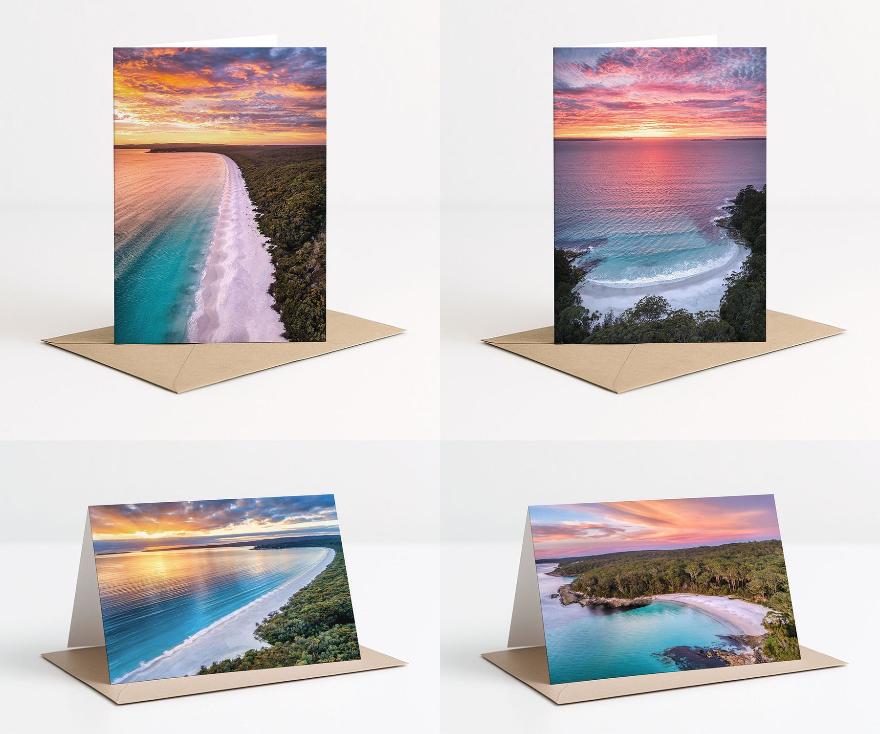 Pack comes with 4x greeting cards and envelopes. Includes pictures of Hyams Beach and Blenheim Beach, Jervis Bay