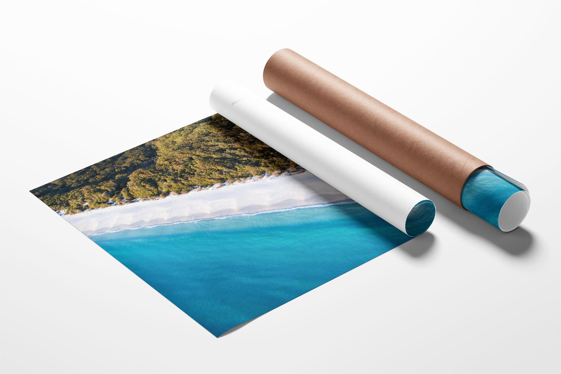 Experience a breathtaking perspective of world-famous Hyams Beach with this fine art aerial print. This top-down view perfectly frames the stunning contrast where the Australian bush meets the bright white sands and crystal-clear turquoise waters of Jervis Bay, creating a captivating piece of coastal decor.