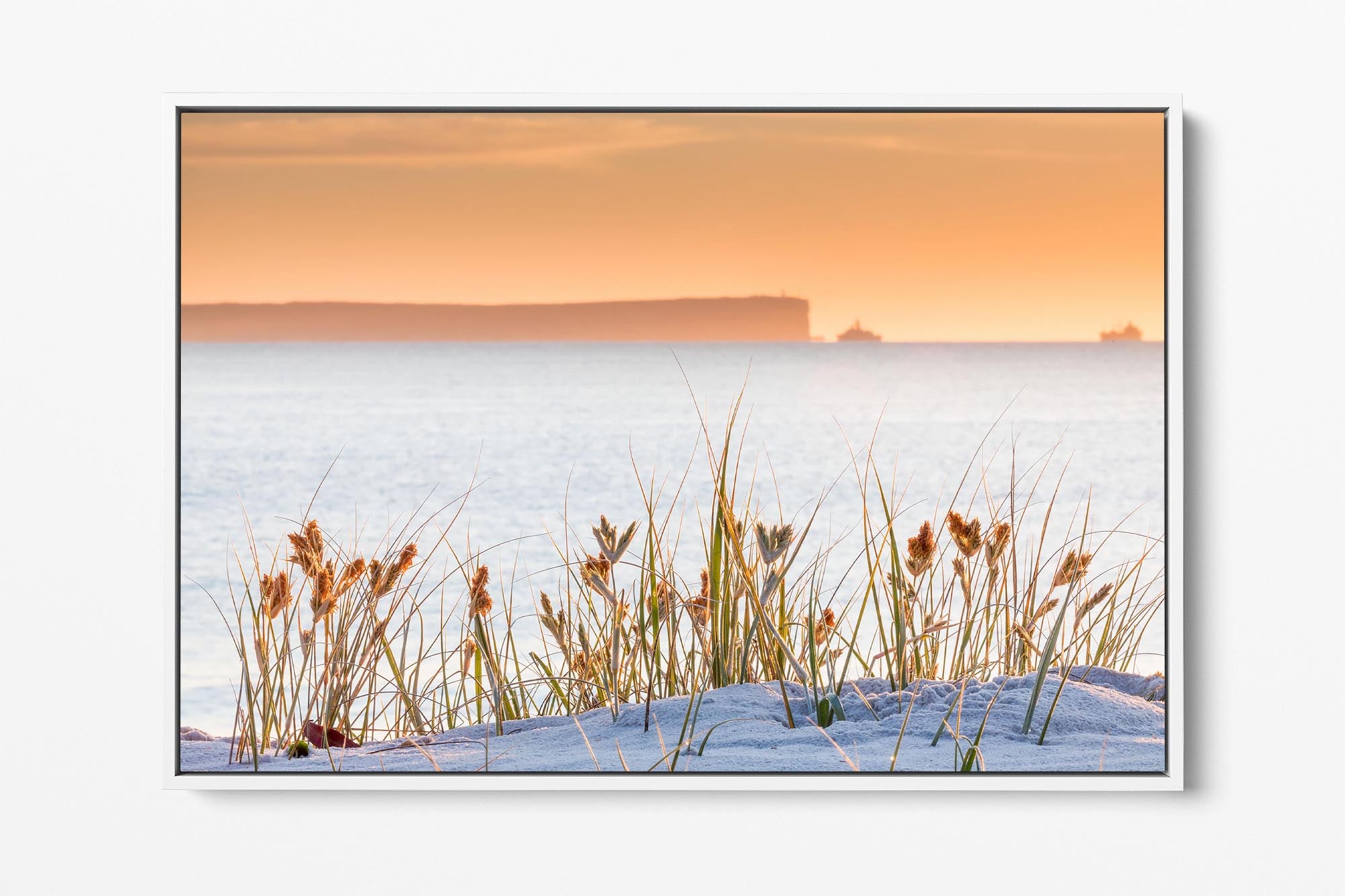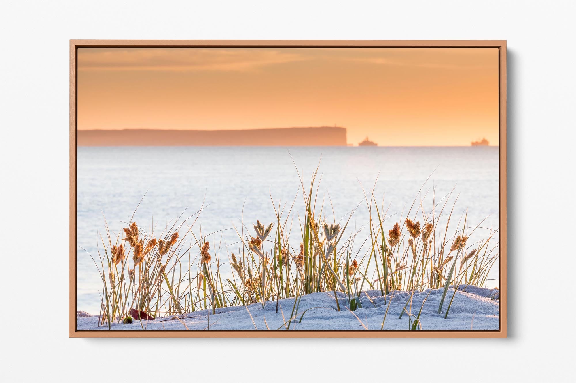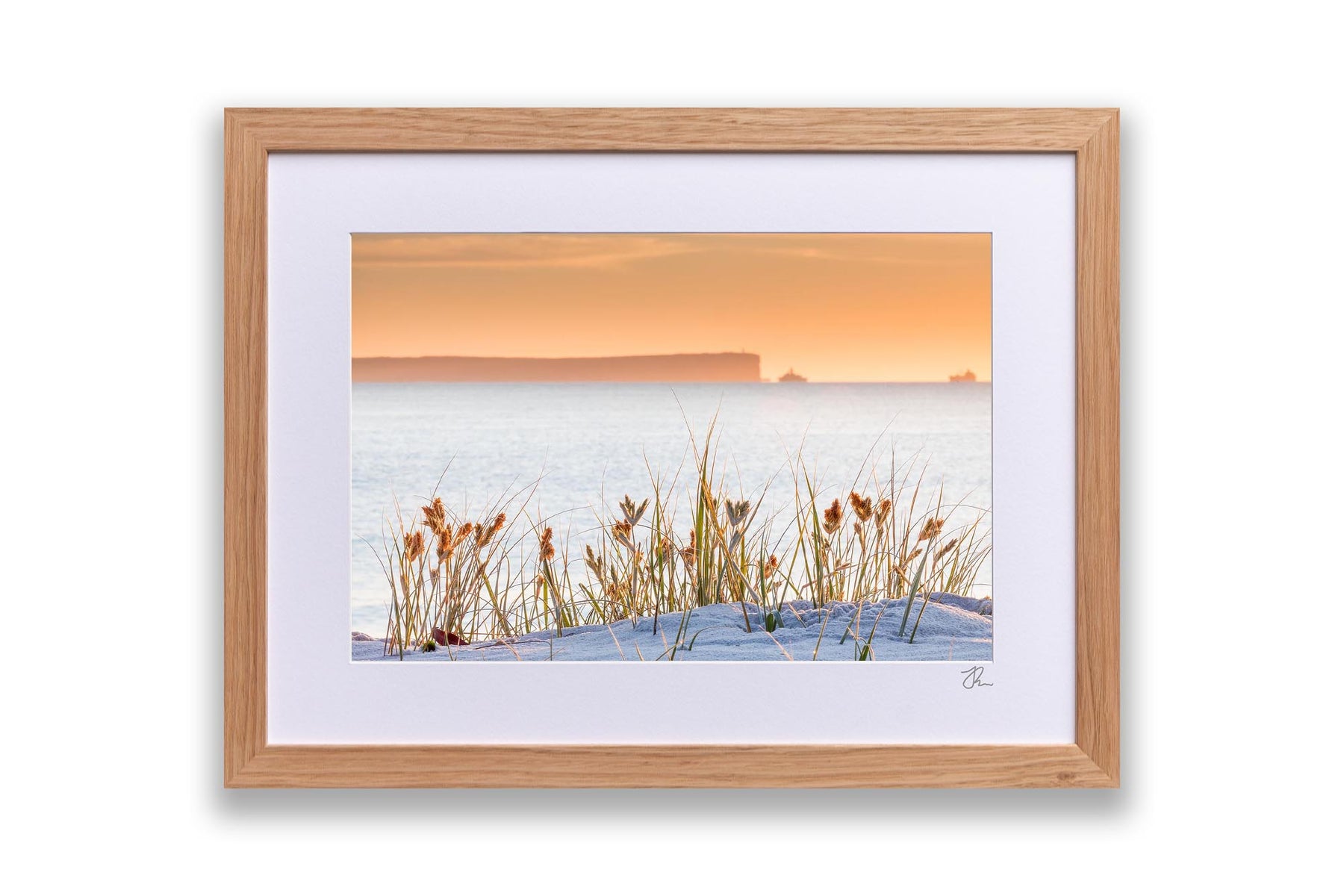 Photo print of navy ships and Point Perpendicular in the warm morning light, photographed from Chinamans Beach.