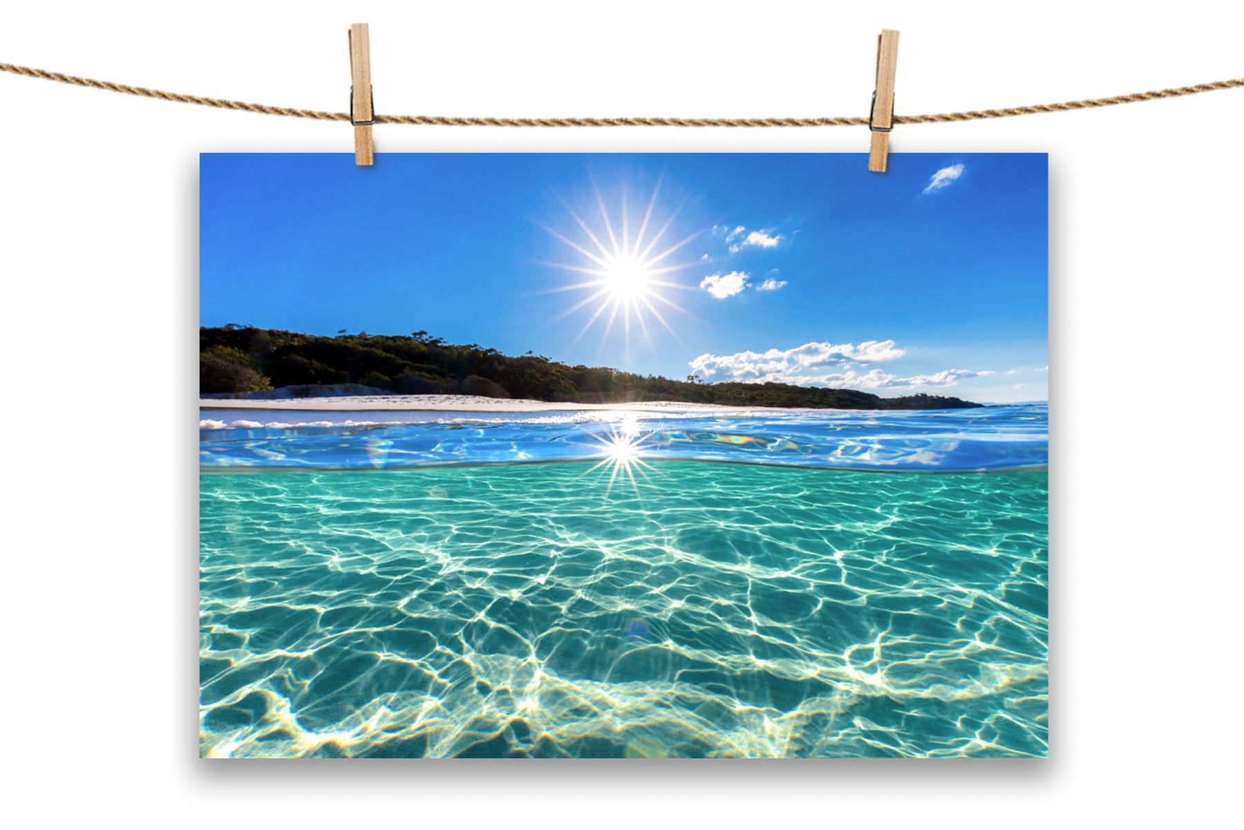 - Featuring print of an over under photo captured in crystal clear water at Hyams Beach, Jervis Bay