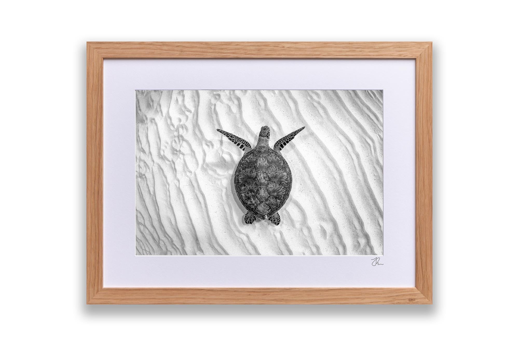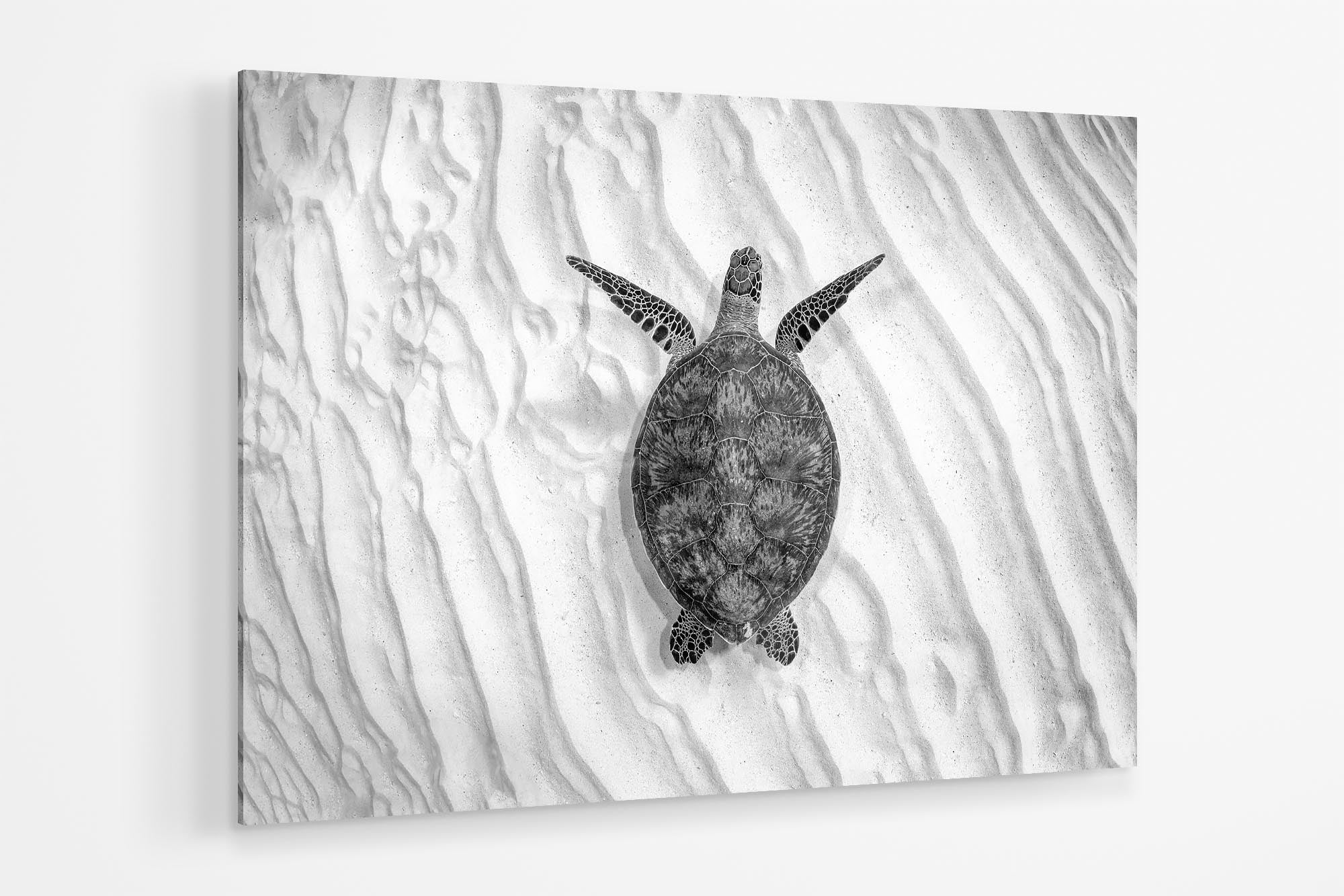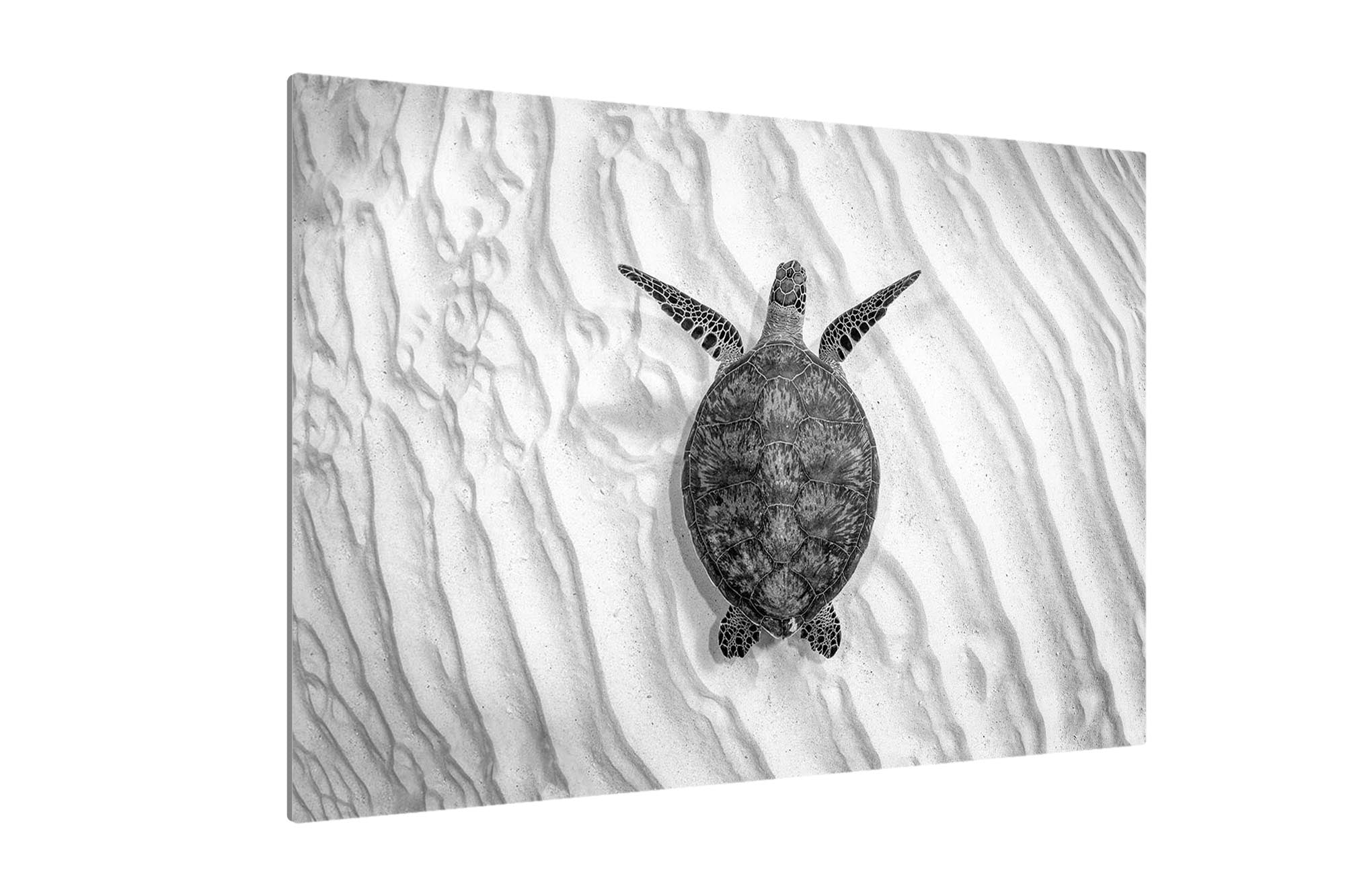 This striking black-and-white underwater photography print caotures an endangered Green Sea Turtle (Chelonia mydas) gliding gracefully over the sandy seafloor of Lady Elliot Island’s UNESCO World Heritage-listed Southern Great Barrier Reef. Bathed in stark monochrome contrasts, the minimalist composition elevates the turtle’s elegant movements and intricate shell patterns, while the soft ripples of light on the seabed evoke a timeless, almost sculptural beauty.