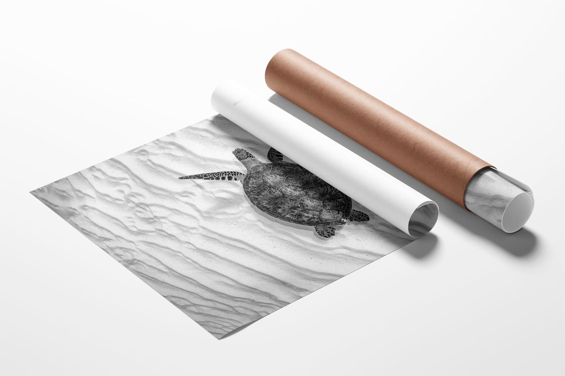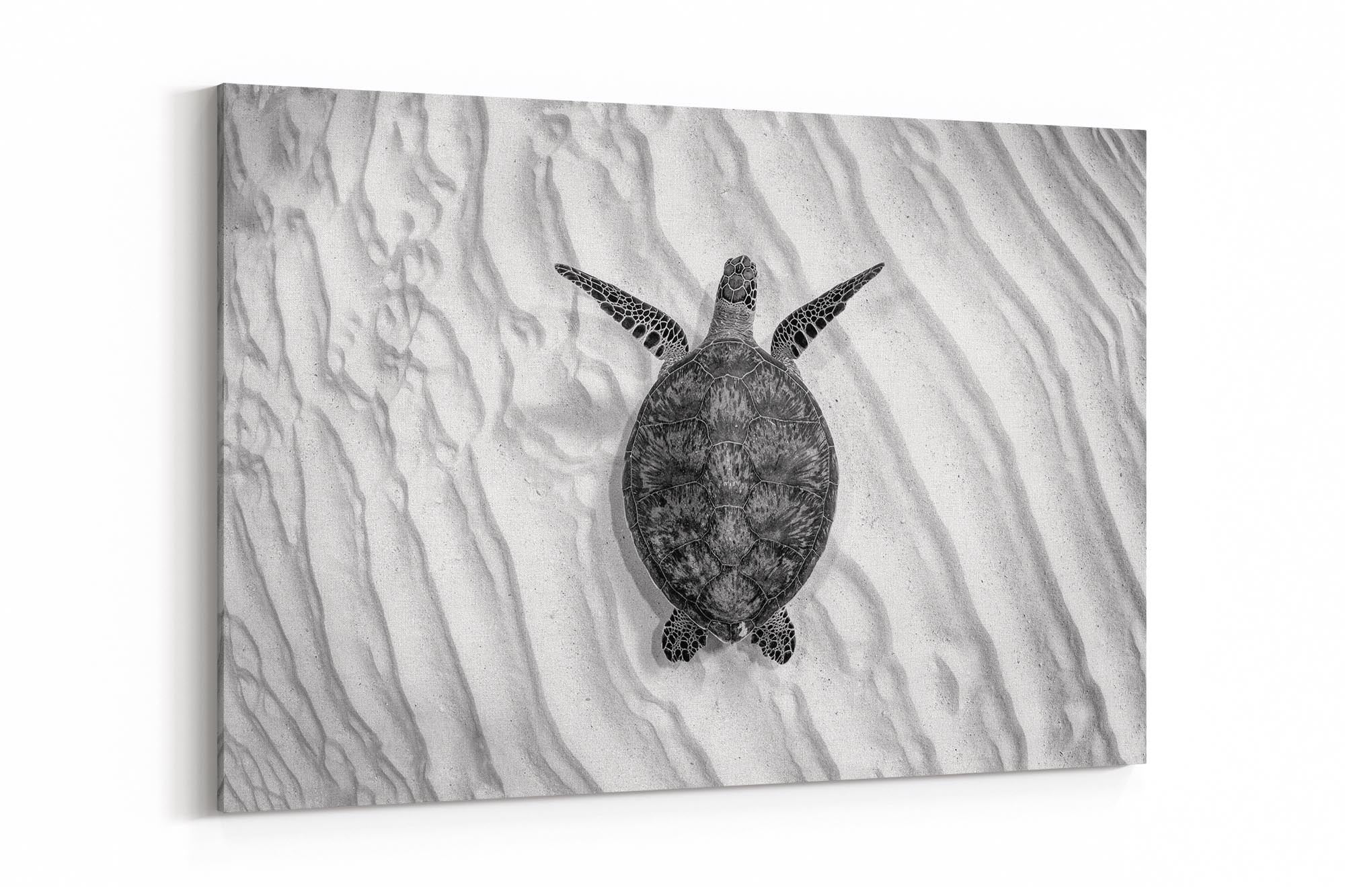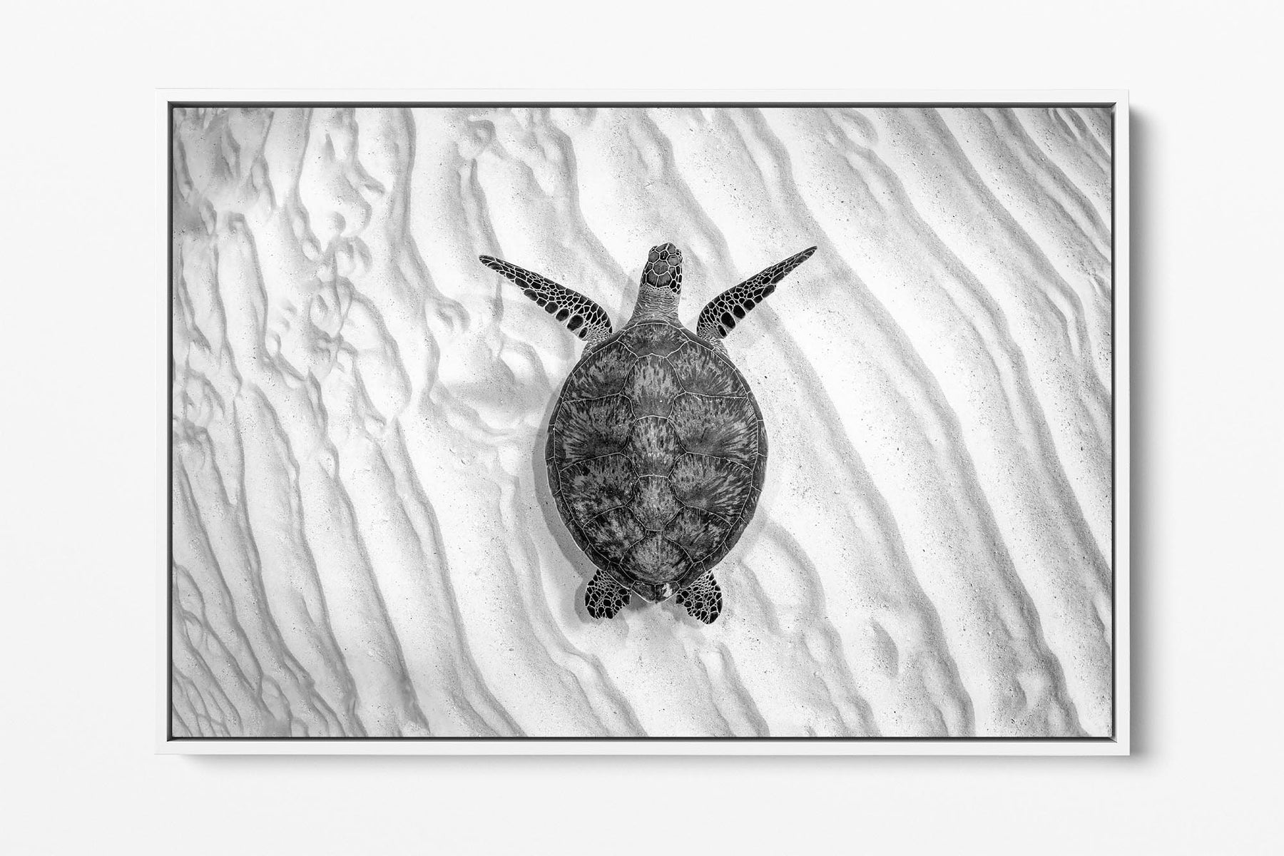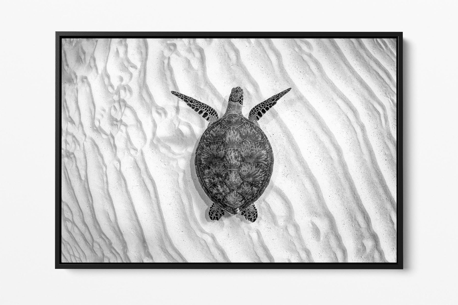This striking black-and-white underwater photography print caotures an endangered Green Sea Turtle (Chelonia mydas) gliding gracefully over the sandy seafloor of Lady Elliot Island’s UNESCO World Heritage-listed Southern Great Barrier Reef. Bathed in stark monochrome contrasts, the minimalist composition elevates the turtle’s elegant movements and intricate shell patterns, while the soft ripples of light on the seabed evoke a timeless, almost sculptural beauty.