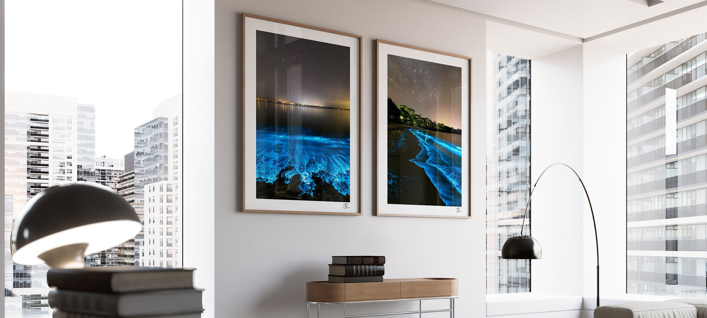 Discover the magical beauty of bioluminescence with award-winning photographer Jordan Robins. This exclusive collection features breathtaking bioluminescence prints, captured in Jervis Bay, showcasing the mesmerising blue glow produced by the bioluminescent microalgae Noctiluca scintillans.