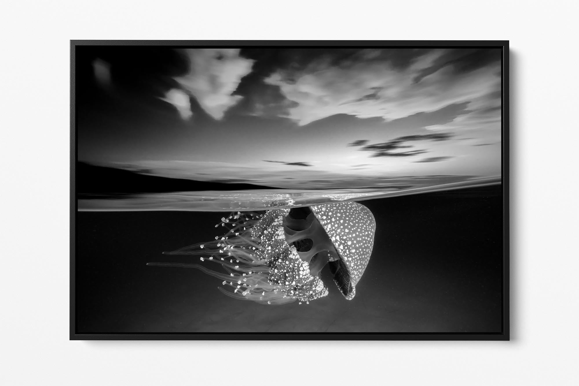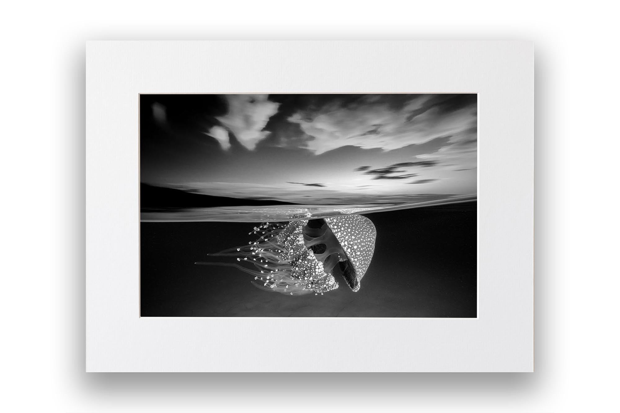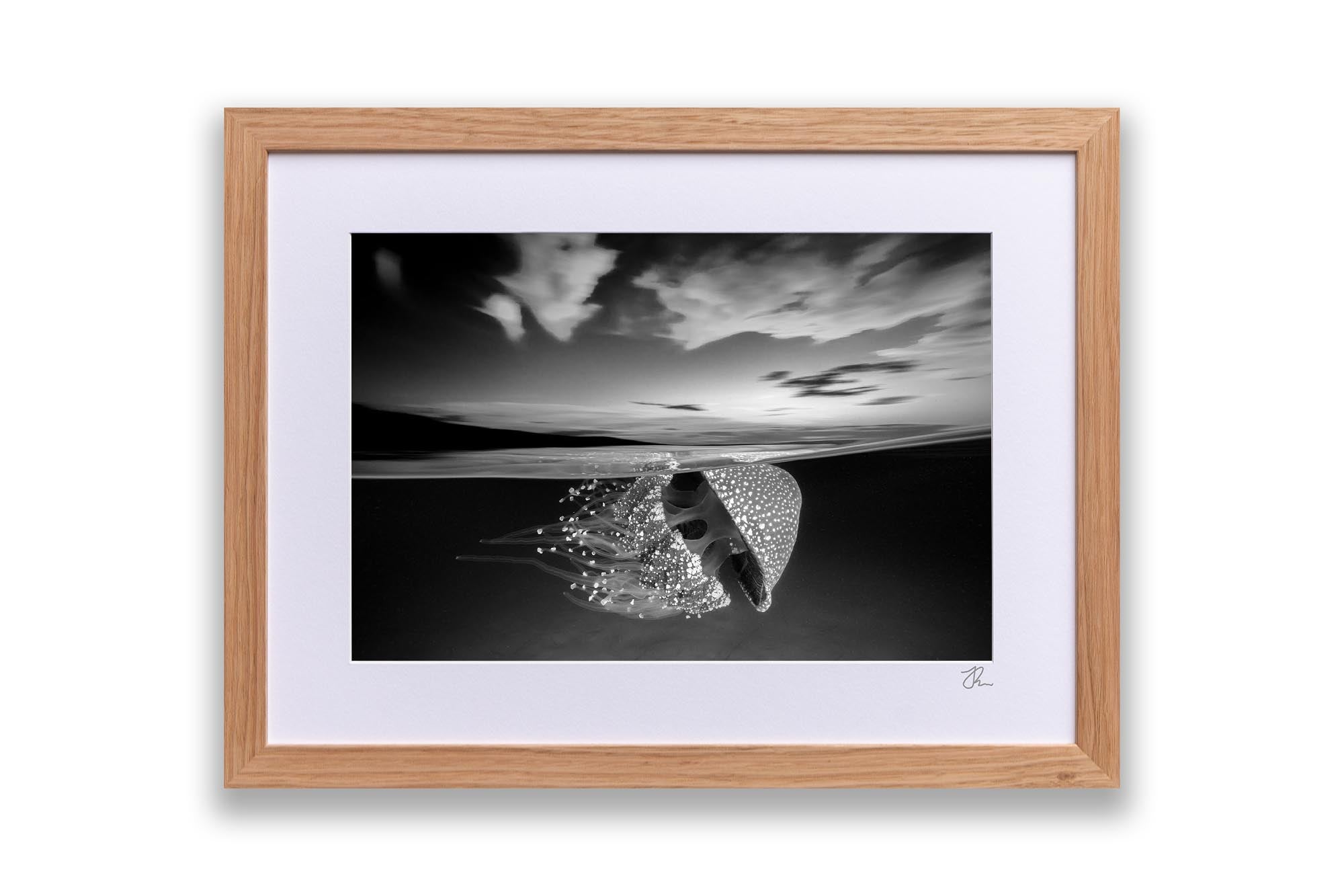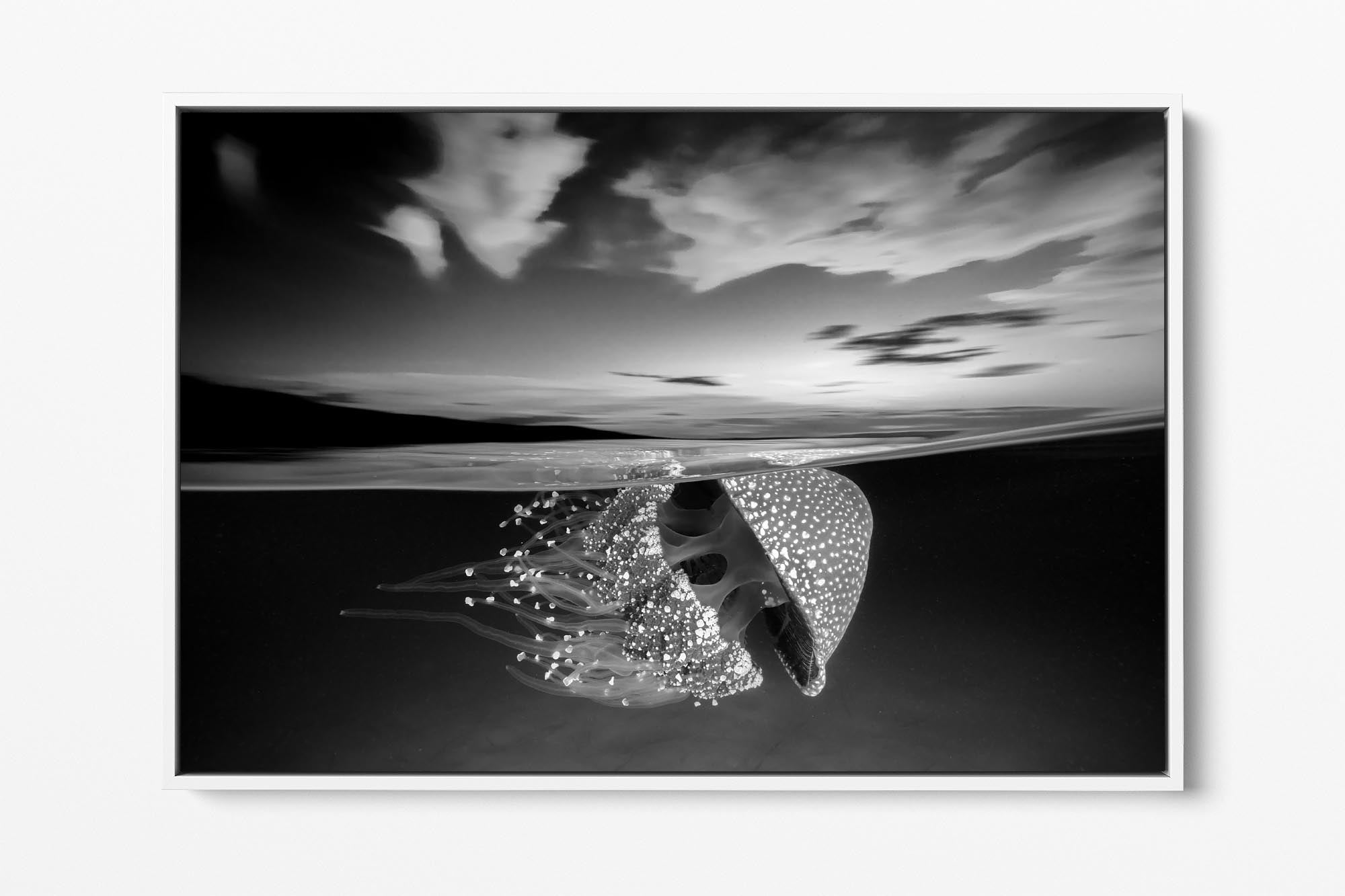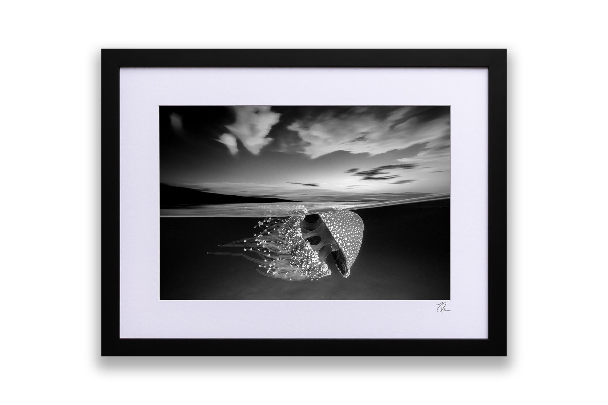 This striking black and white split shot print captures a White Spotted Jellyfish (Phyllorhiza punctata) drifting effortlessly in the currents of Jervis Bay, NSW South Coast, as the sun sets over the horizon. The over-under composition contrasts the jellyfish’s ghostly, translucent bell and trailing tentacles below the surface with the sunset above, creating a surreal masterpiece.