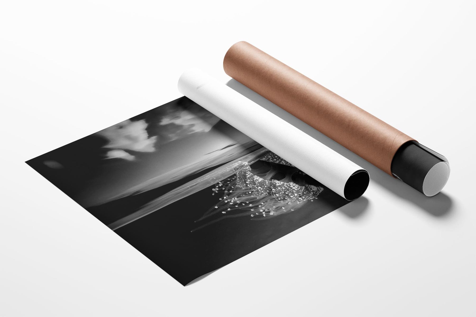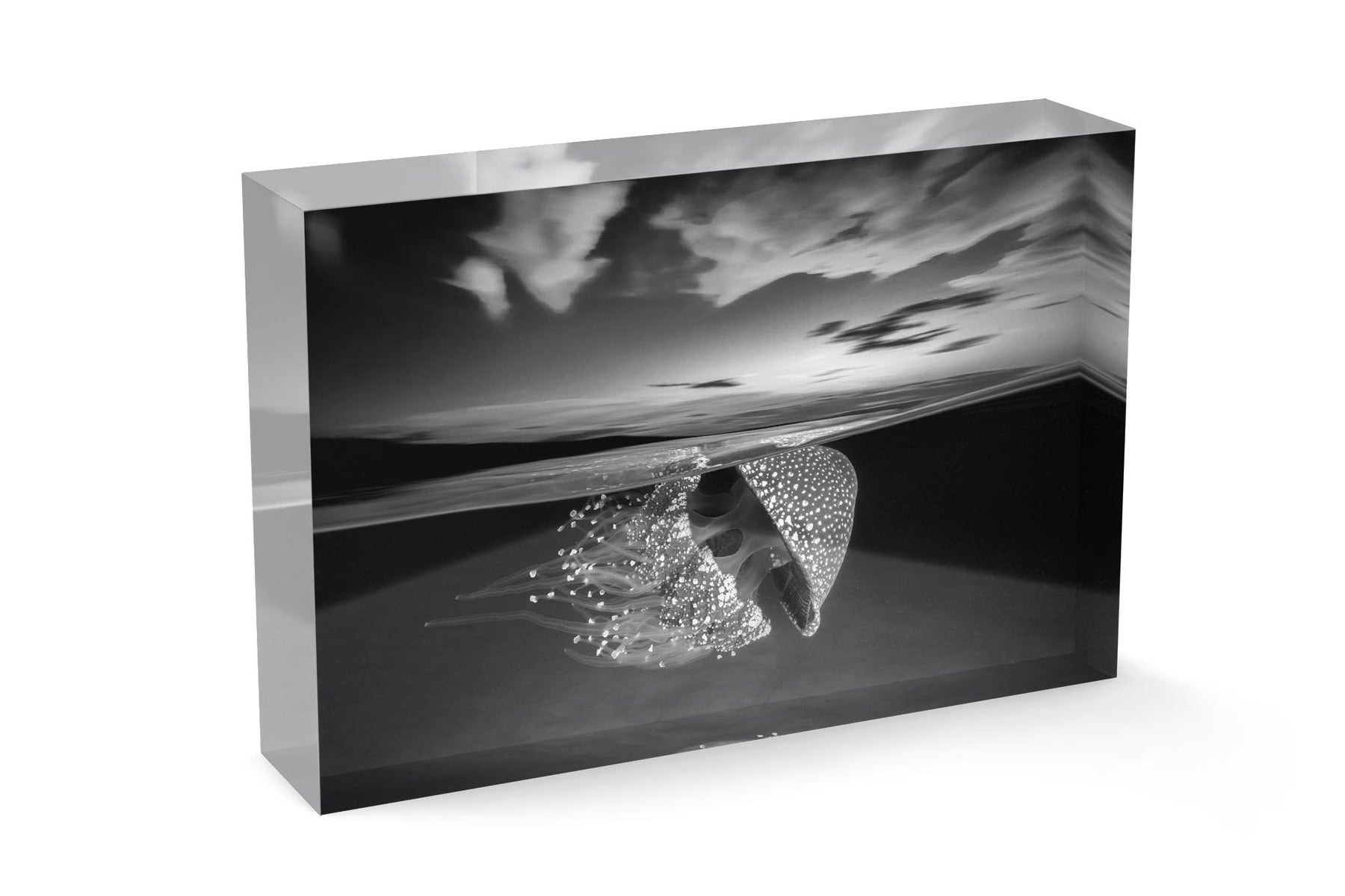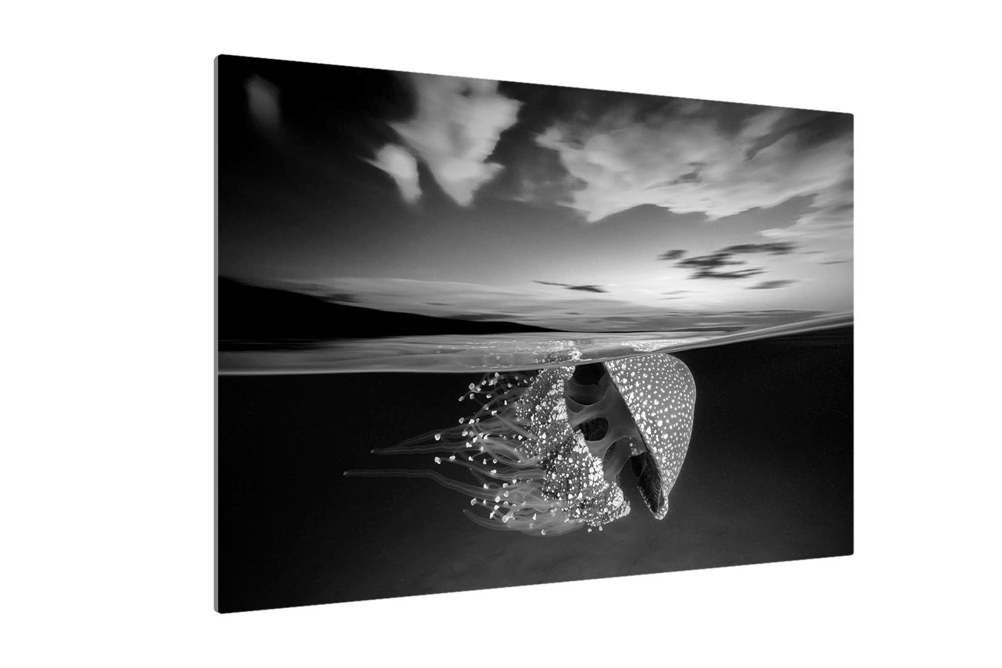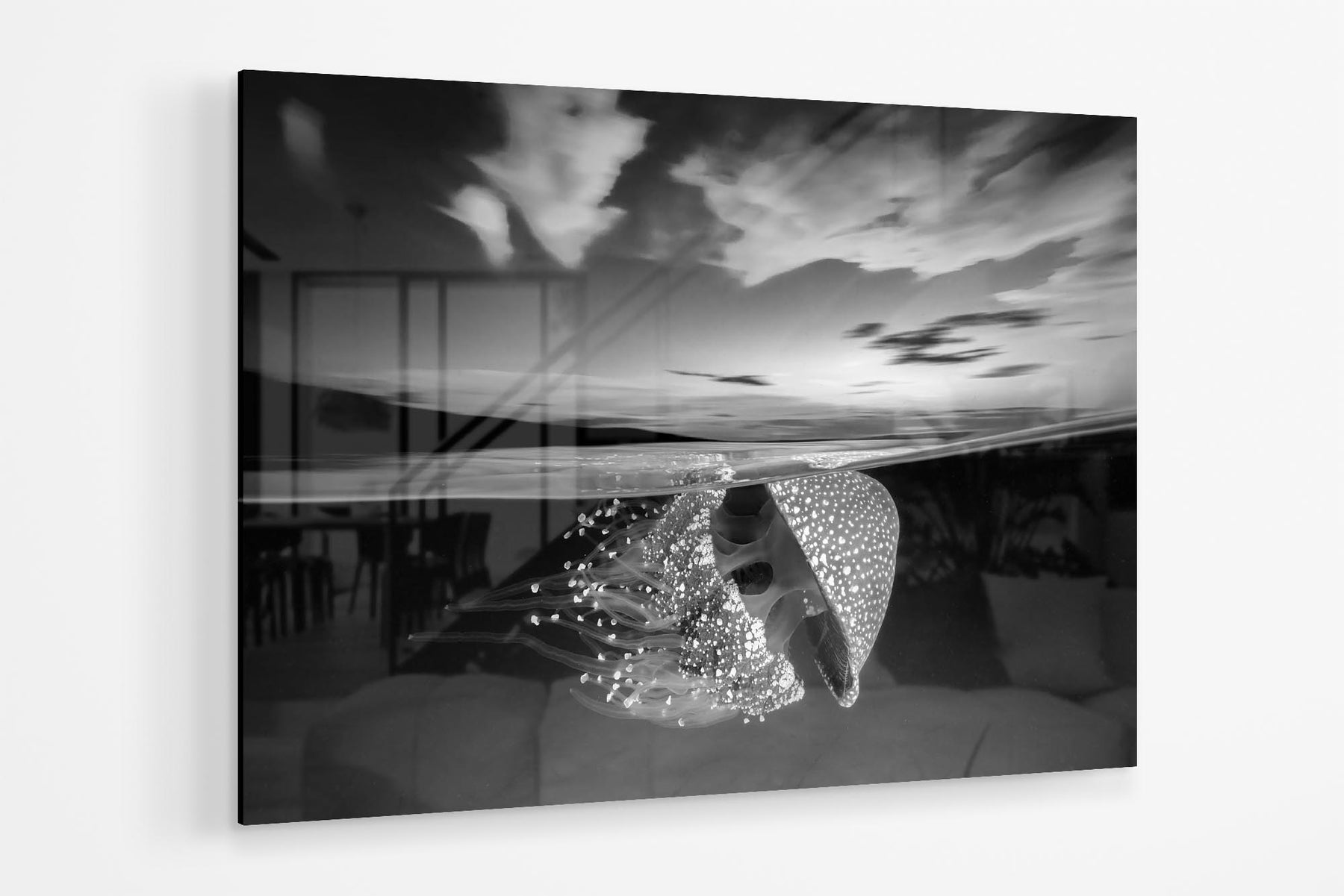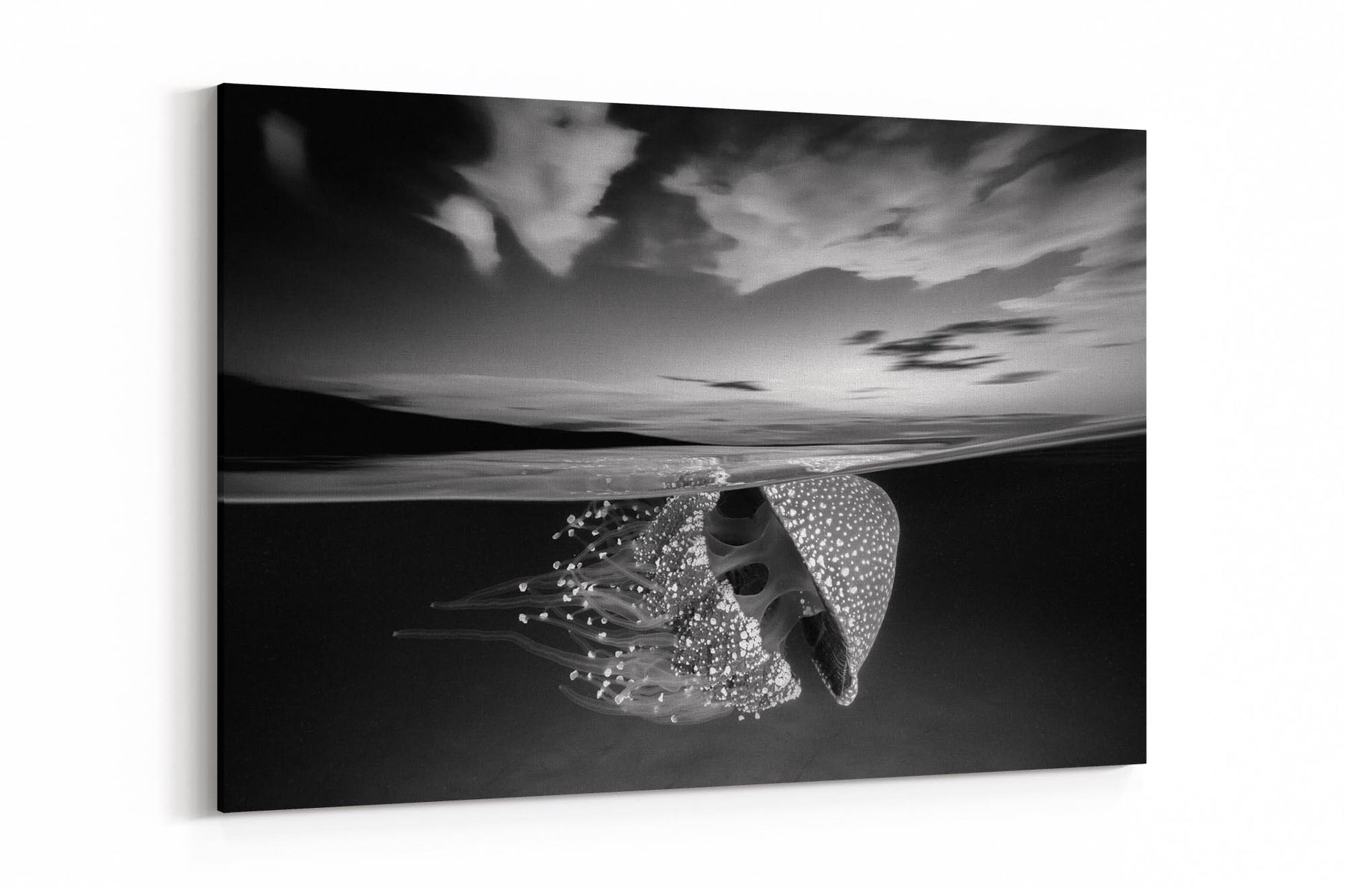 This striking black and white split shot print captures a White Spotted Jellyfish (Phyllorhiza punctata) drifting effortlessly in the currents of Jervis Bay, NSW South Coast, as the sun sets over the horizon. The over-under composition contrasts the jellyfish’s ghostly, translucent bell and trailing tentacles below the surface with the sunset above, creating a surreal masterpiece.