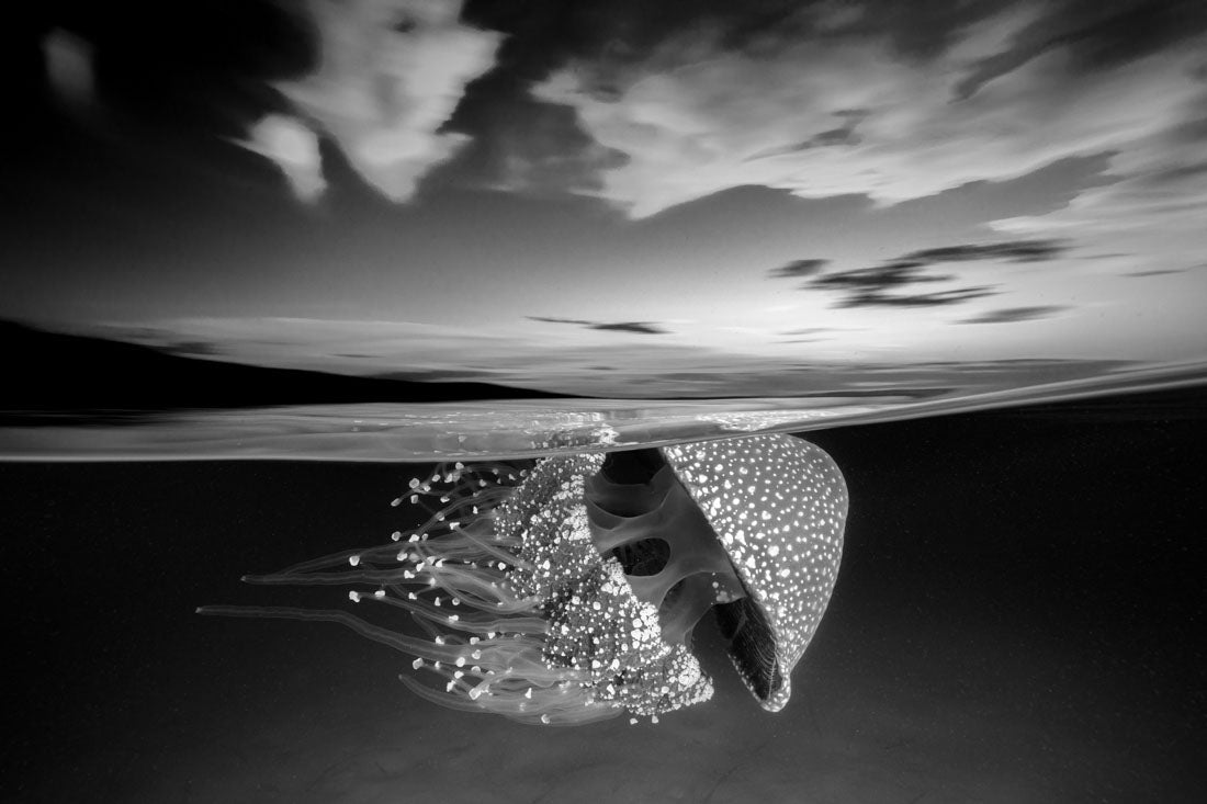 Monochrome Over Under Print – White Spotted Jellyfish at Sunset, Jervis Bay, Australia