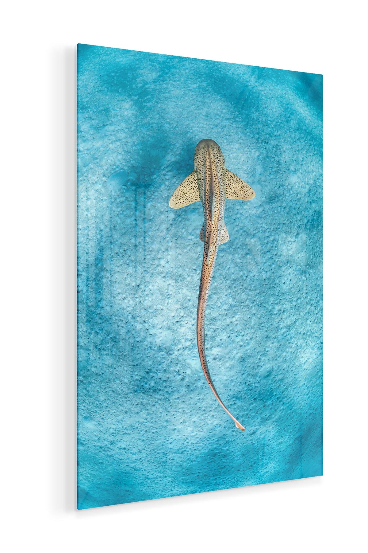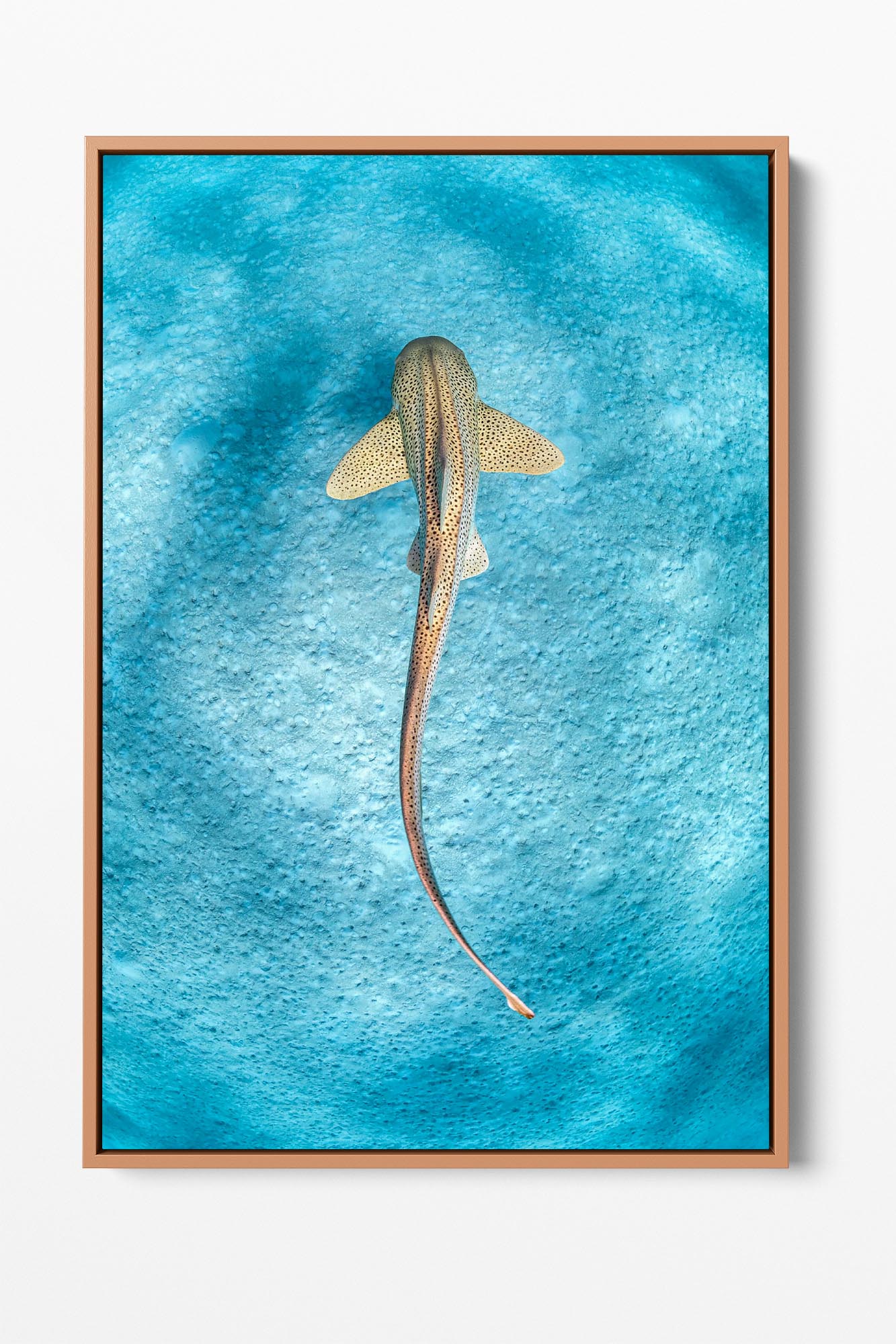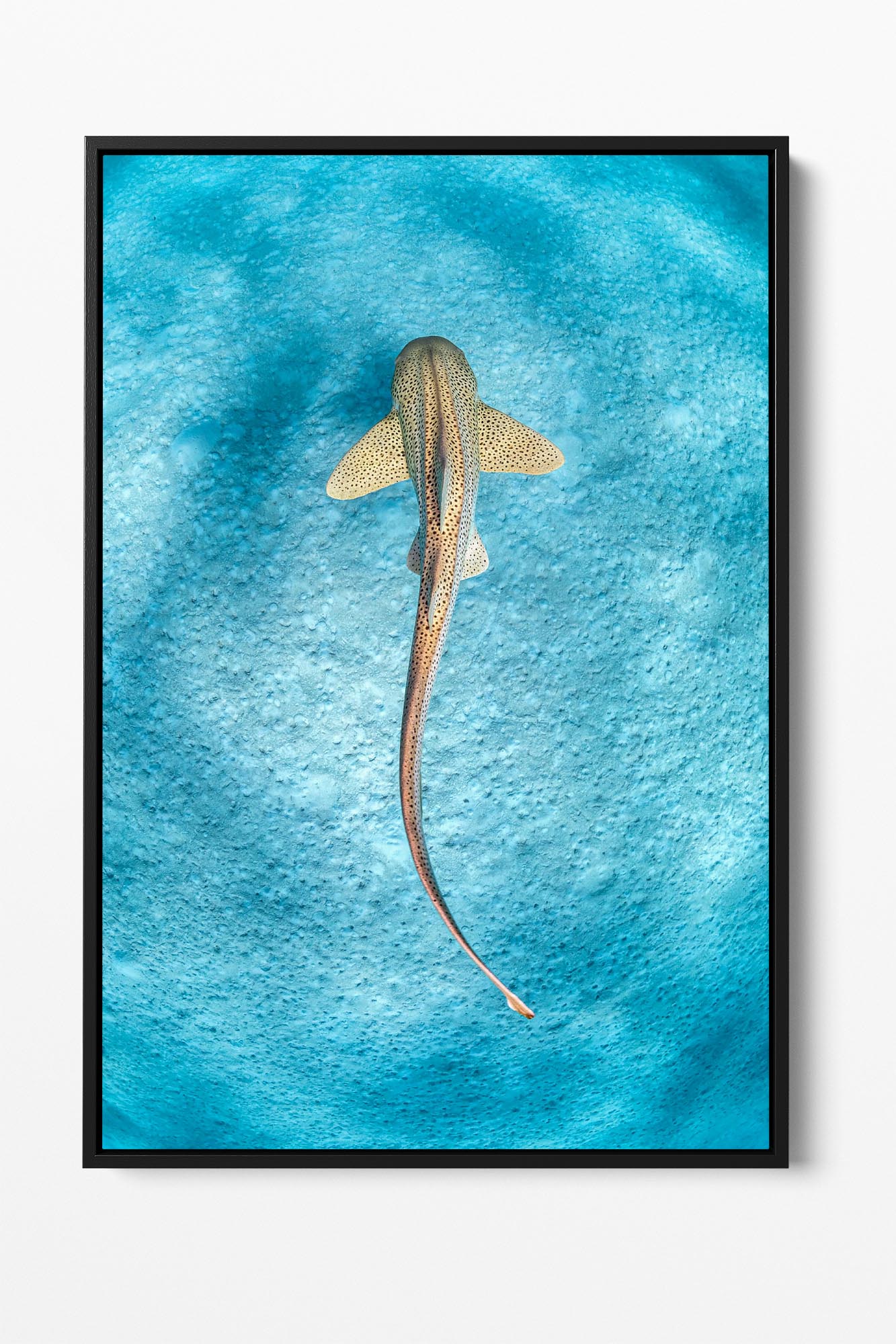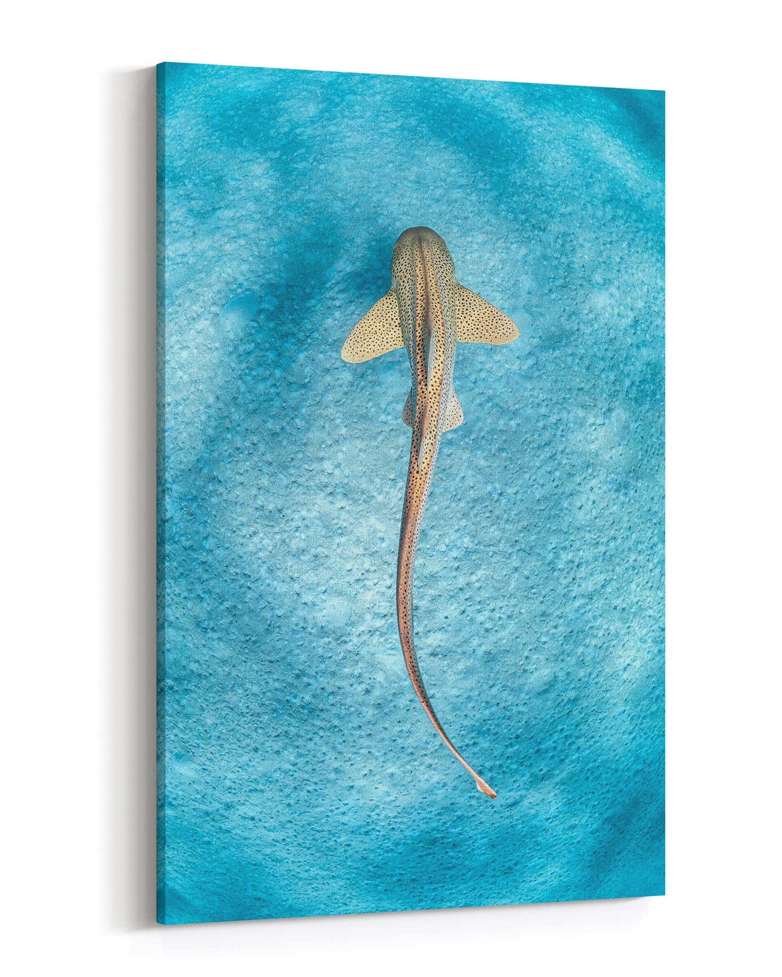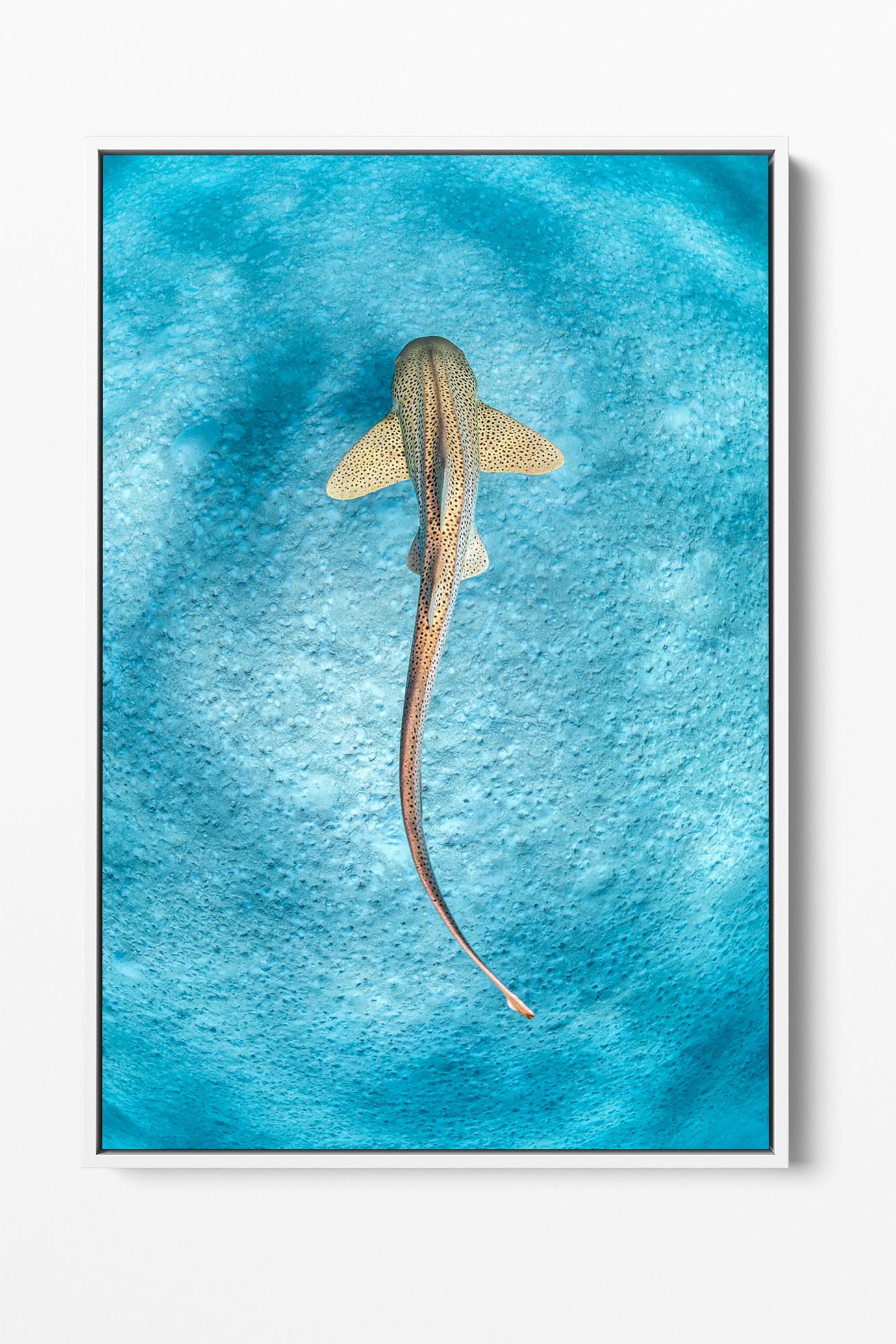 This stunning photo print captures a Leopard Shark gracefully gliding over the sandy sea floor in the crystal-clear waters of the Ningaloo Reef, Western Australia. Known for their distinctive patterns and elegant movements, these sharks are also referred to as Zebra Sharks in other parts of the world, but in Australia, they are referred as Leopard Sharks.