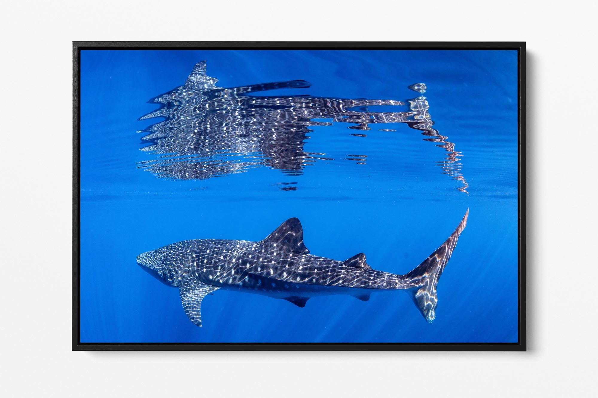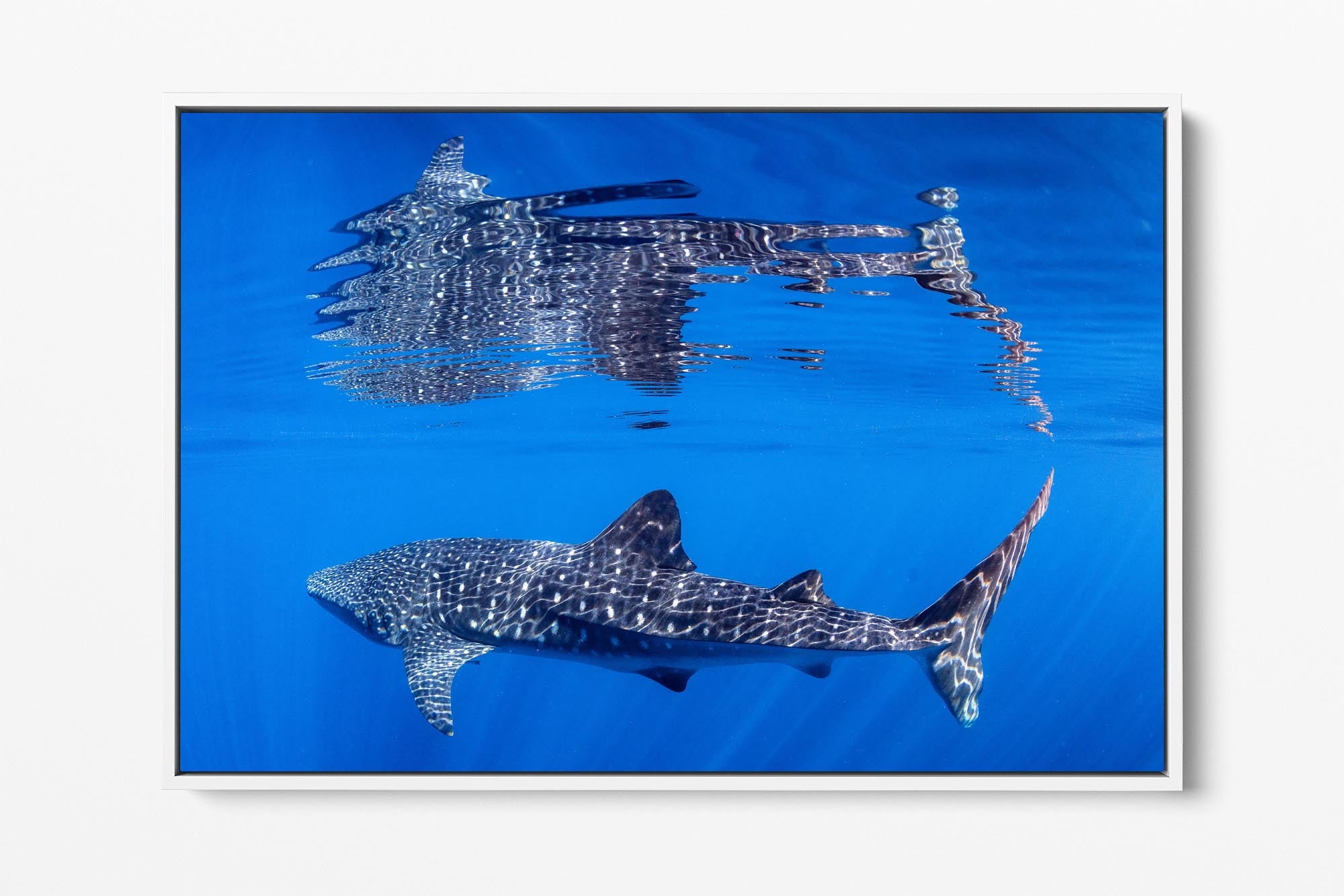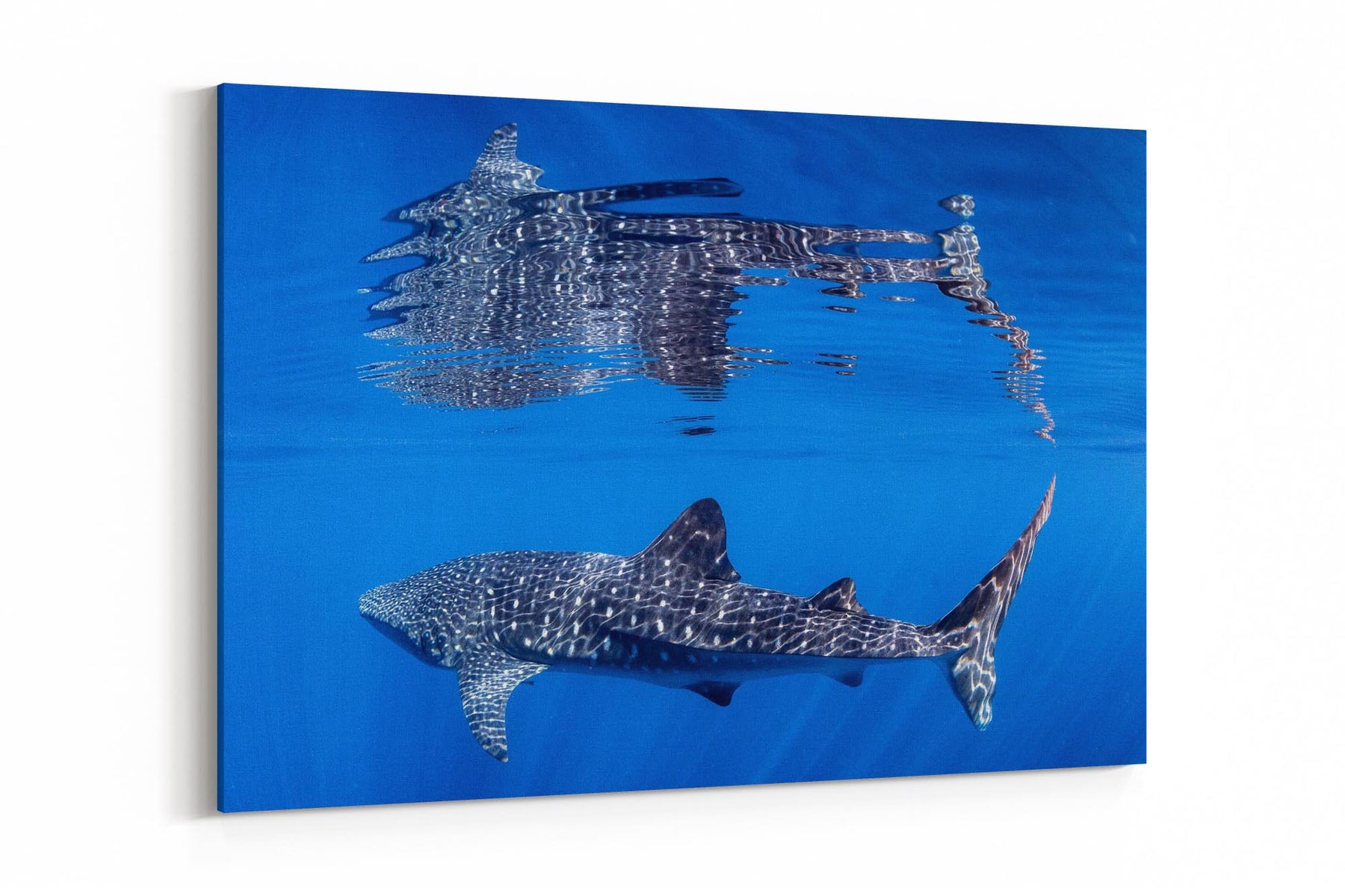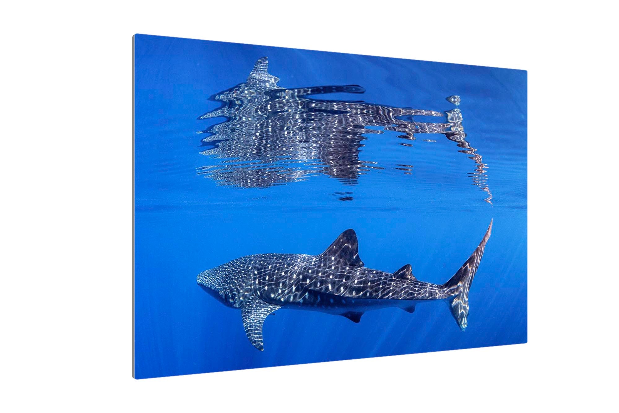 Behold nature's perfect symmetry with this breathtaking underwater photograph capturing a majestic Whale Shark gliding beneath the ocean's surface, its massive form mirrored in a flawless reflection on the oceans surface. Shot in the crystal-clear waters off Exmouth and Coral Bay on Western Australia's Ningaloo Reef, this artwork transforms an extraordinary marine encounter into a mesmerising display of light, water and scale.