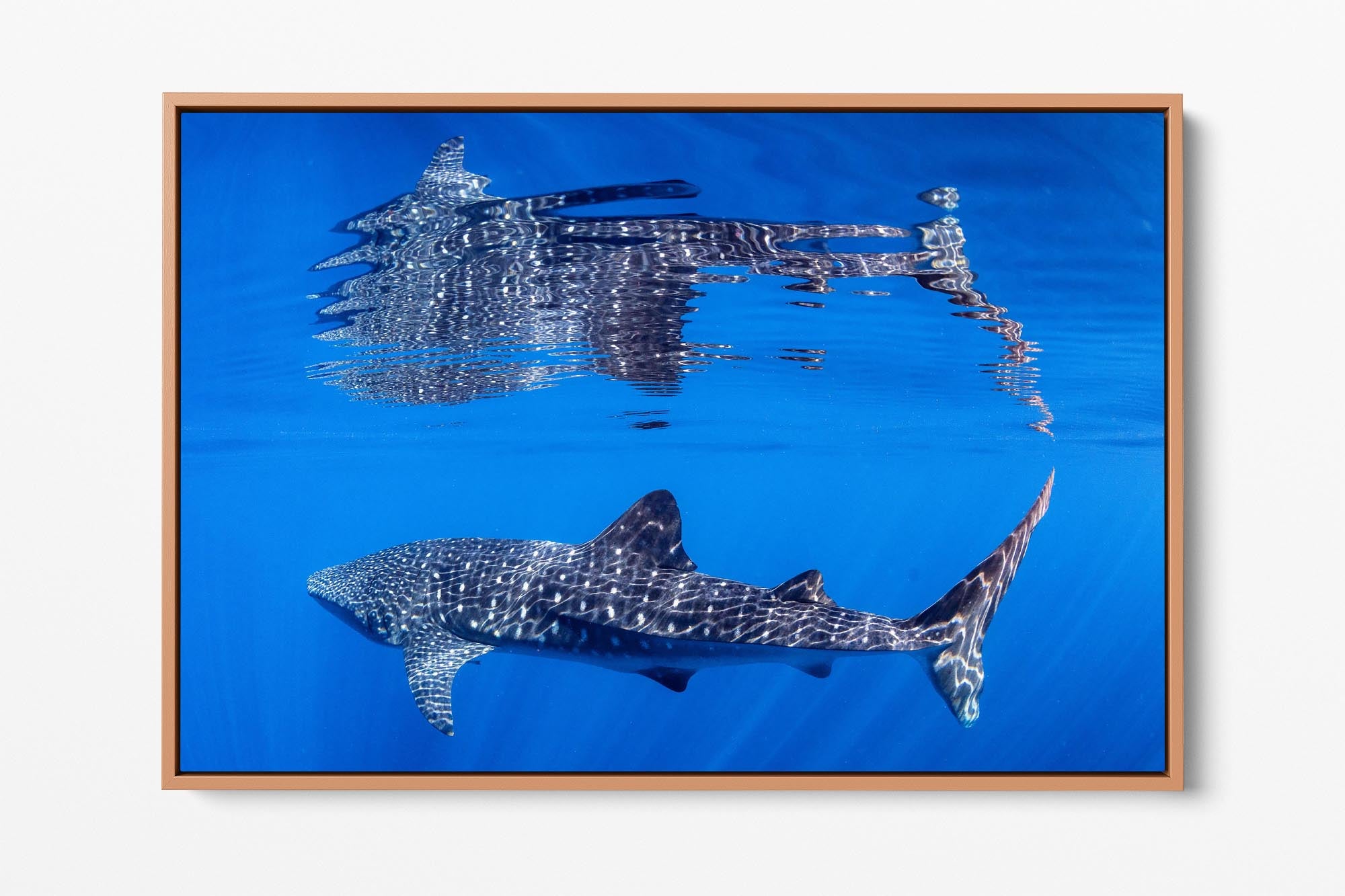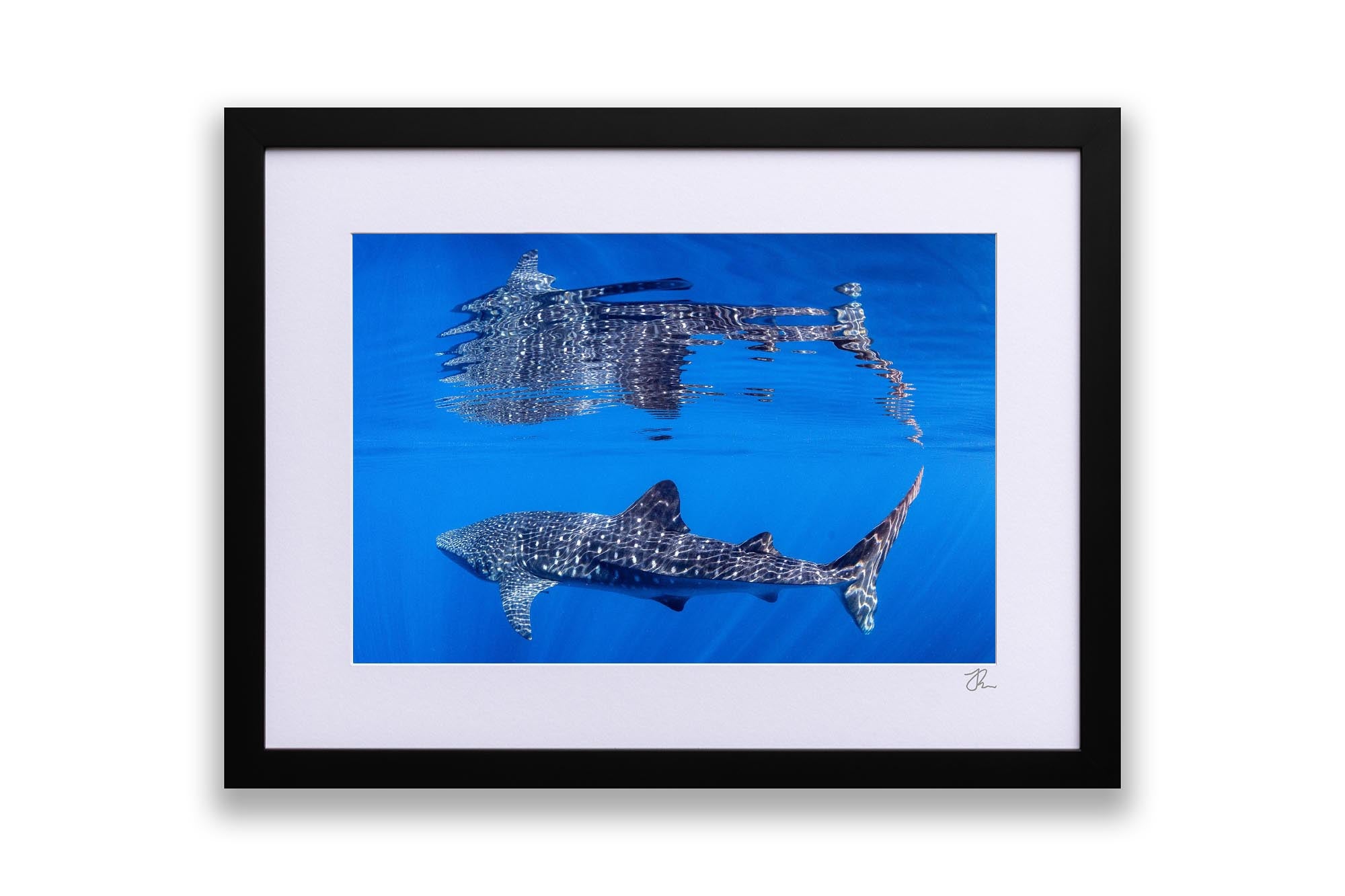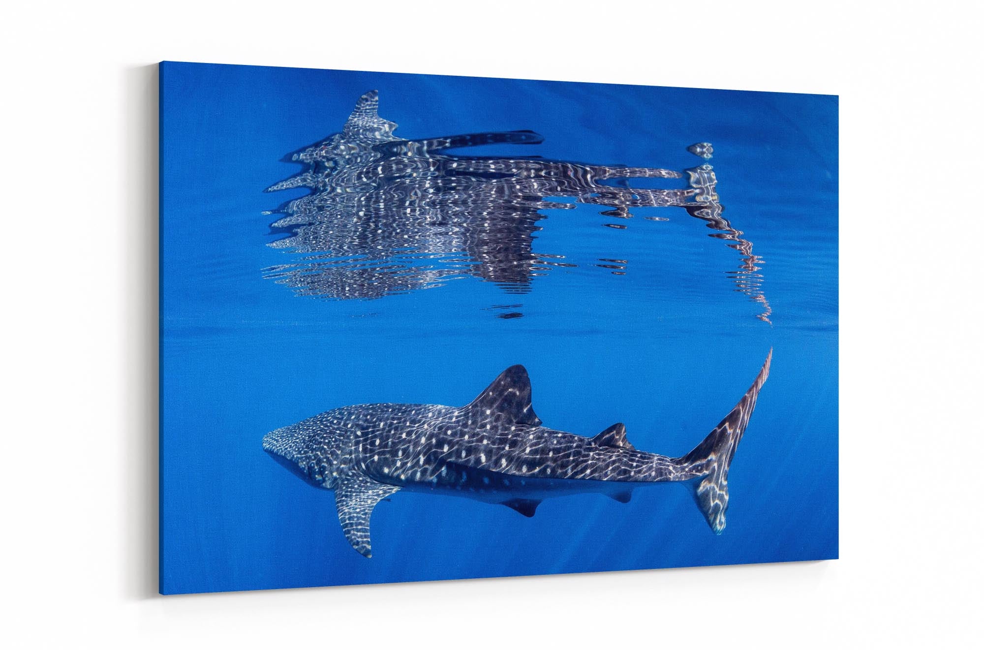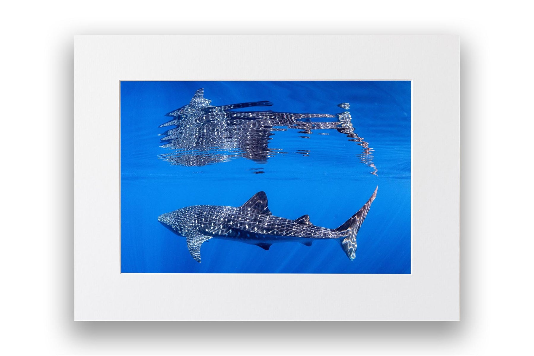 Behold nature's perfect symmetry with this breathtaking underwater photograph capturing a majestic Whale Shark gliding beneath the ocean's surface, its massive form mirrored in a flawless reflection on the oceans surface. Shot in the crystal-clear waters off Exmouth and Coral Bay on Western Australia's Ningaloo Reef, this artwork transforms an extraordinary marine encounter into a mesmerising display of light, water and scale.