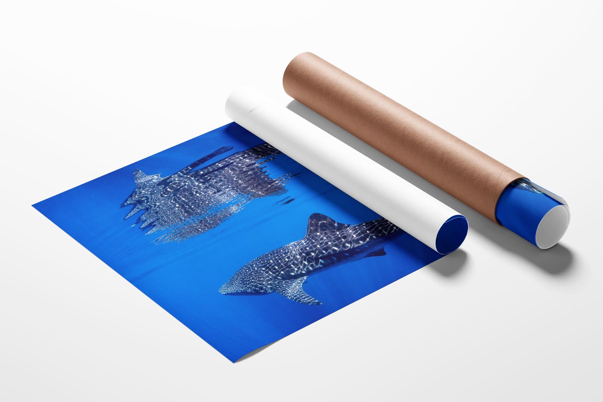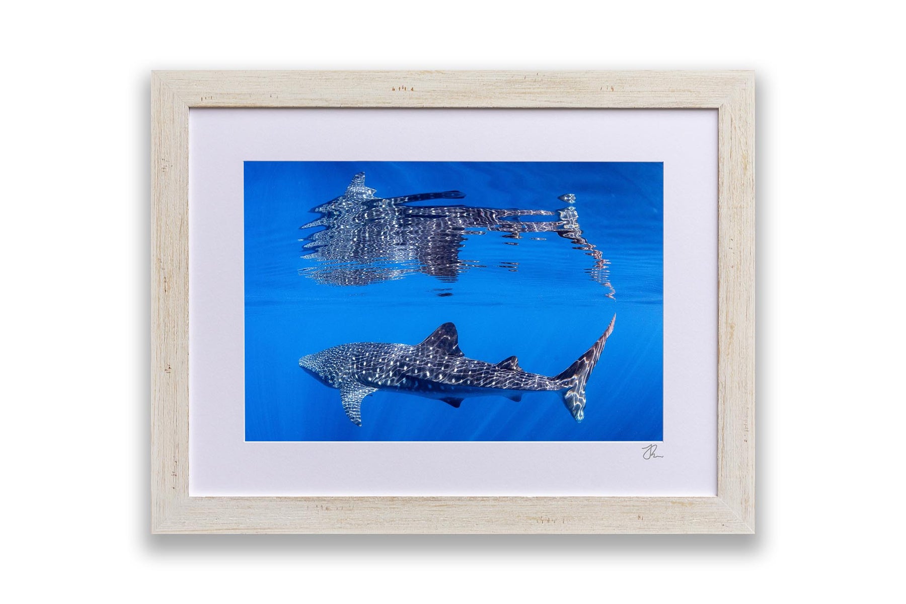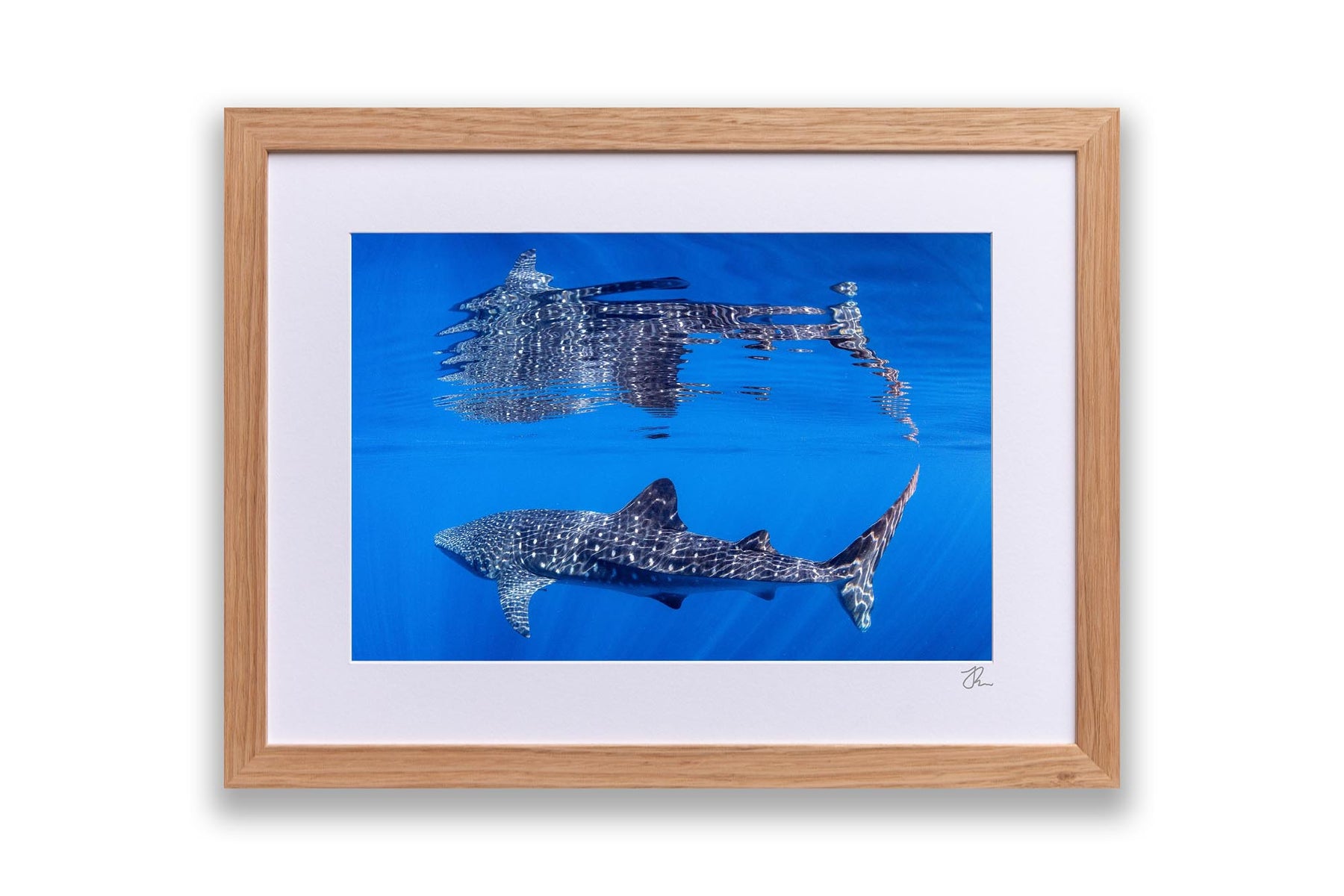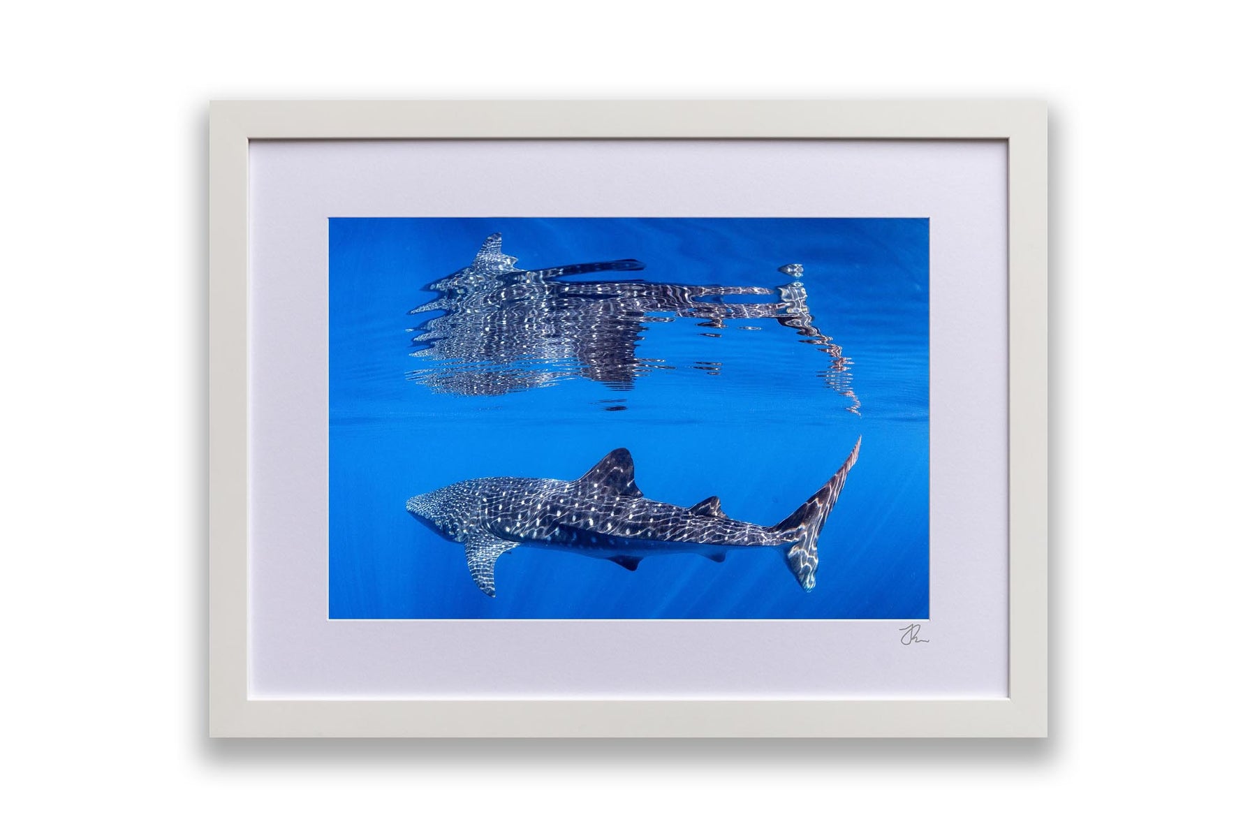 Behold nature's perfect symmetry with this breathtaking underwater photograph capturing a majestic Whale Shark gliding beneath the ocean's surface, its massive form mirrored in a flawless reflection on the oceans surface. Shot in the crystal-clear waters off Exmouth and Coral Bay on Western Australia's Ningaloo Reef, this artwork transforms an extraordinary marine encounter into a mesmerising display of light, water and scale.