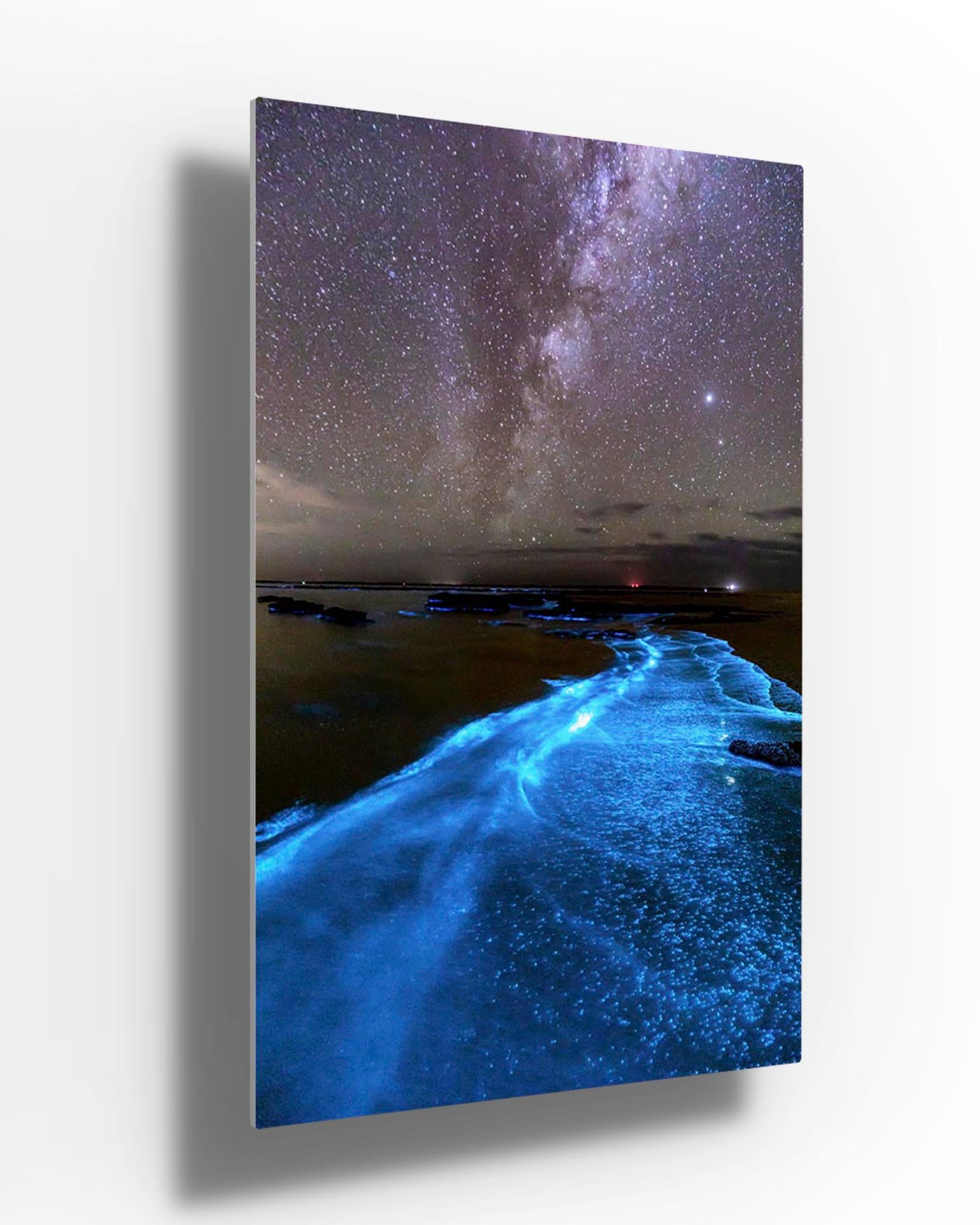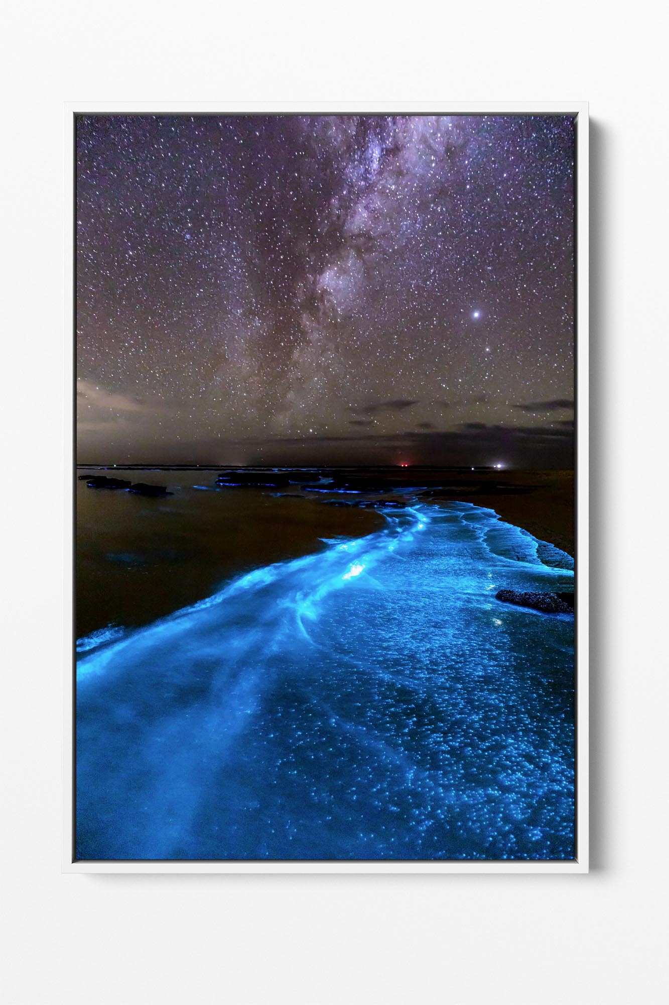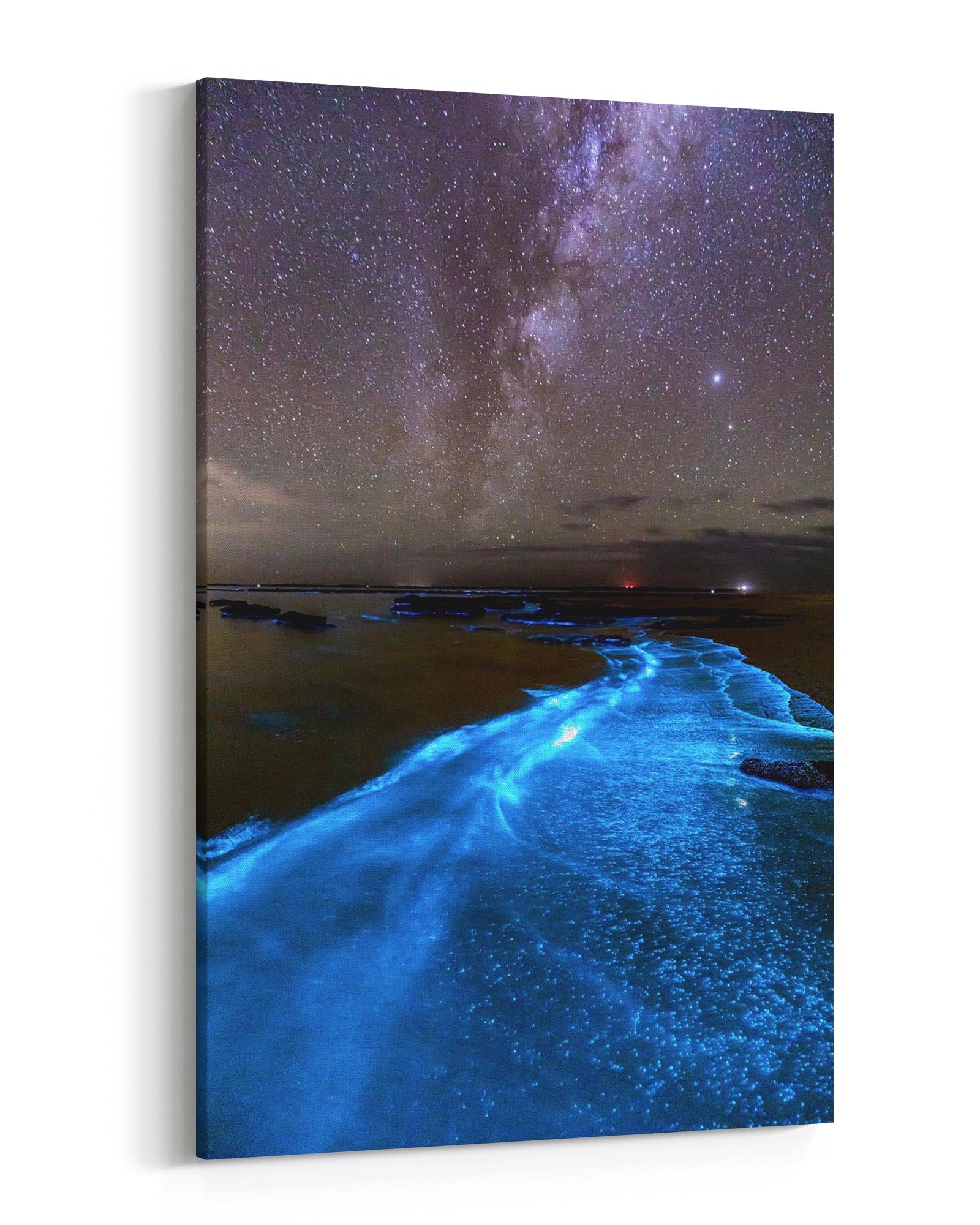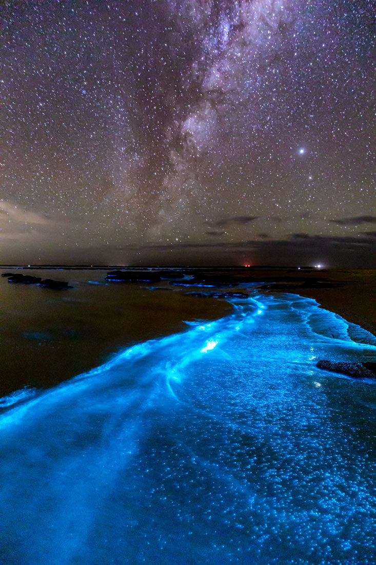 Bioluminescence lighting up the shoreline a bright blue at Plantation Point in Jervis Bay beneath a star filled sky.