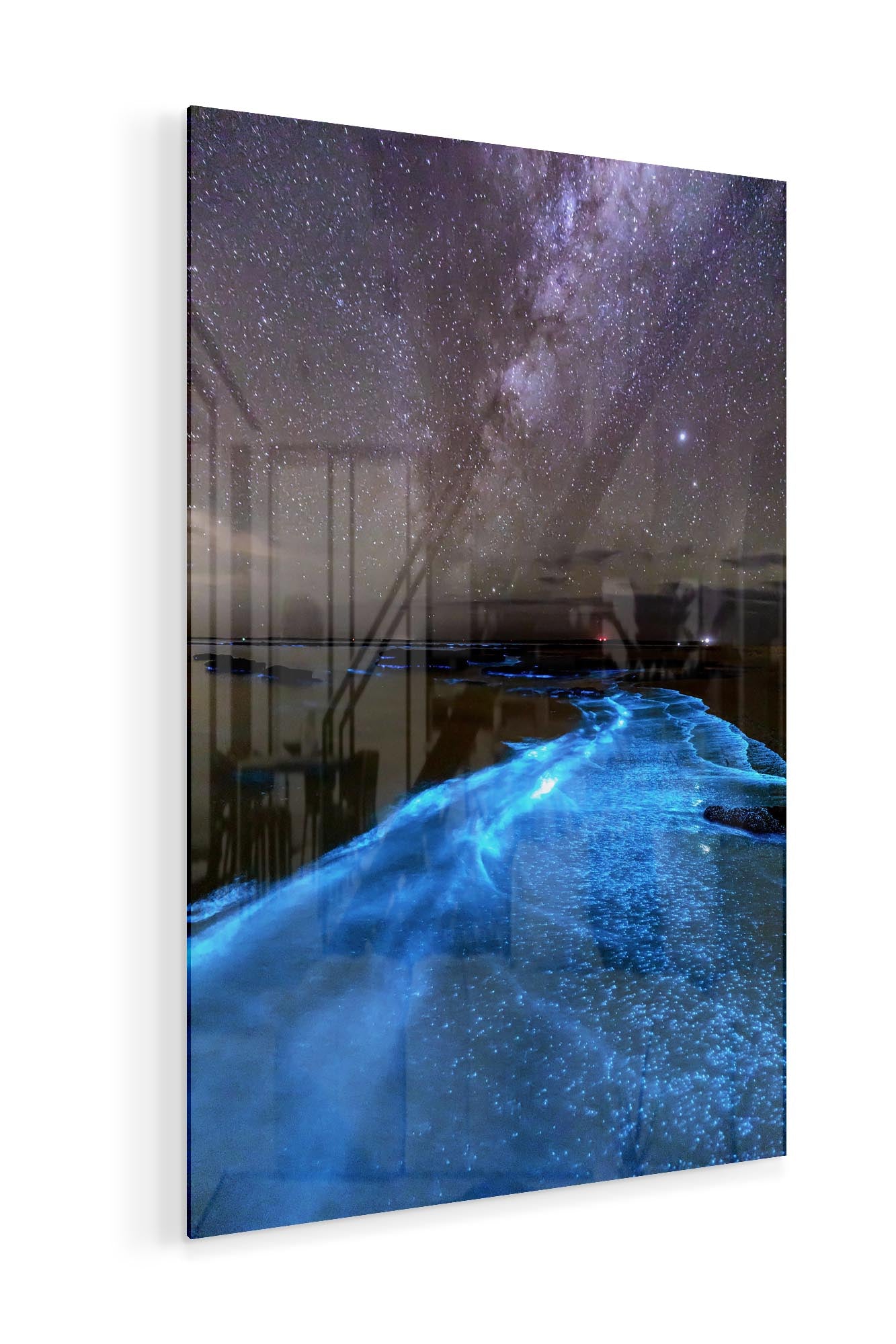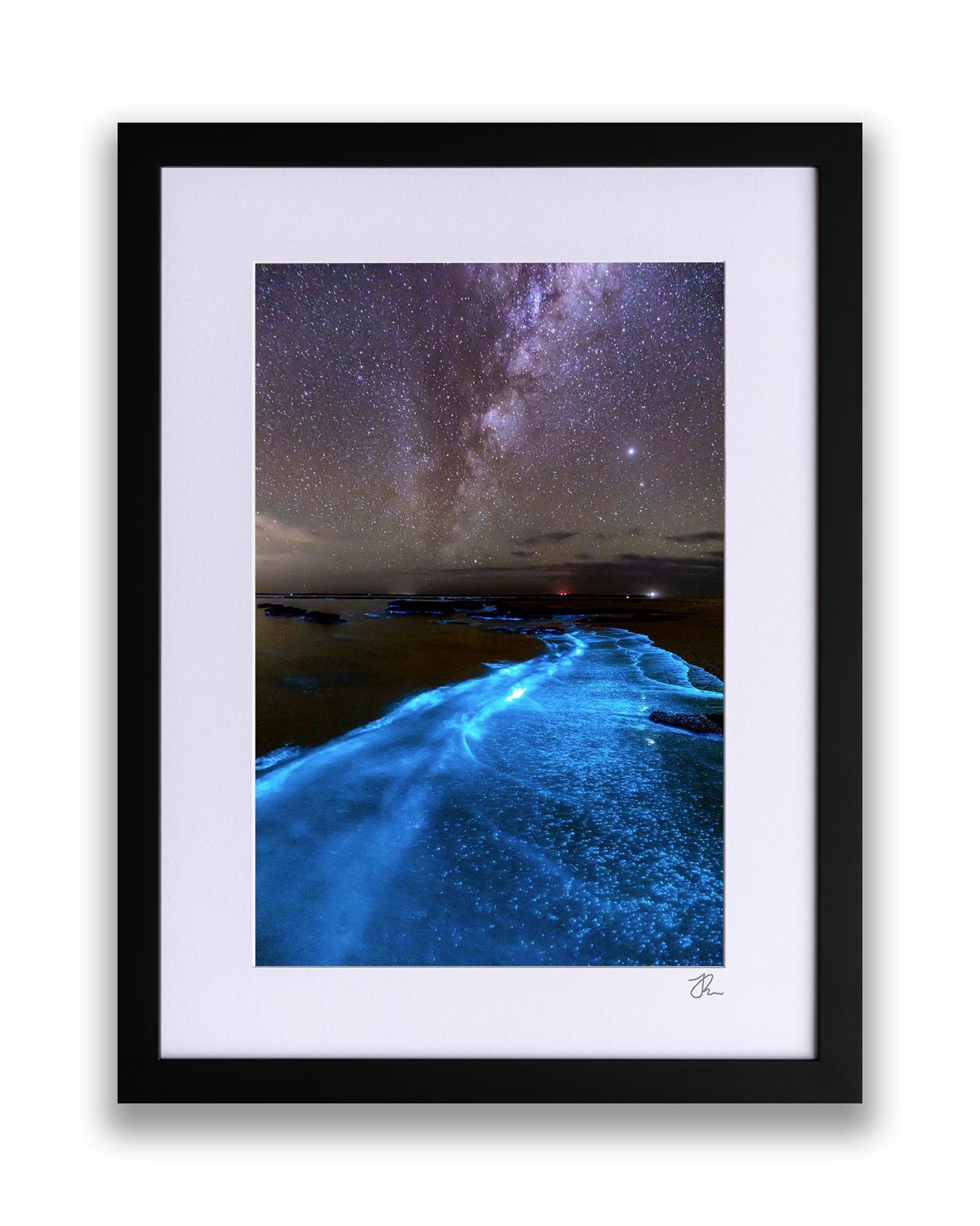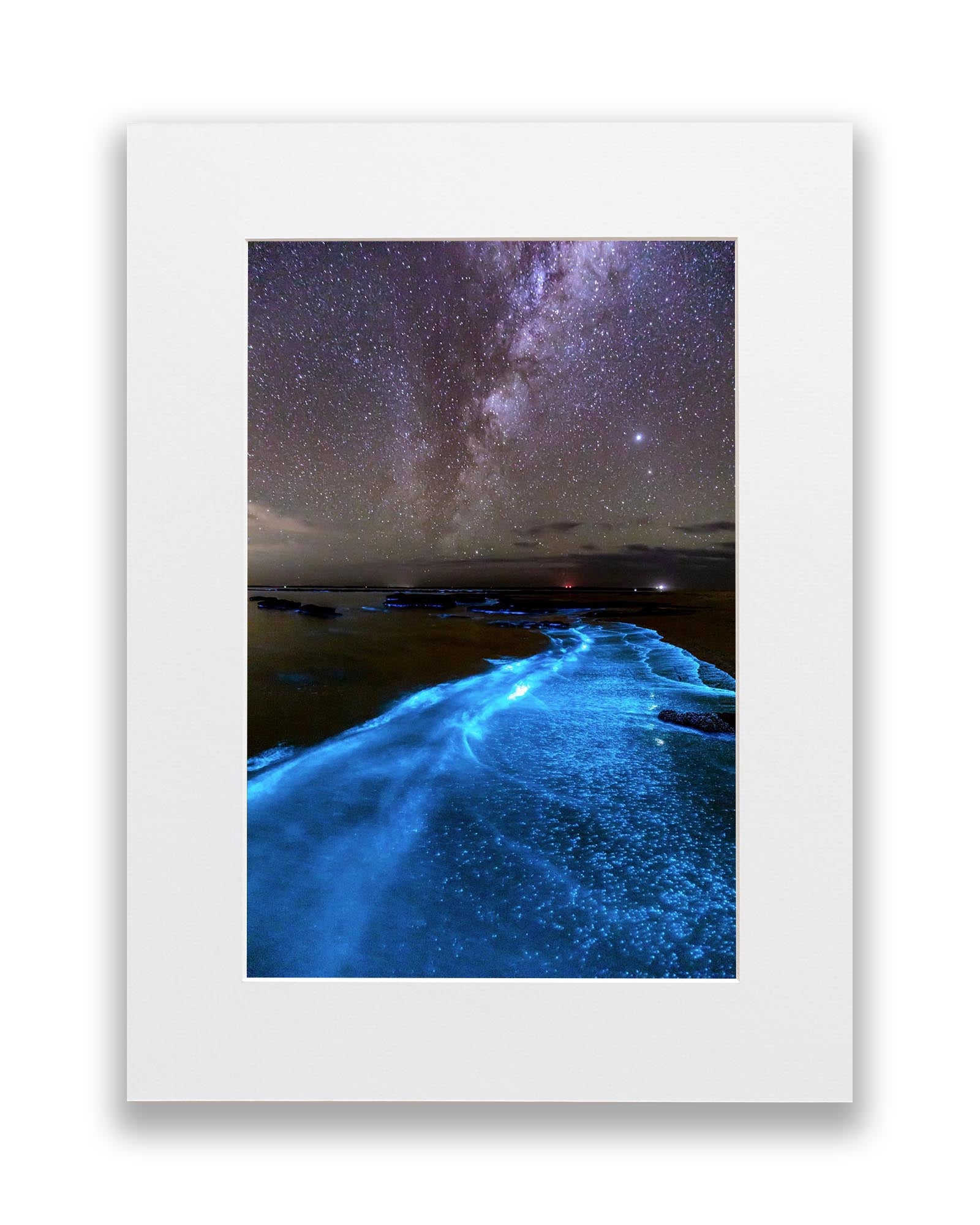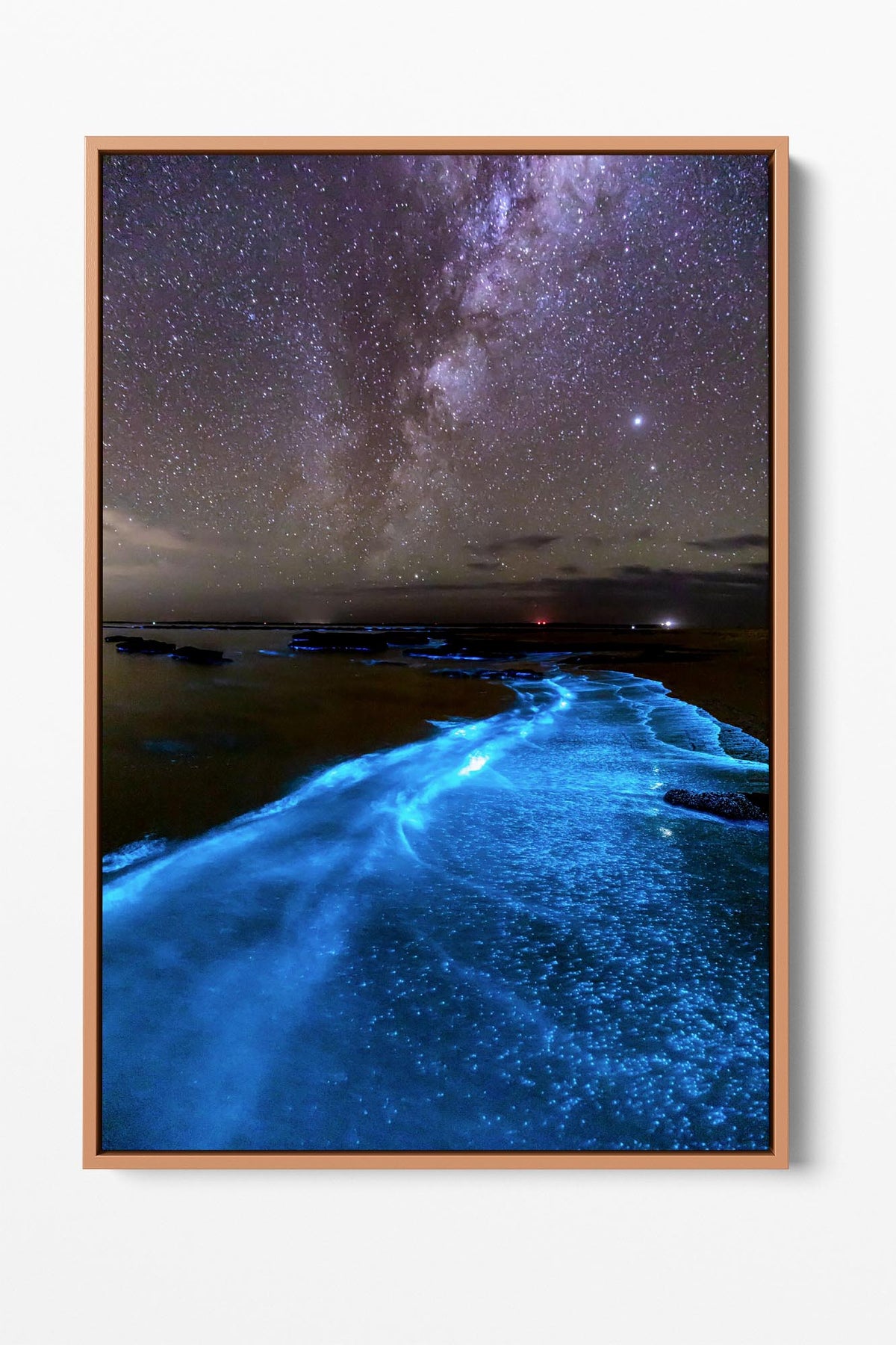 Bioluminescence lighting up the shoreline a bright blue at Plantation Point in Jervis Bay beneath a star filled sky.