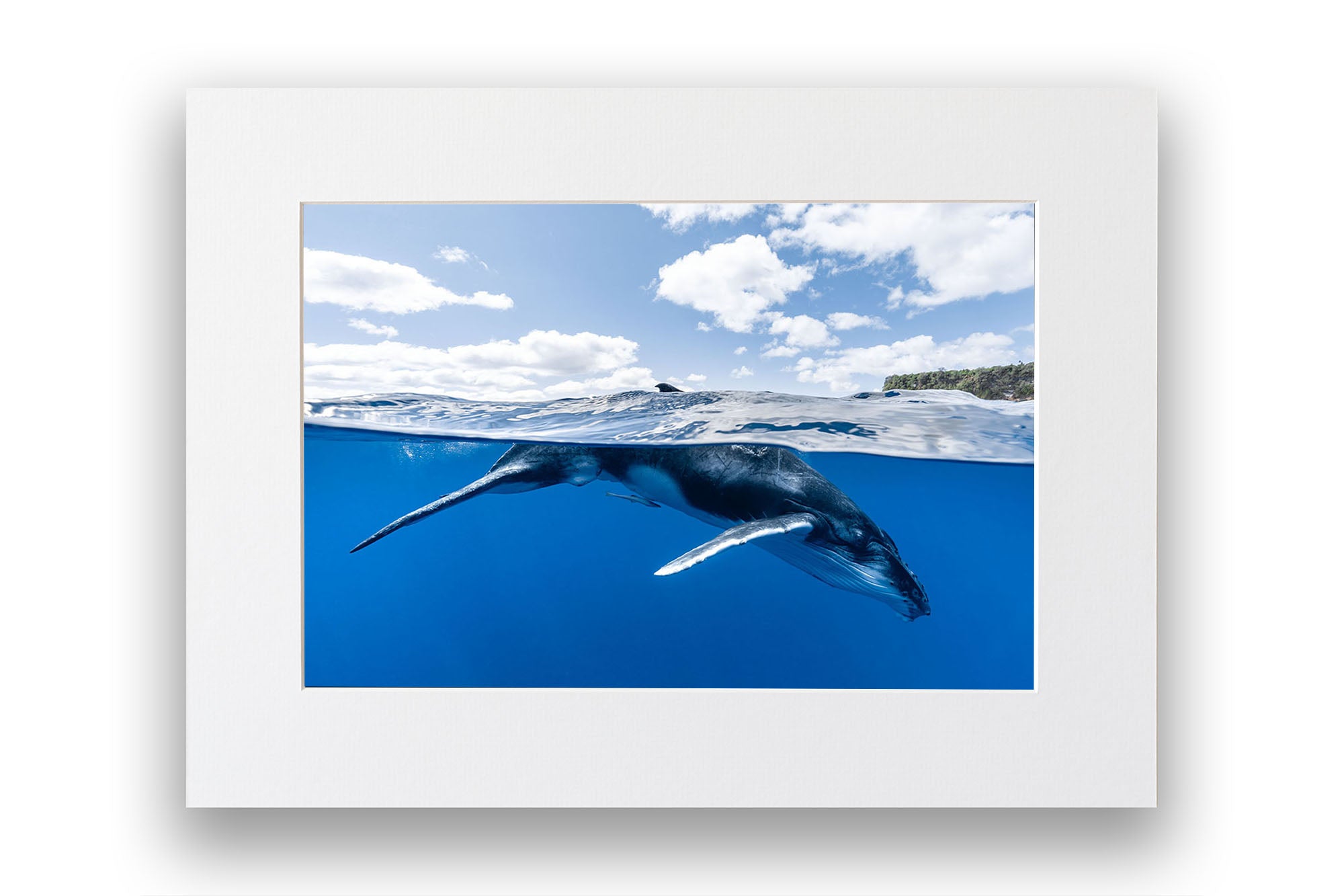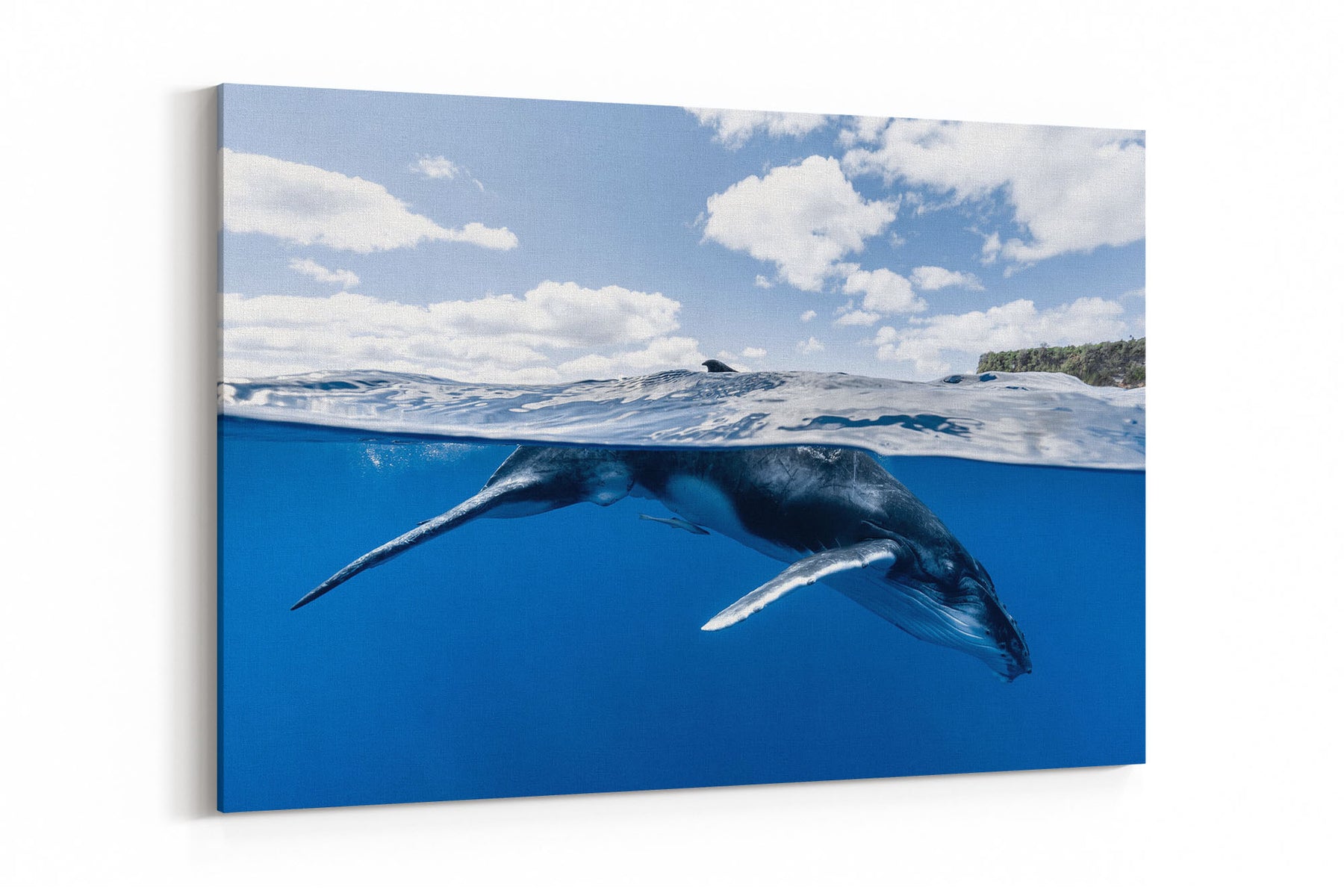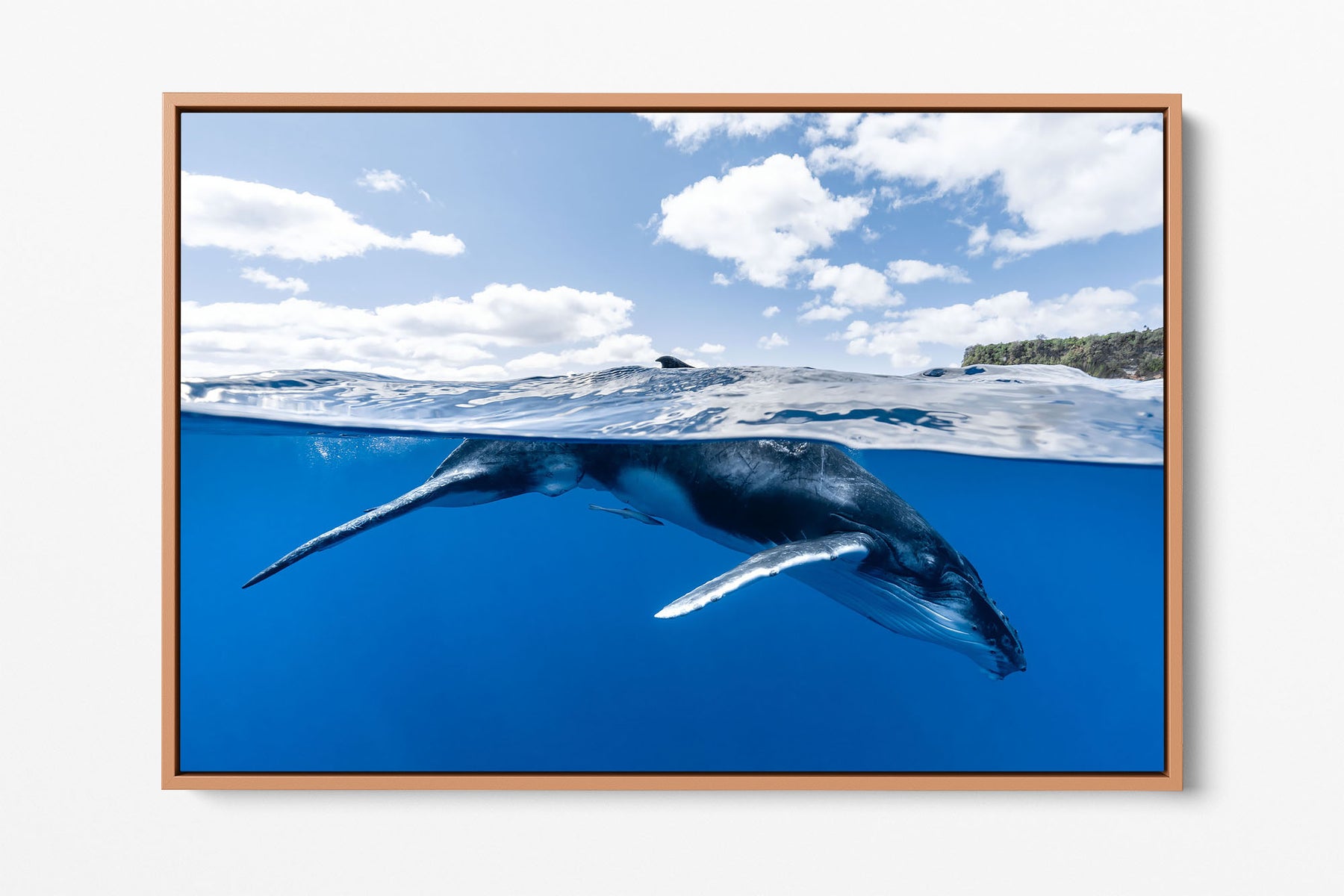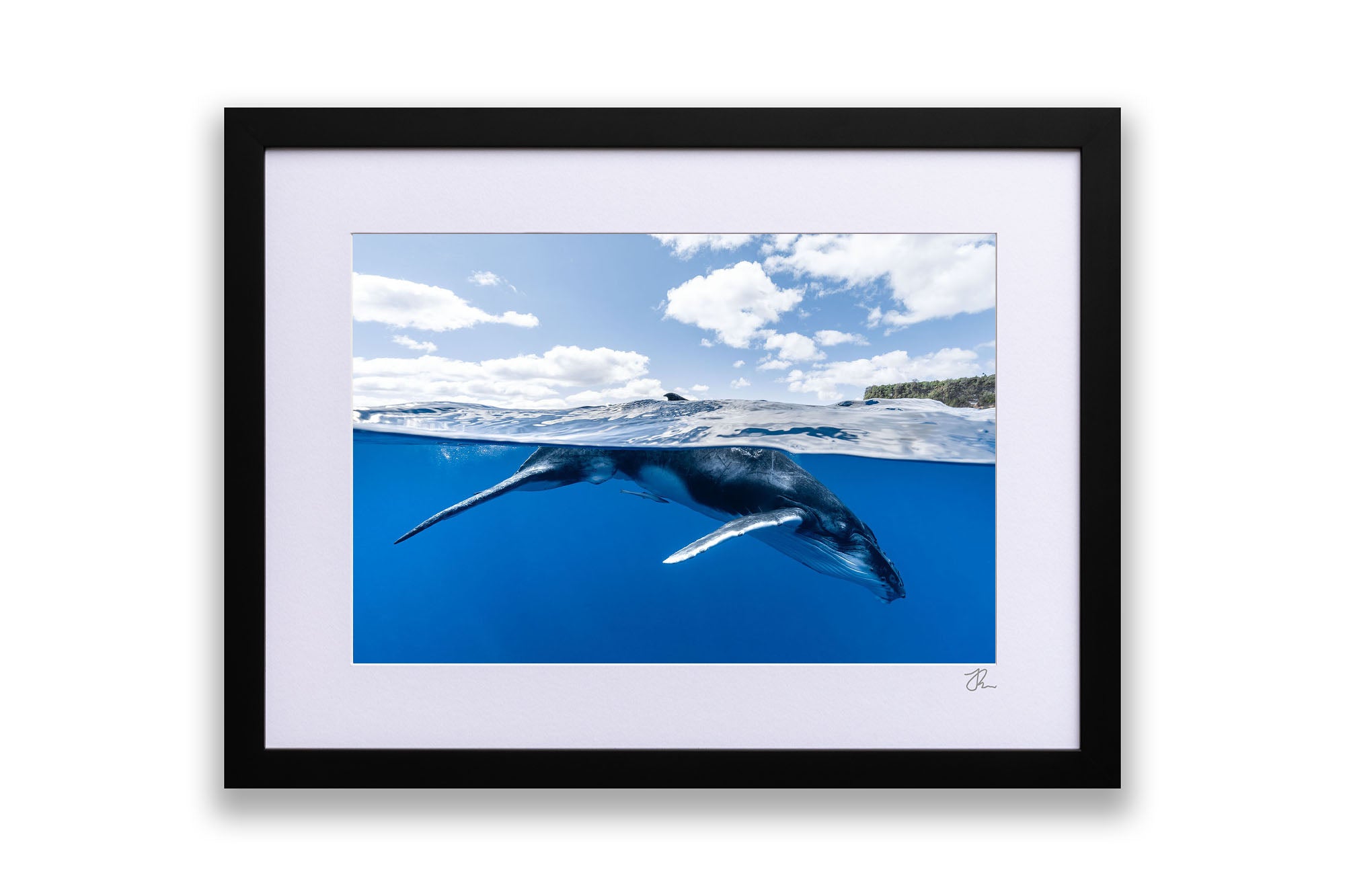 Photo print of an over under image of a Humpback Whale calf resting in the calm and clear waters of Vava'u, Tonga.