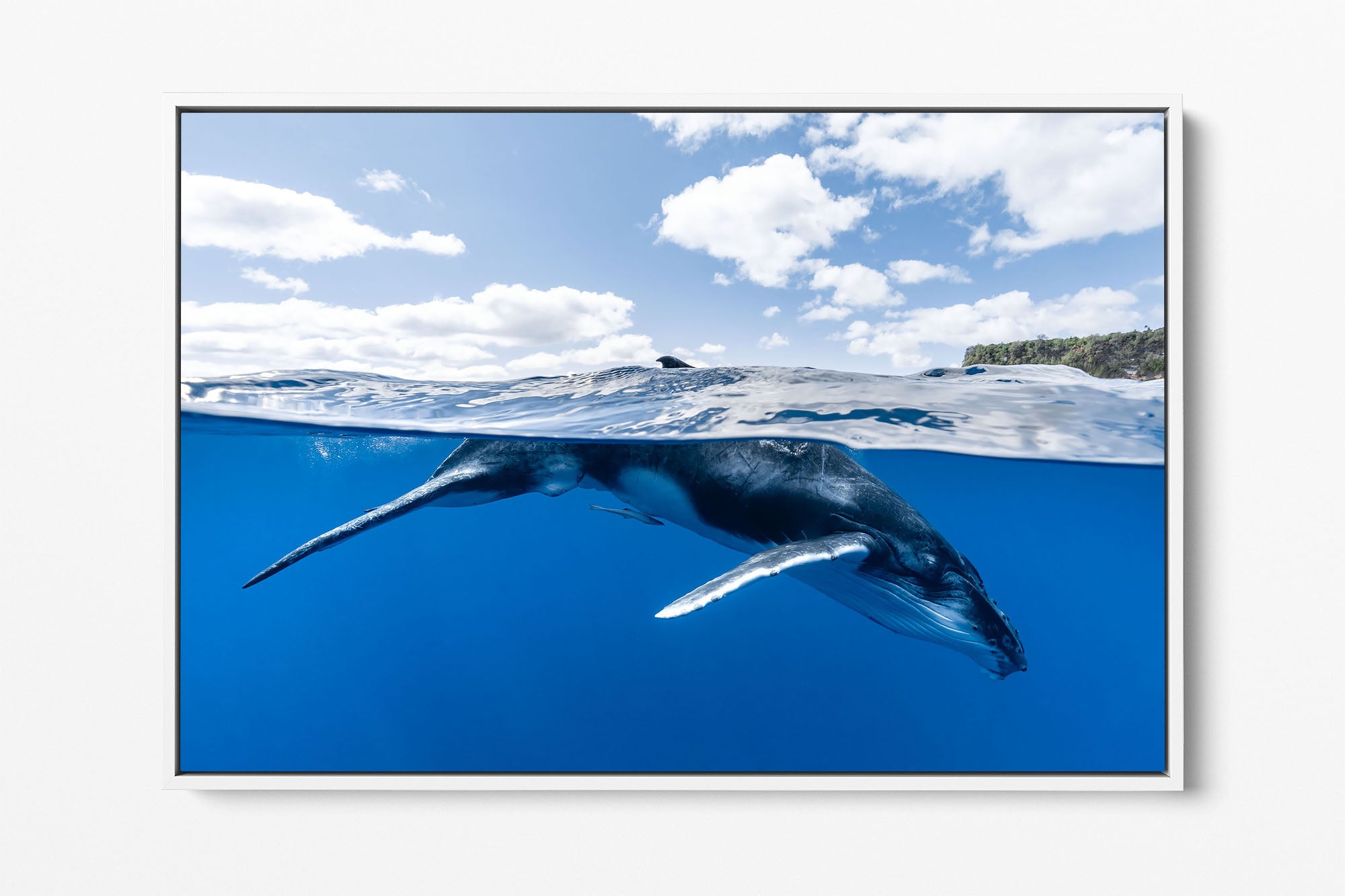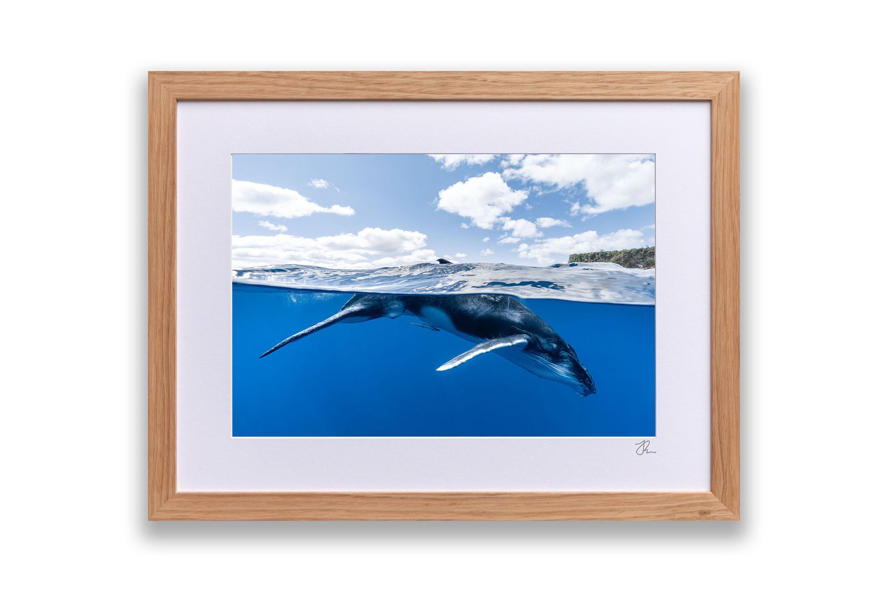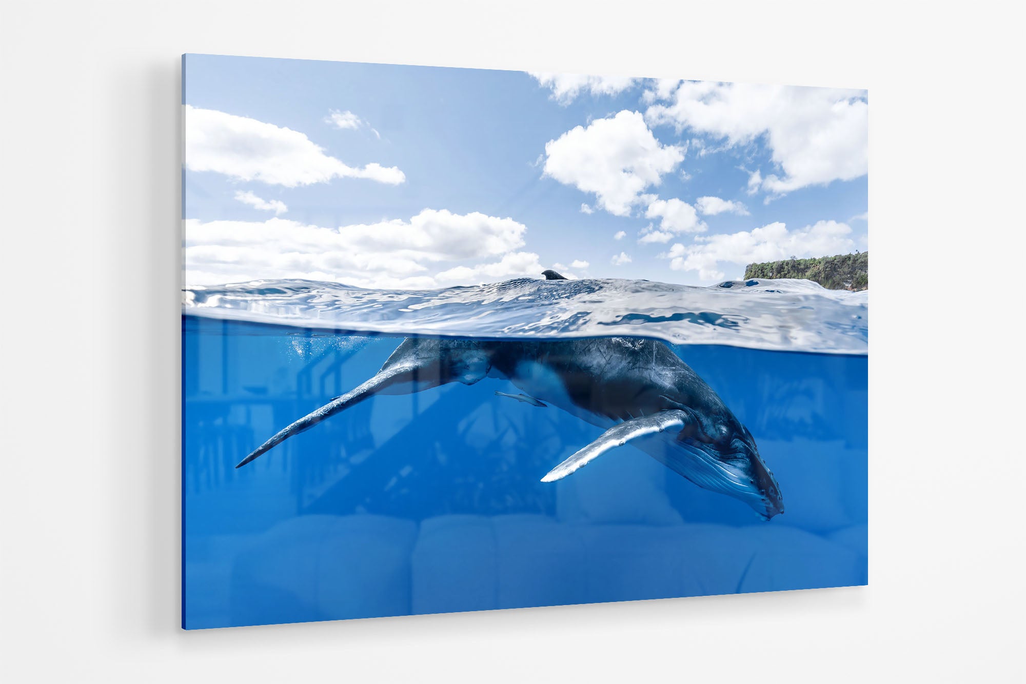 Photo print of an over under image of a Humpback Whale calf resting in the calm and clear waters of Vava'u, Tonga.