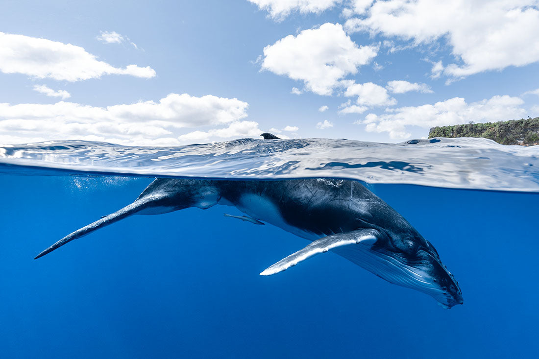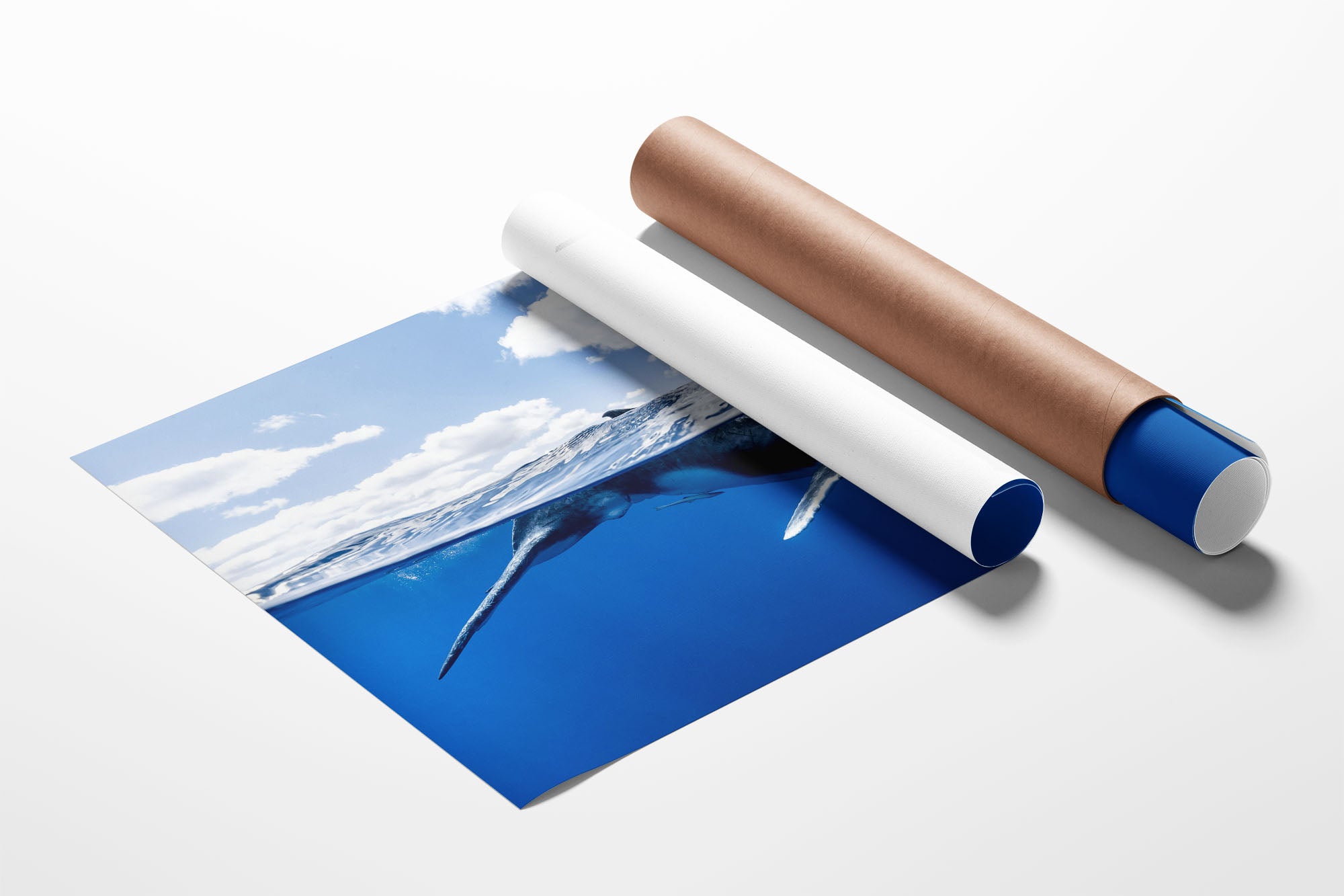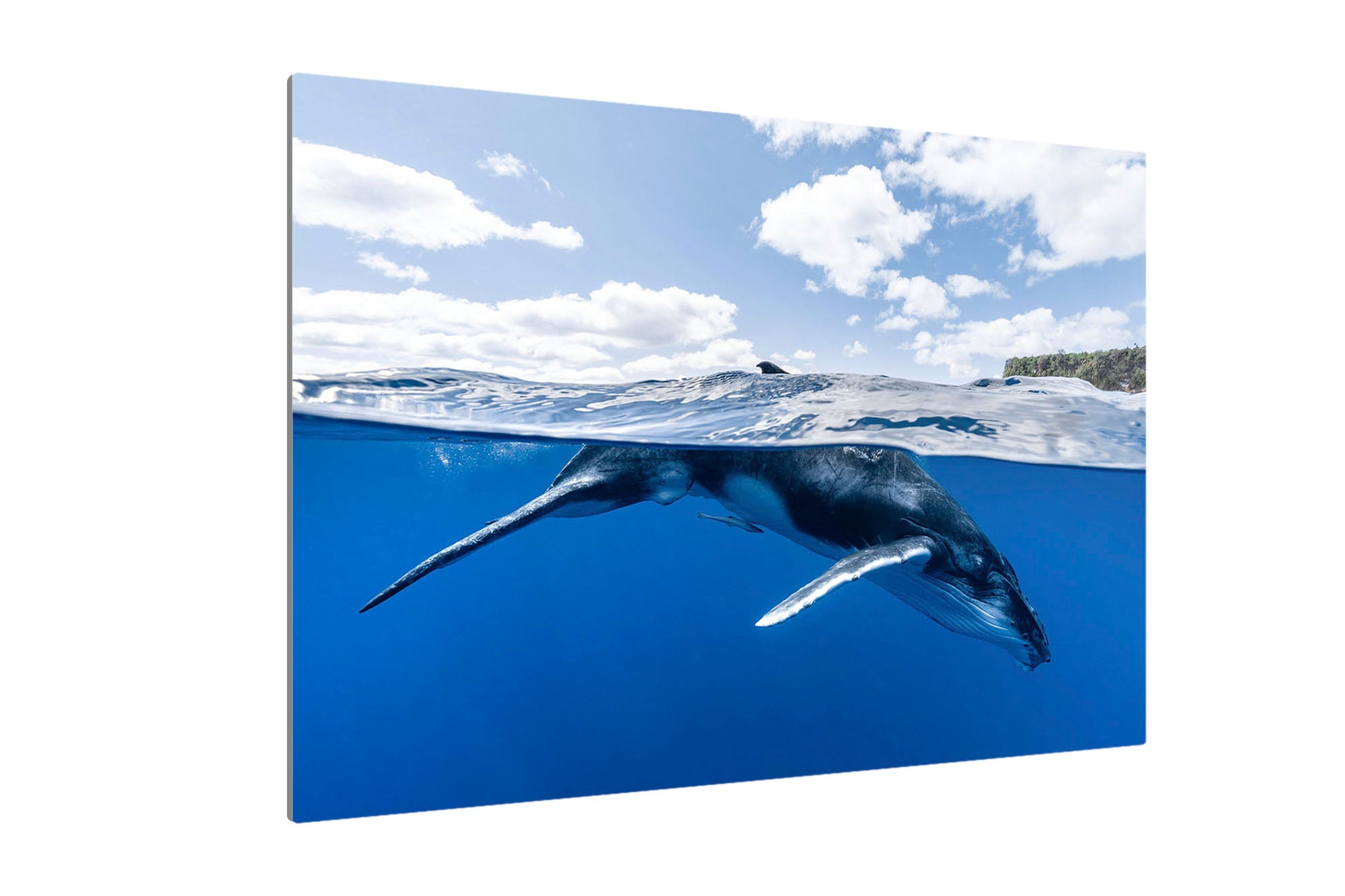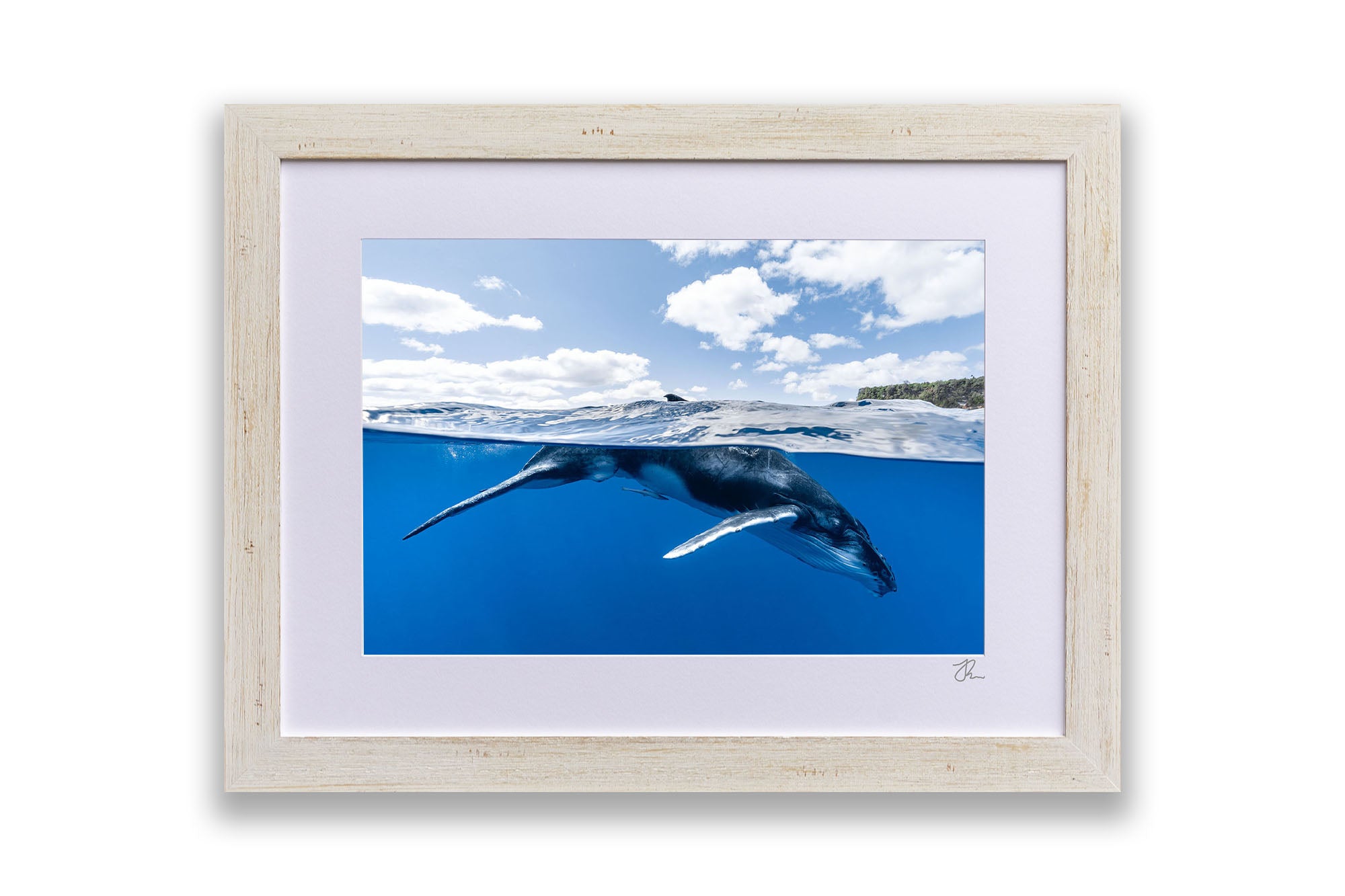 Photo print of an over under image of a Humpback Whale calf resting in the calm and clear waters of Vava'u, Tonga.