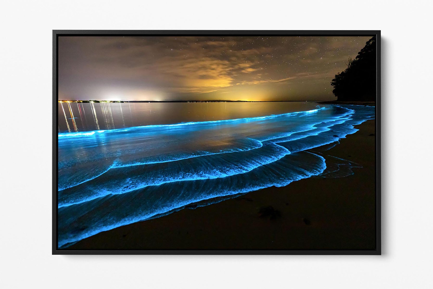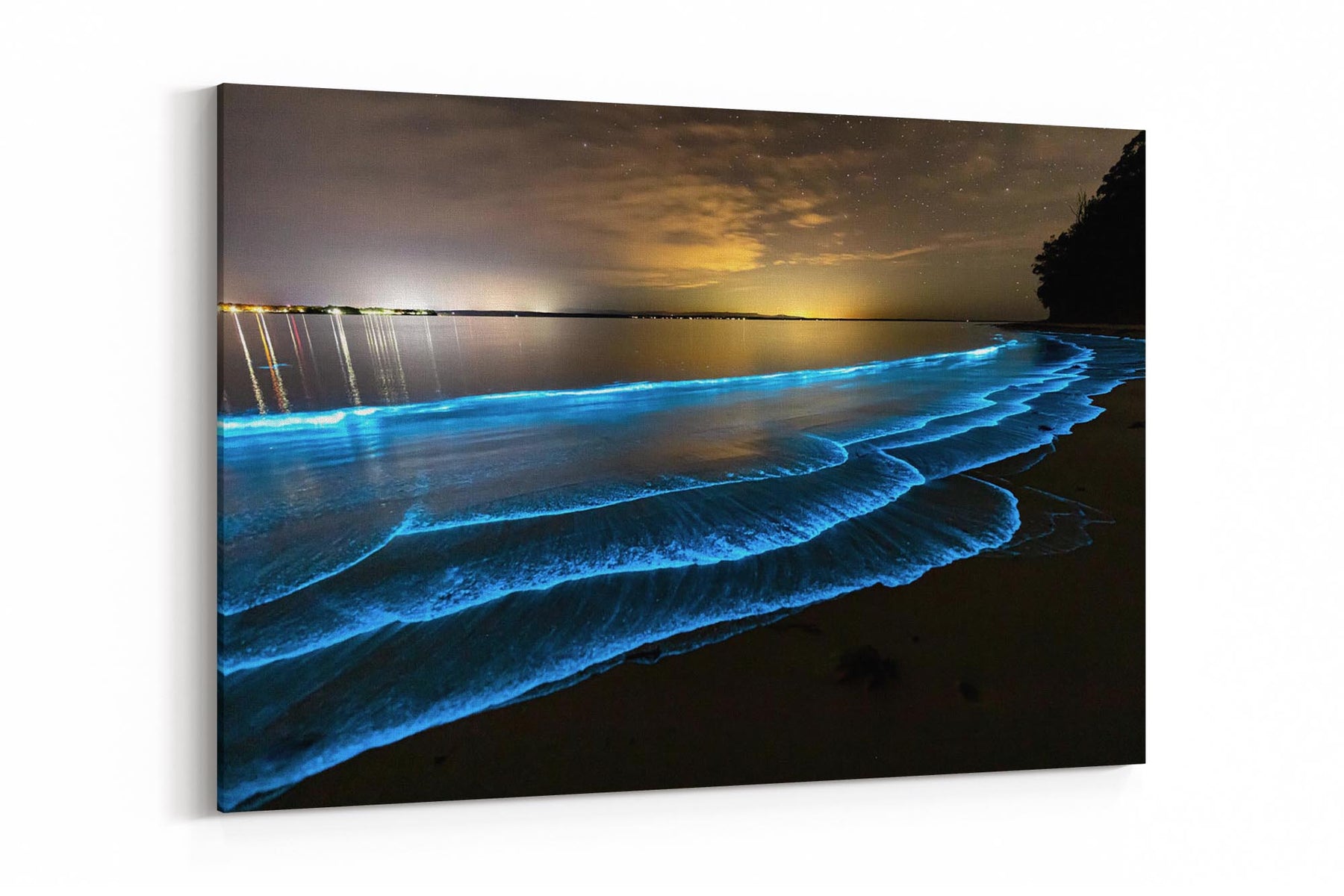 Witness the magical glow of bioluminescence lighting up the shoreline of Barfleur Beach in Jervis Bay, Australia. Under a star-filled sky, the beach transforms into a bright blue wonderland, creating a breathtaking sight. This natural phenomenon is caused by Noctiluca scintillans, a bioluminescent microalgae that emits a vivid blue glow when disturbed by waves or wind.