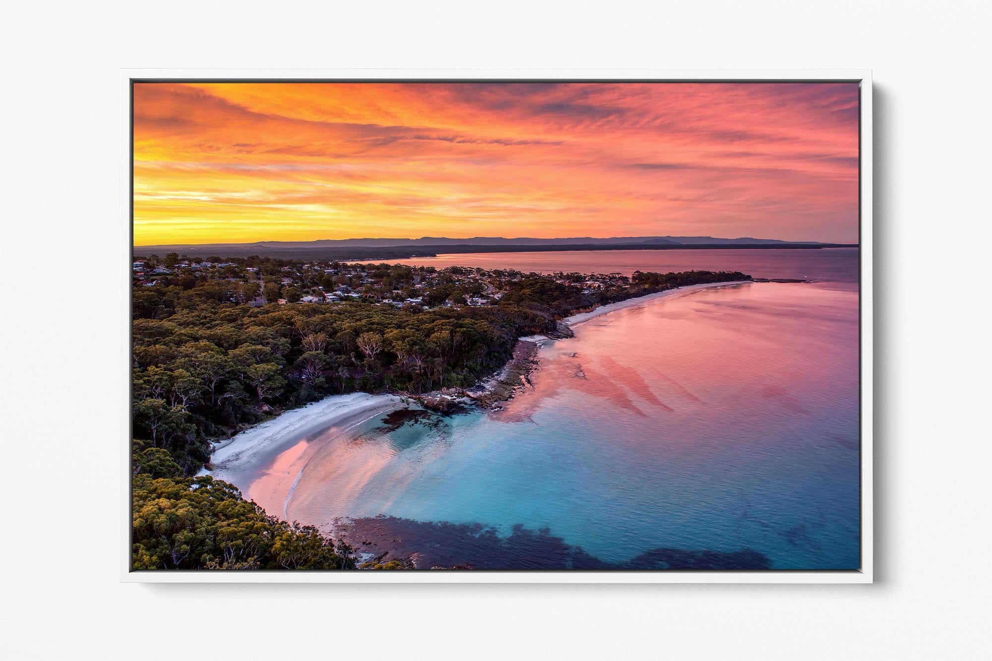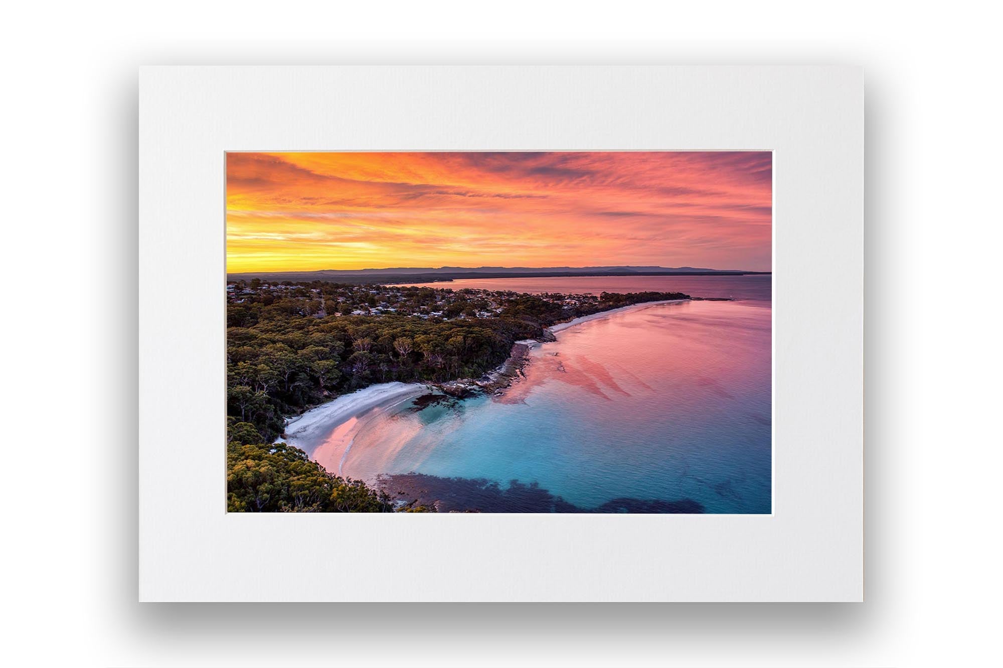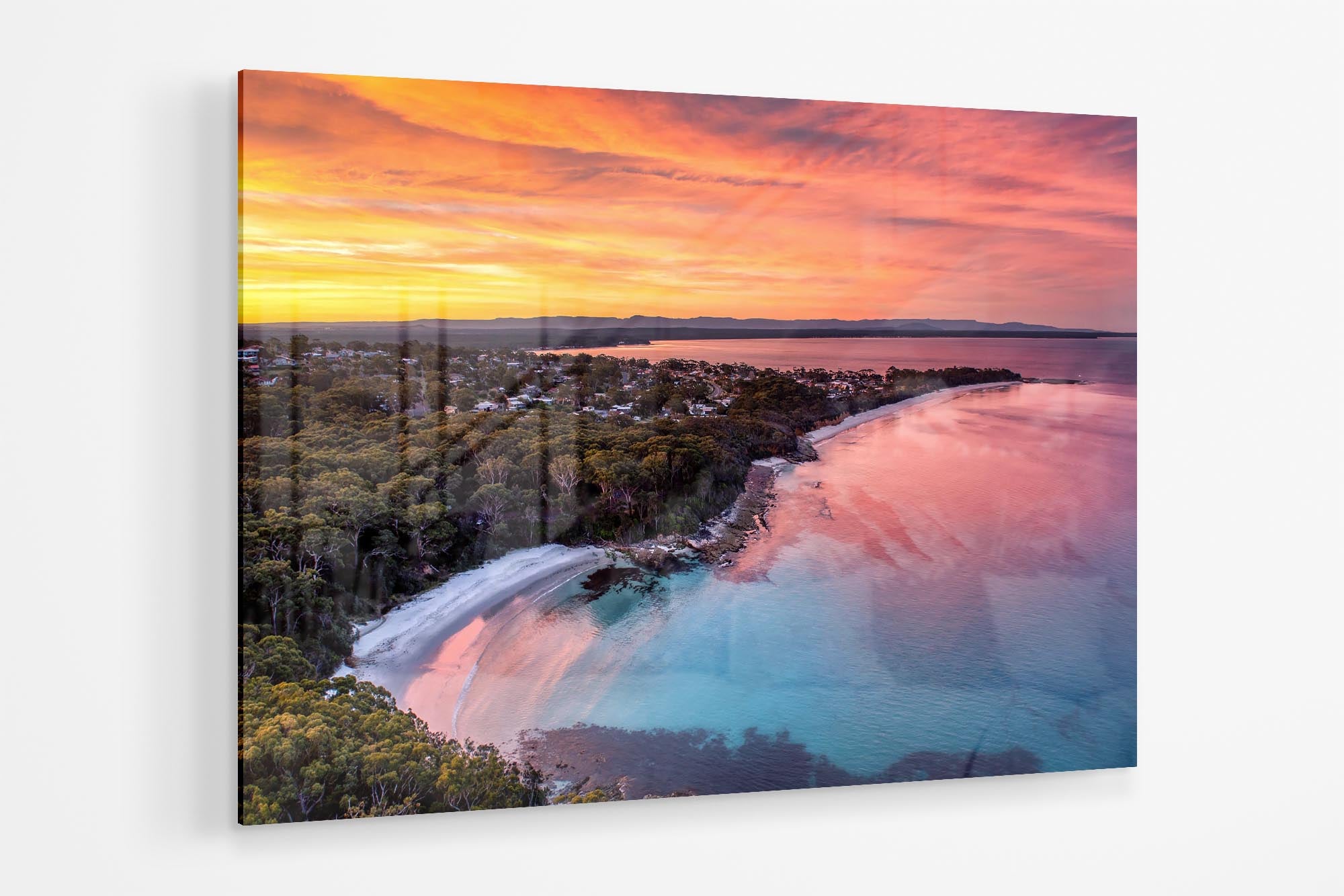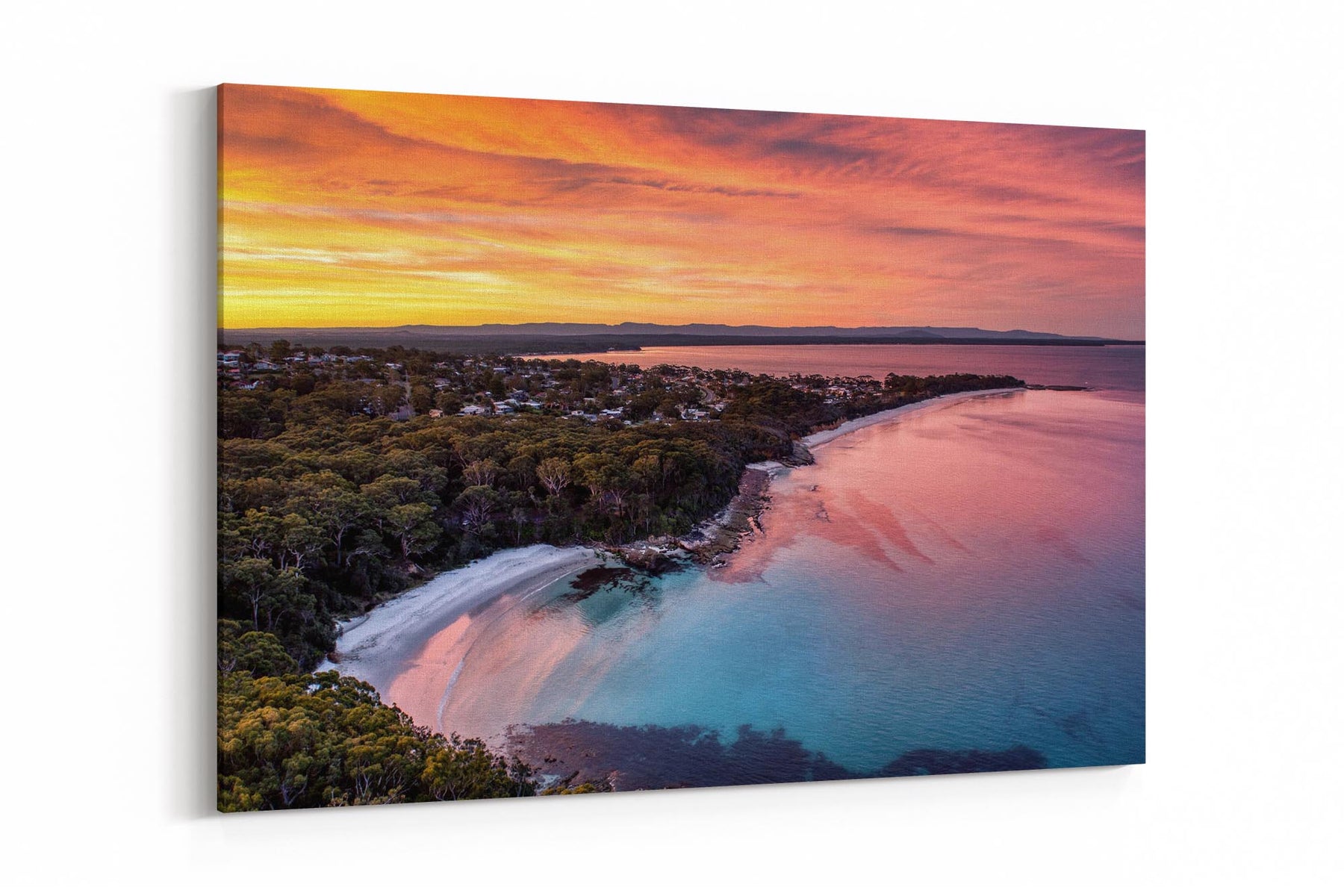 Photo print of an aerial view of a vivid sunset over Blenheim Beach, Jervis Bay.