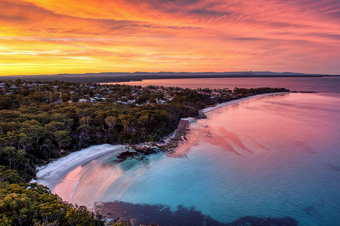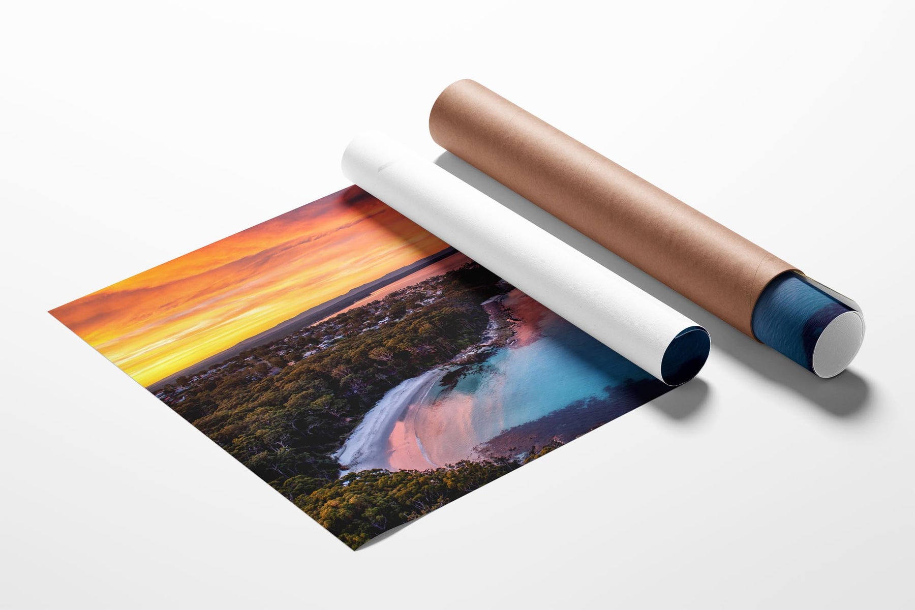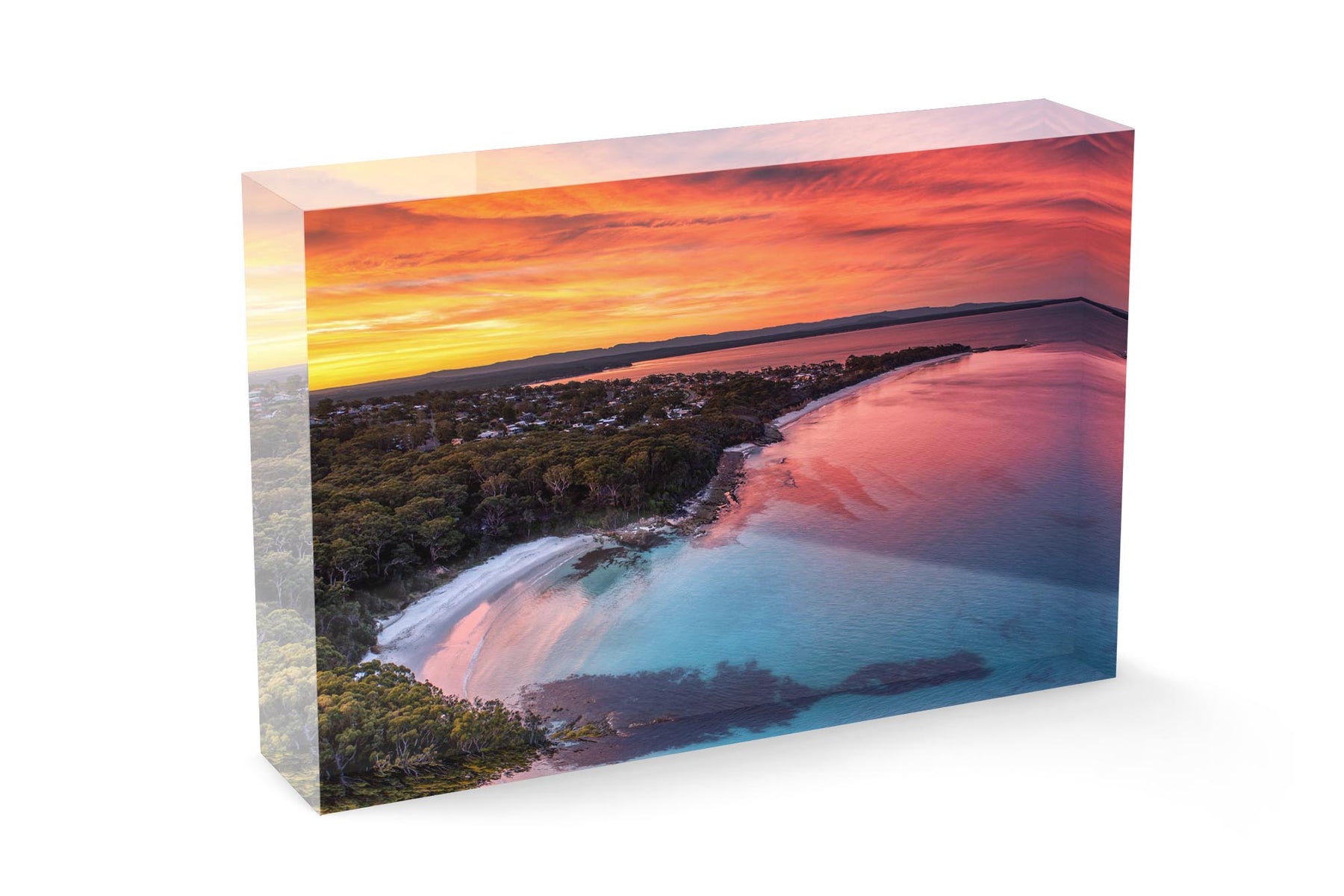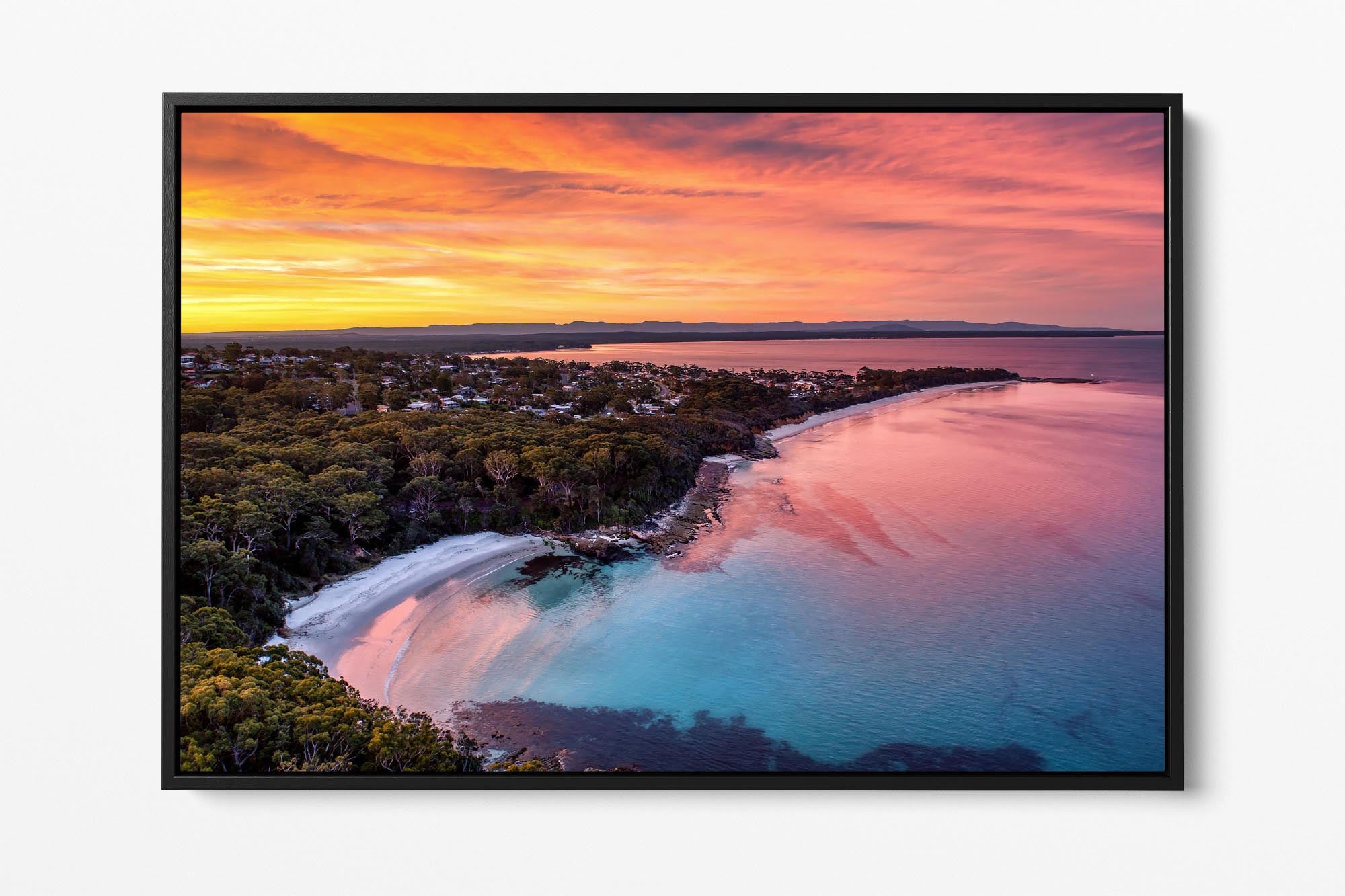 Photo print of an aerial view of a vivid sunset over Blenheim Beach, Jervis Bay.