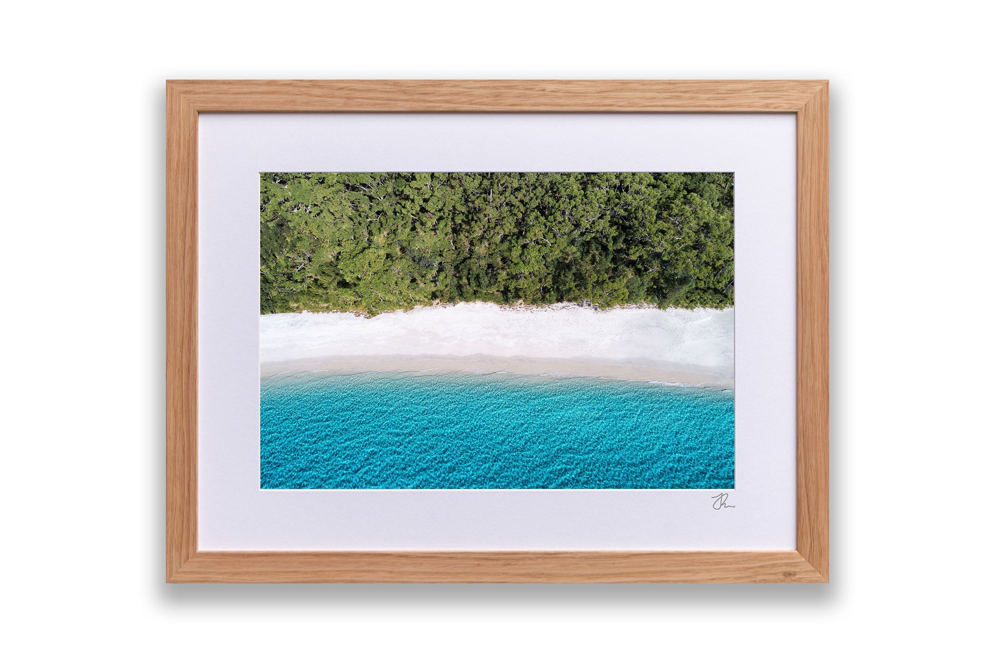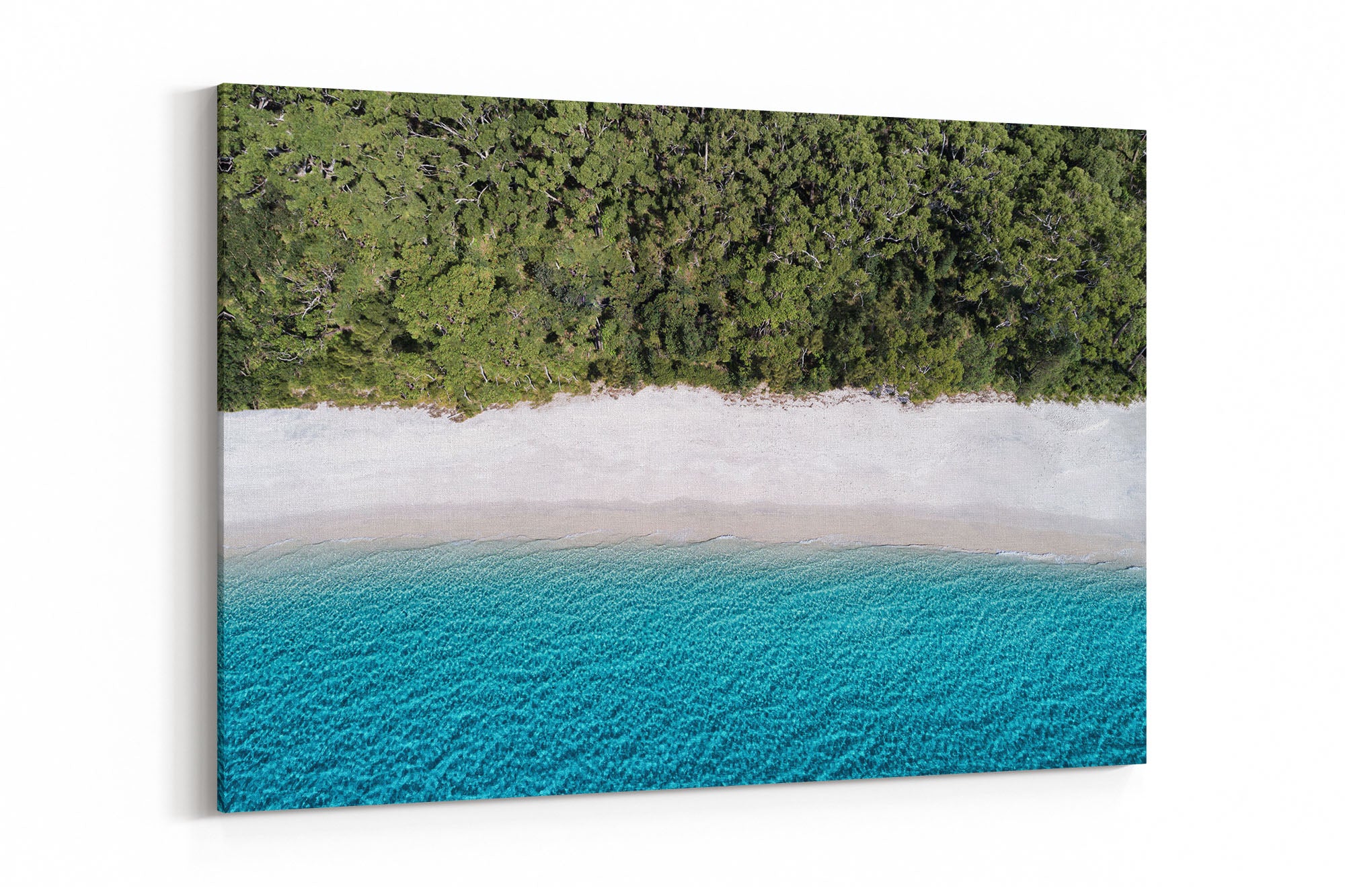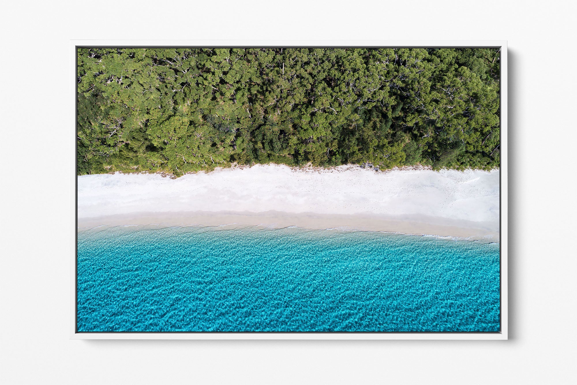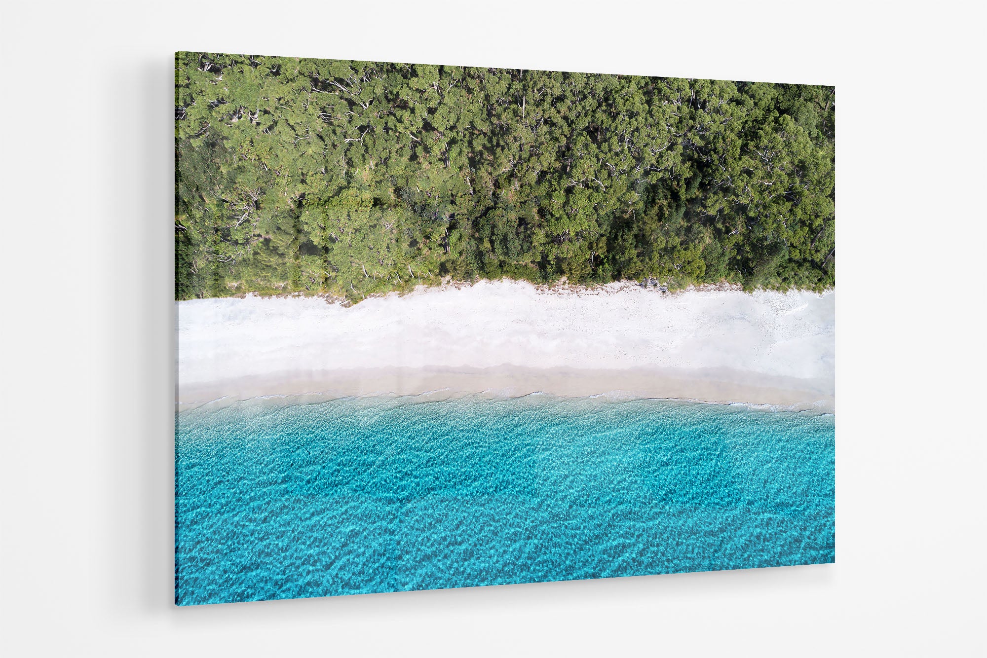 Experience nature's perfect harmony with this captivating aerial print, showcasing Hare Bay's dazzling white sands and crystal-clear waters merging with untouched Australian bushland in picturesque Callala Bay.