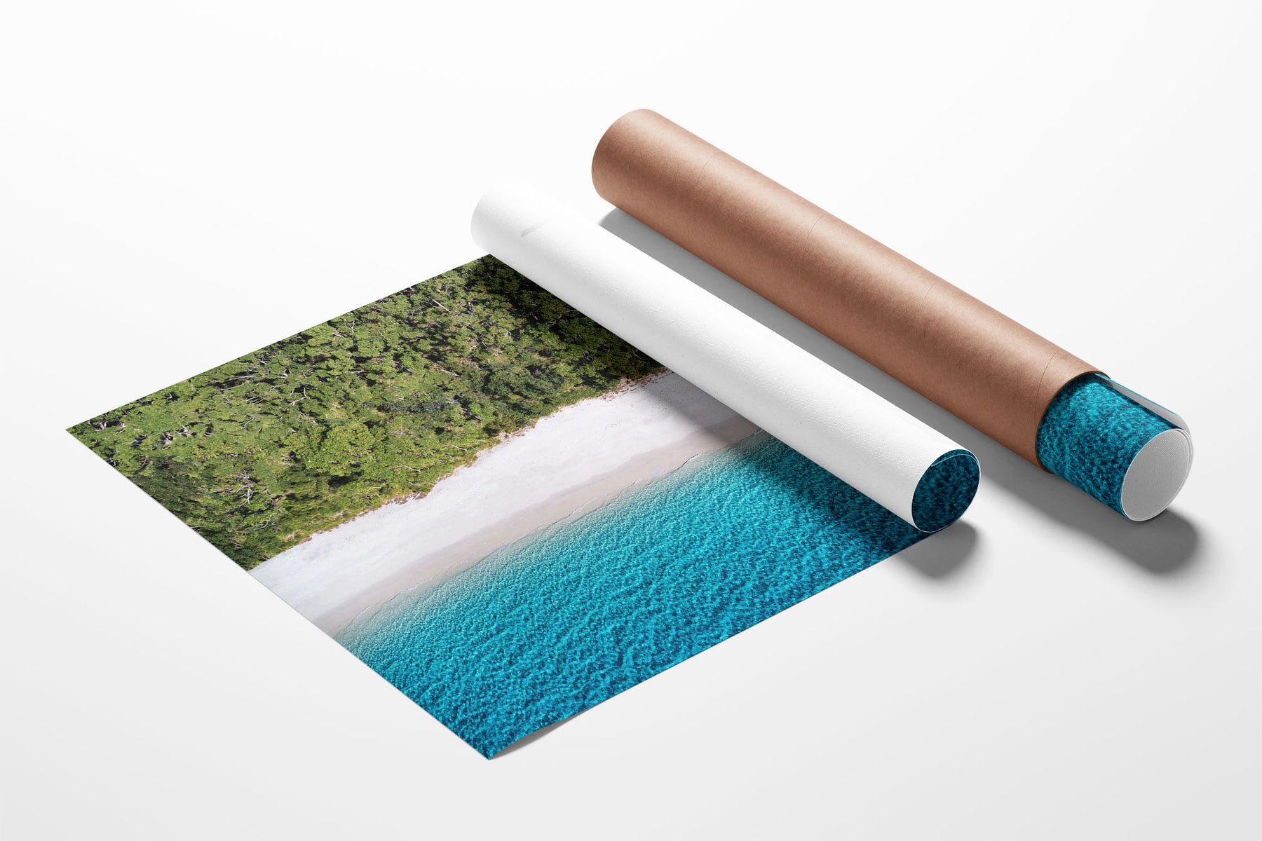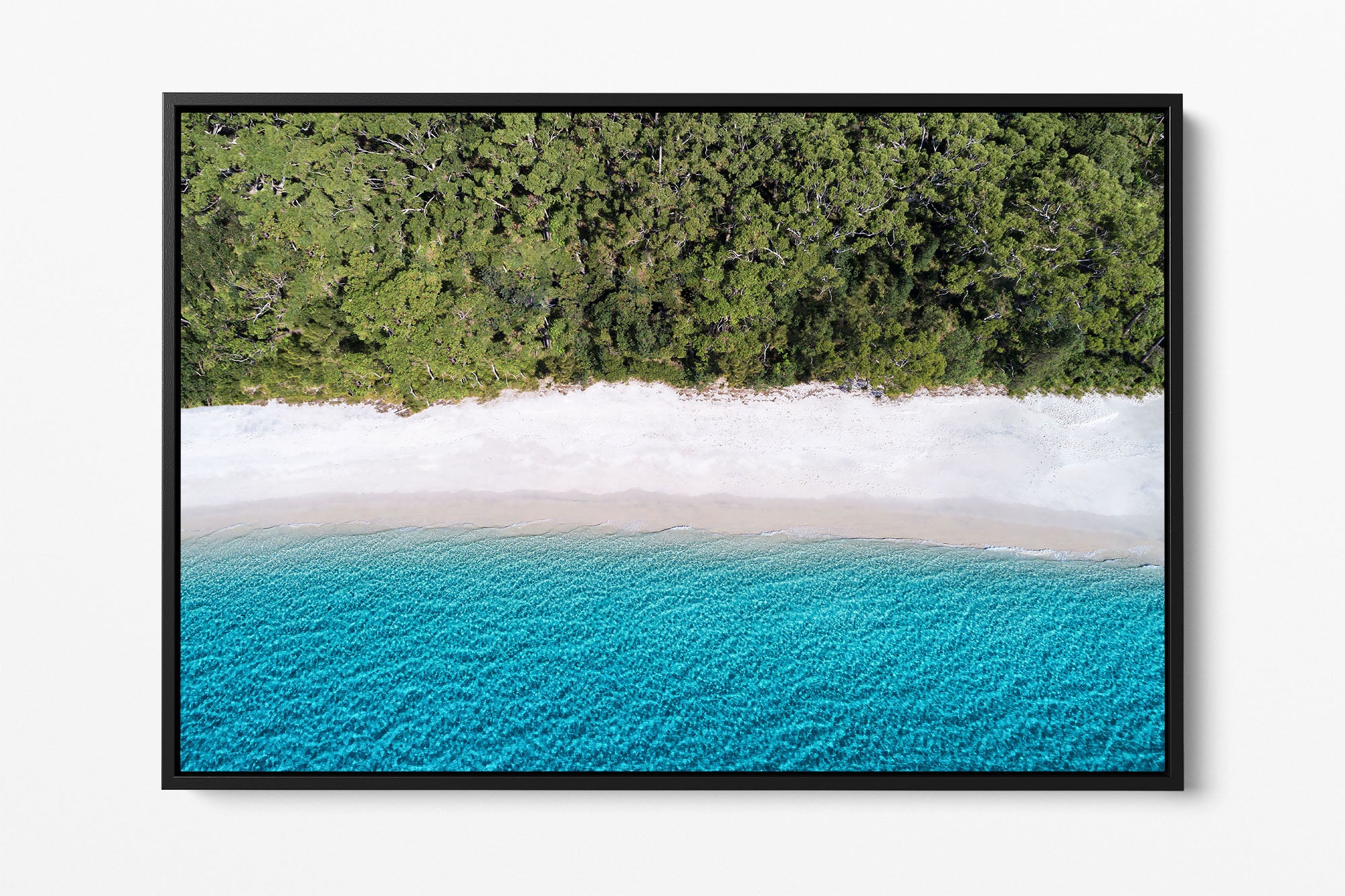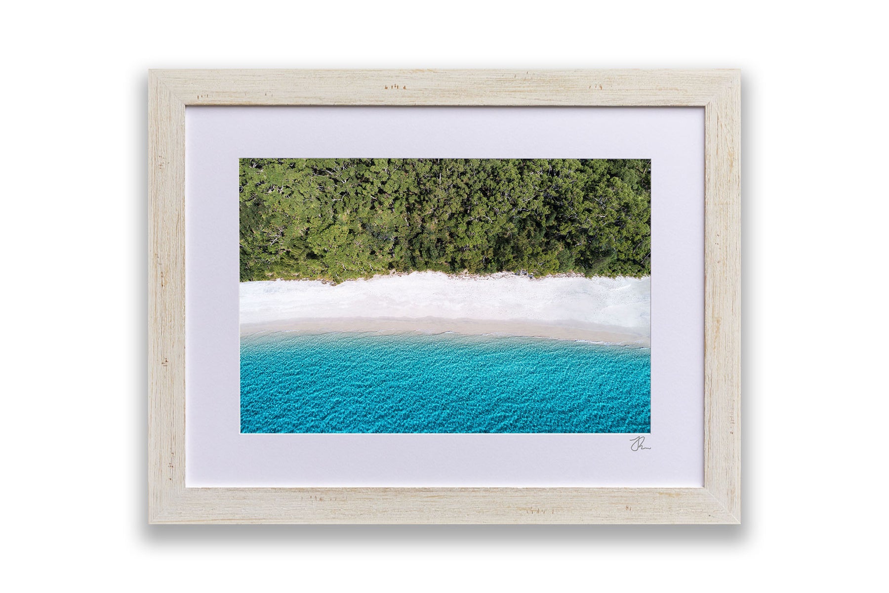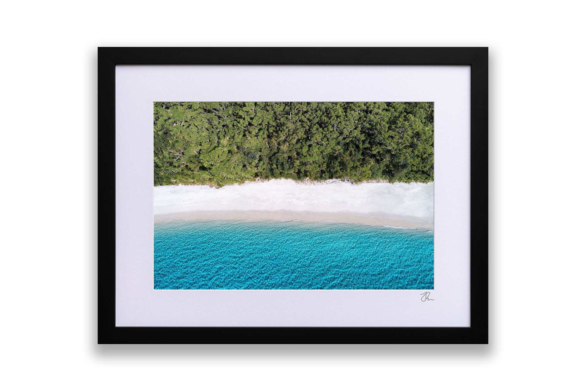 Experience nature's perfect harmony with this captivating aerial print, showcasing Hare Bay's dazzling white sands and crystal-clear waters merging with untouched Australian bushland in picturesque Callala Bay.