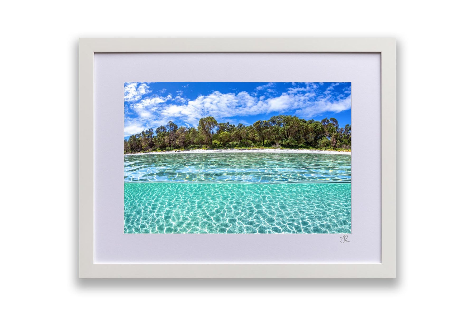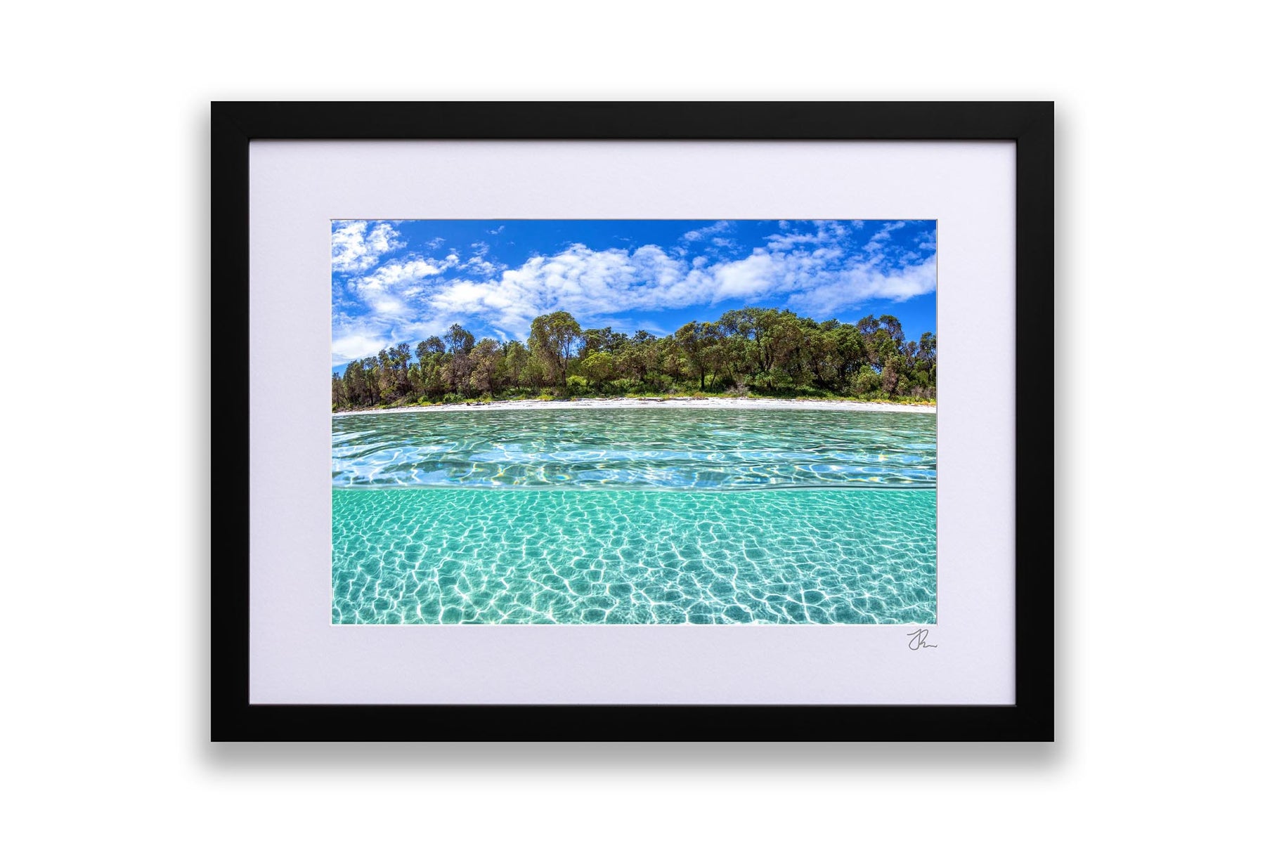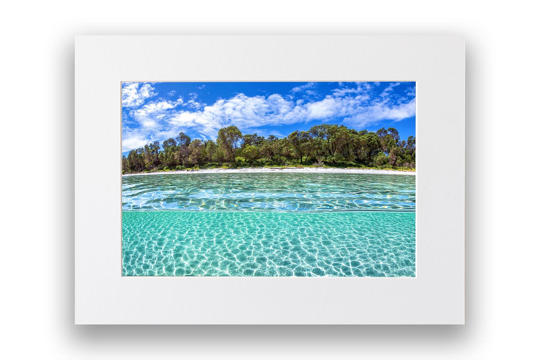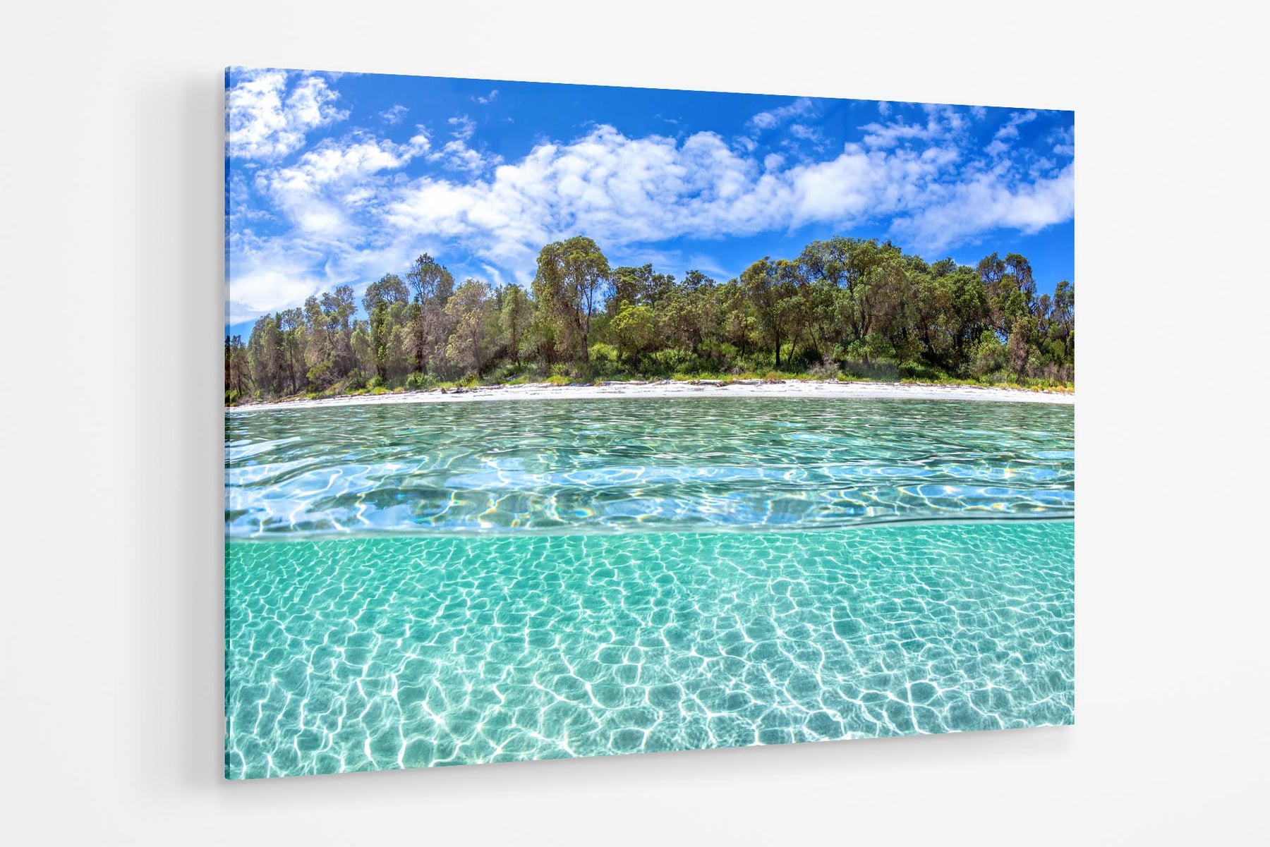 Photo print of an over under image captured in crystal clear water at Callala Bay, oneĀ of the many stunning beaches in Jervis Bay where the bush meets bright white sand and crystal clear water.