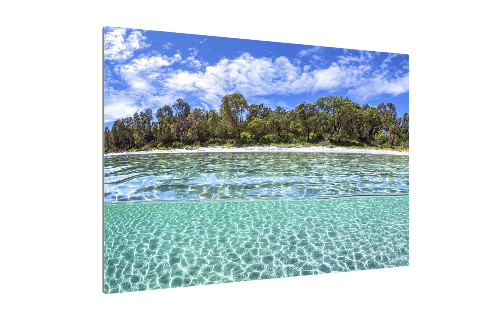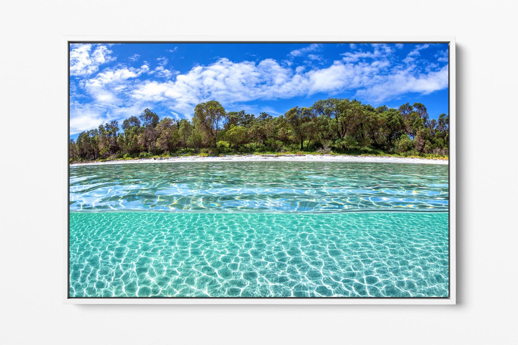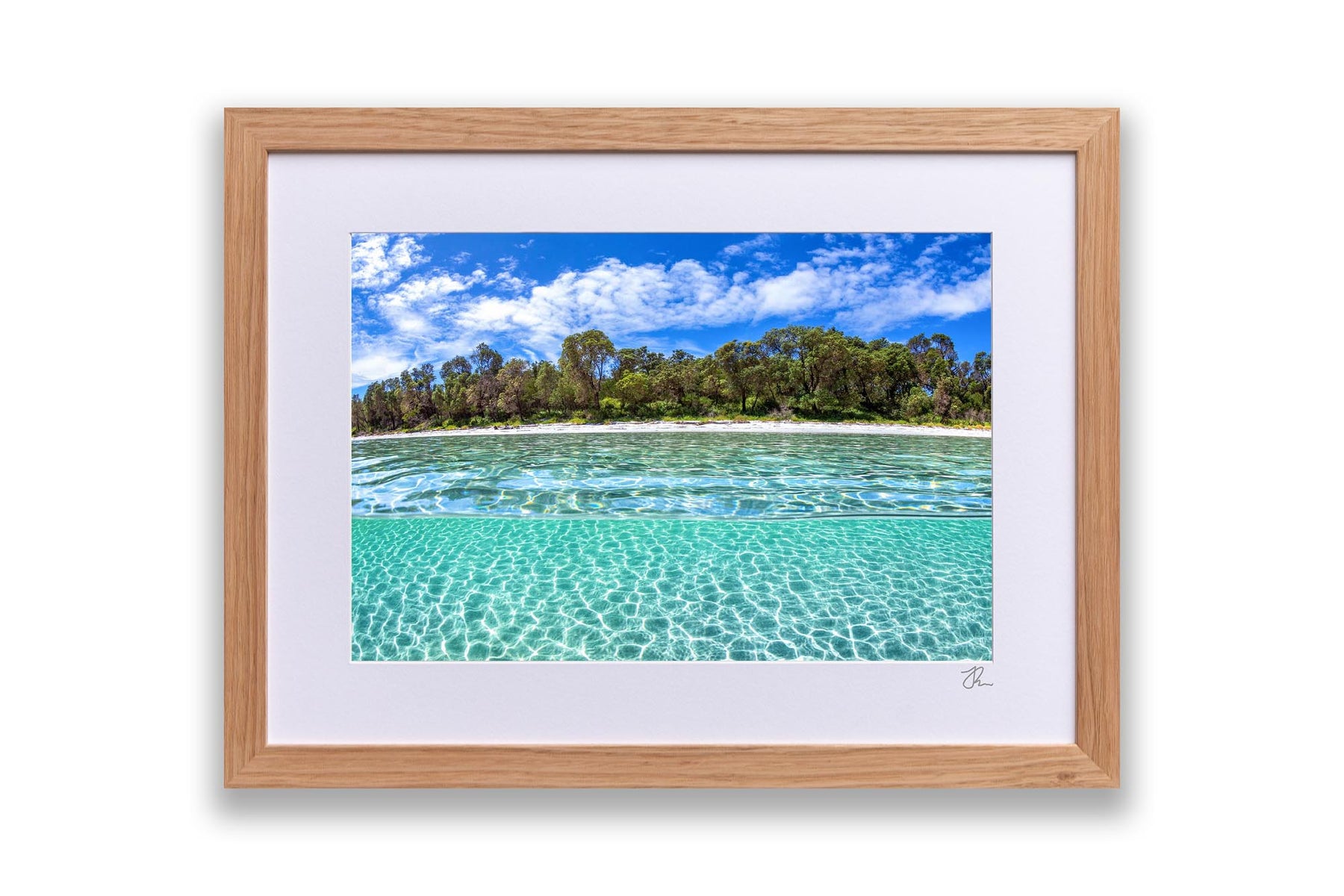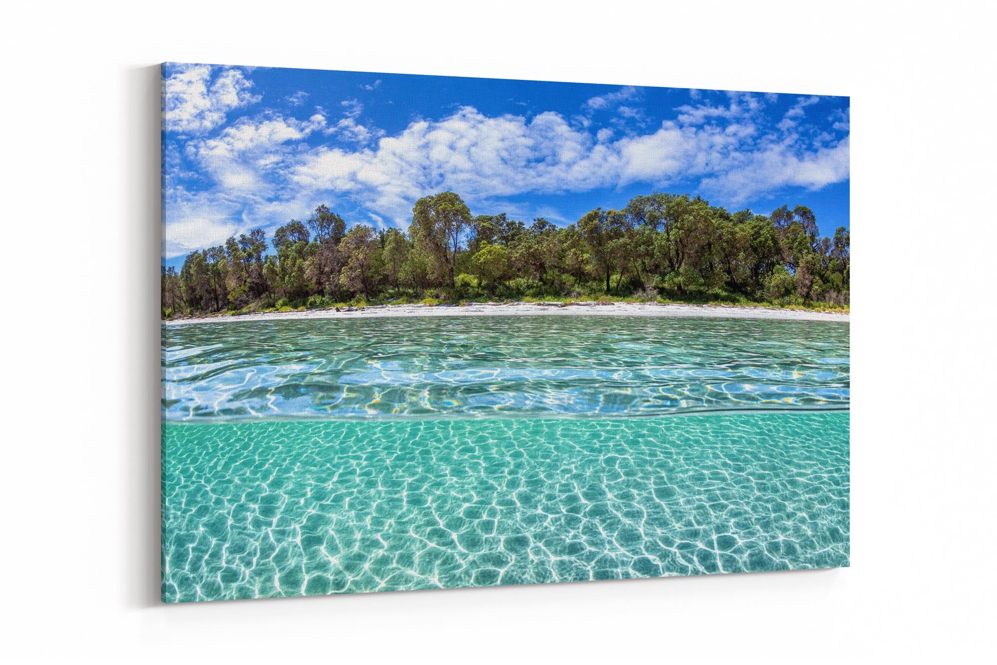 Photo print of an over under image captured in crystal clear water at Callala Bay, oneĀ of the many stunning beaches in Jervis Bay where the bush meets bright white sand and crystal clear water.