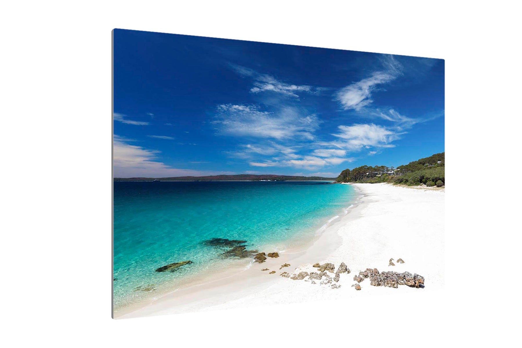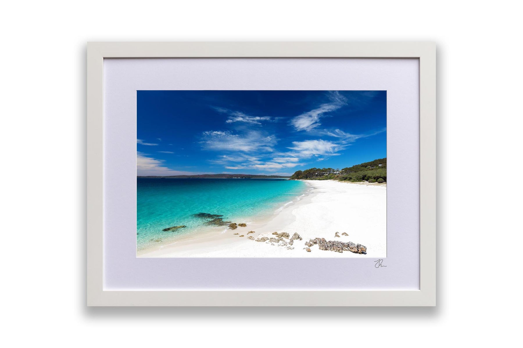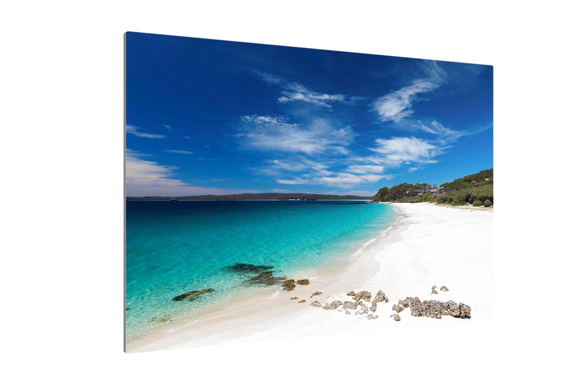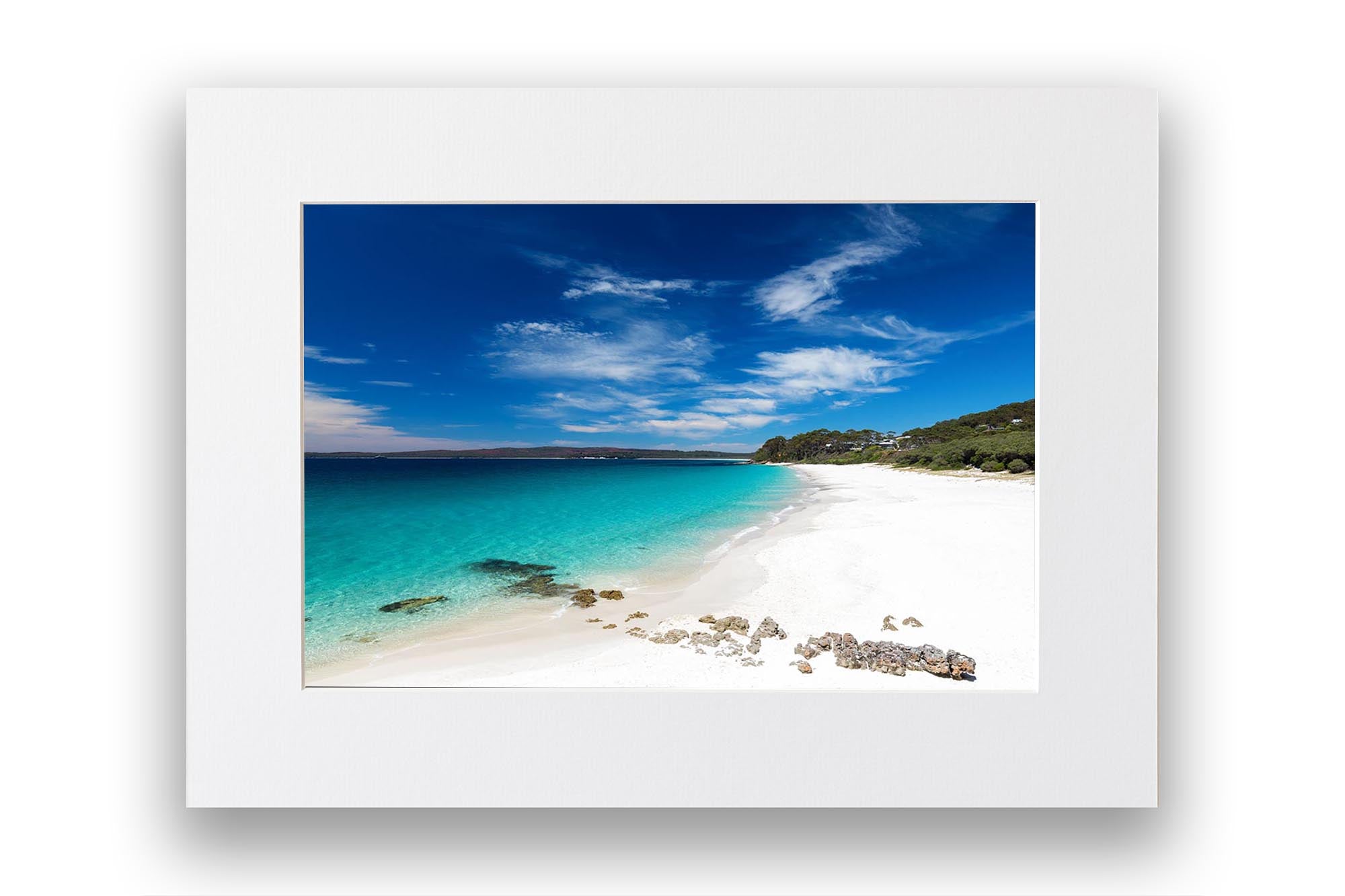 Photo print of the bright white sand and crystal clear water at Chinamans Beach, Jervis Bay. Looking south towards Hyams Beach, the beach with the whitest sand in the world!