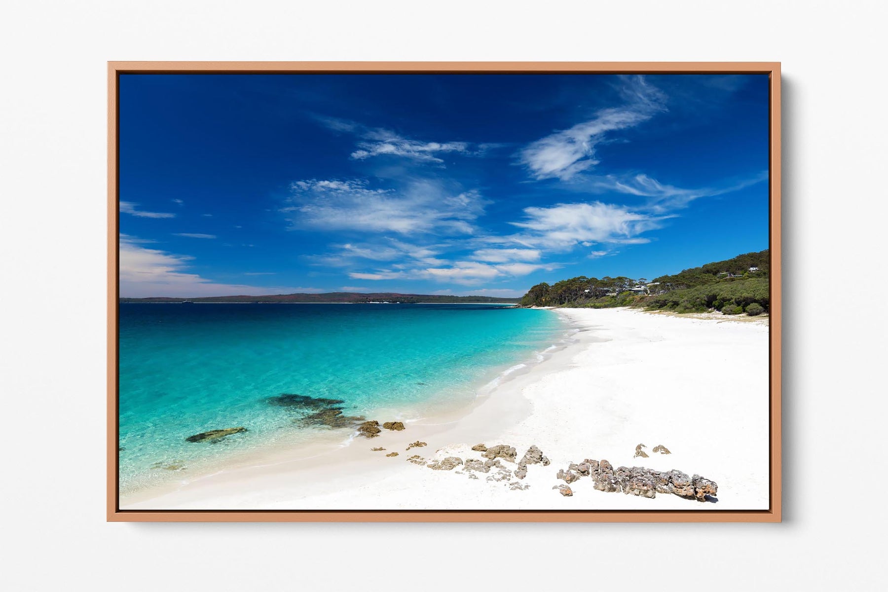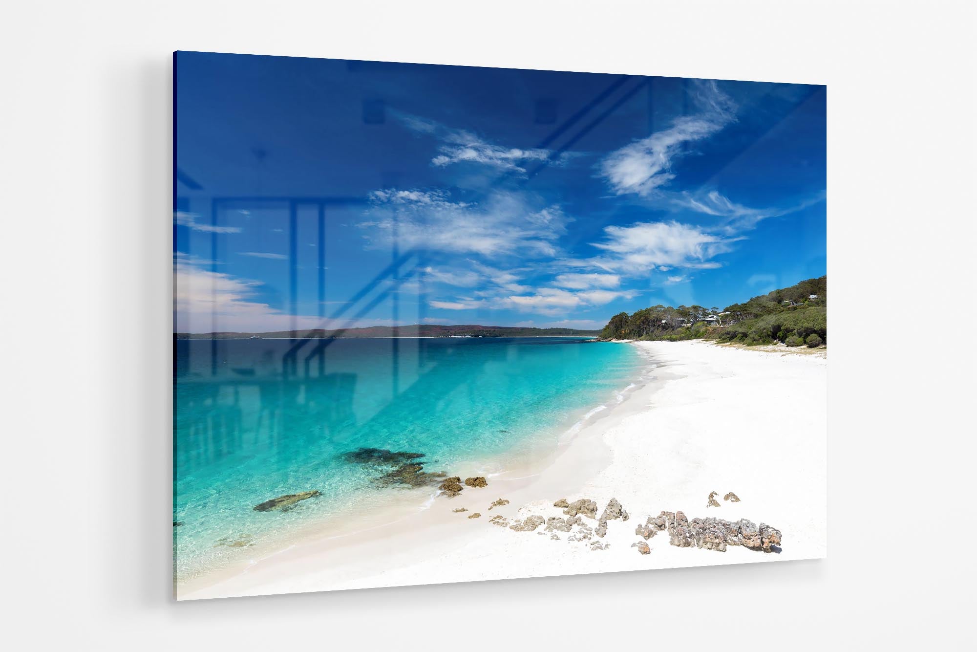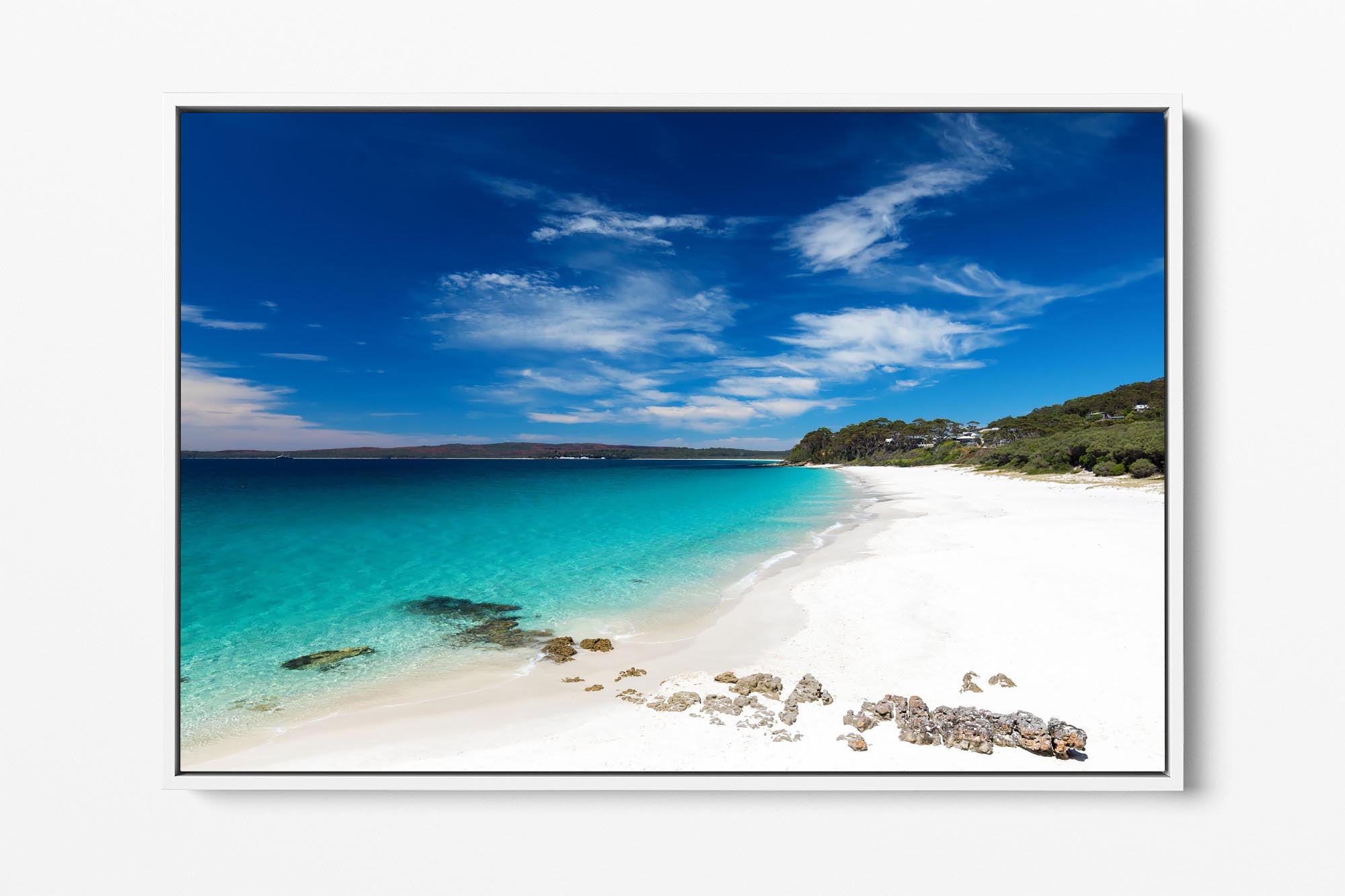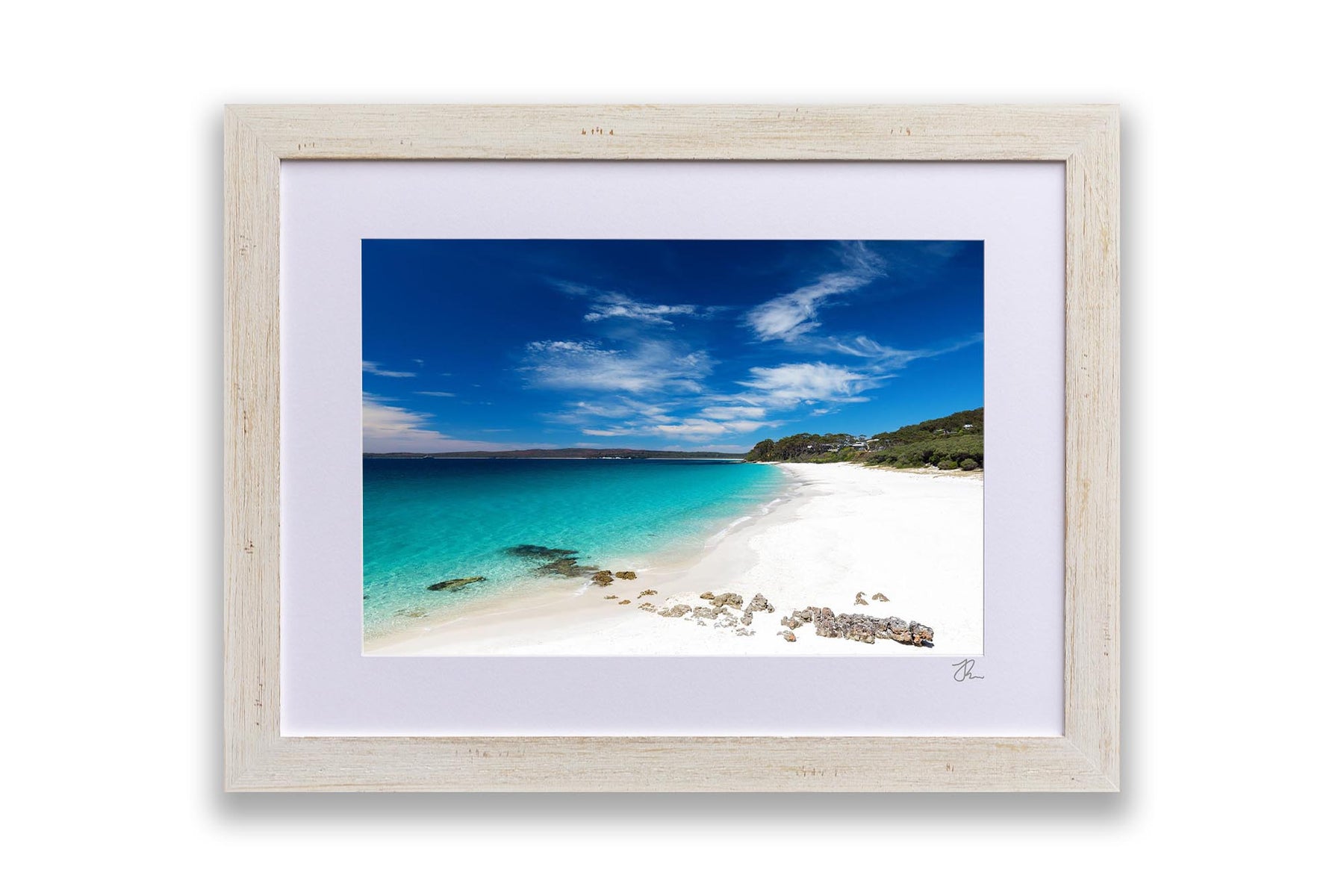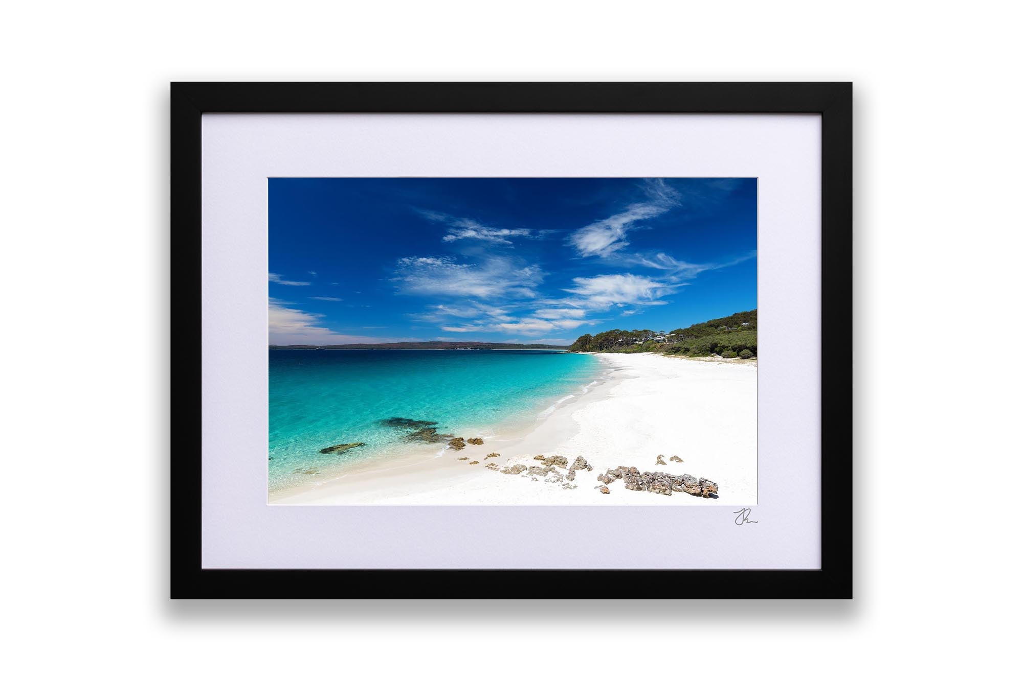 Photo print of the bright white sand and crystal clear water at Chinamans Beach, Jervis Bay. Looking south towards Hyams Beach, the beach with the whitest sand in the world!